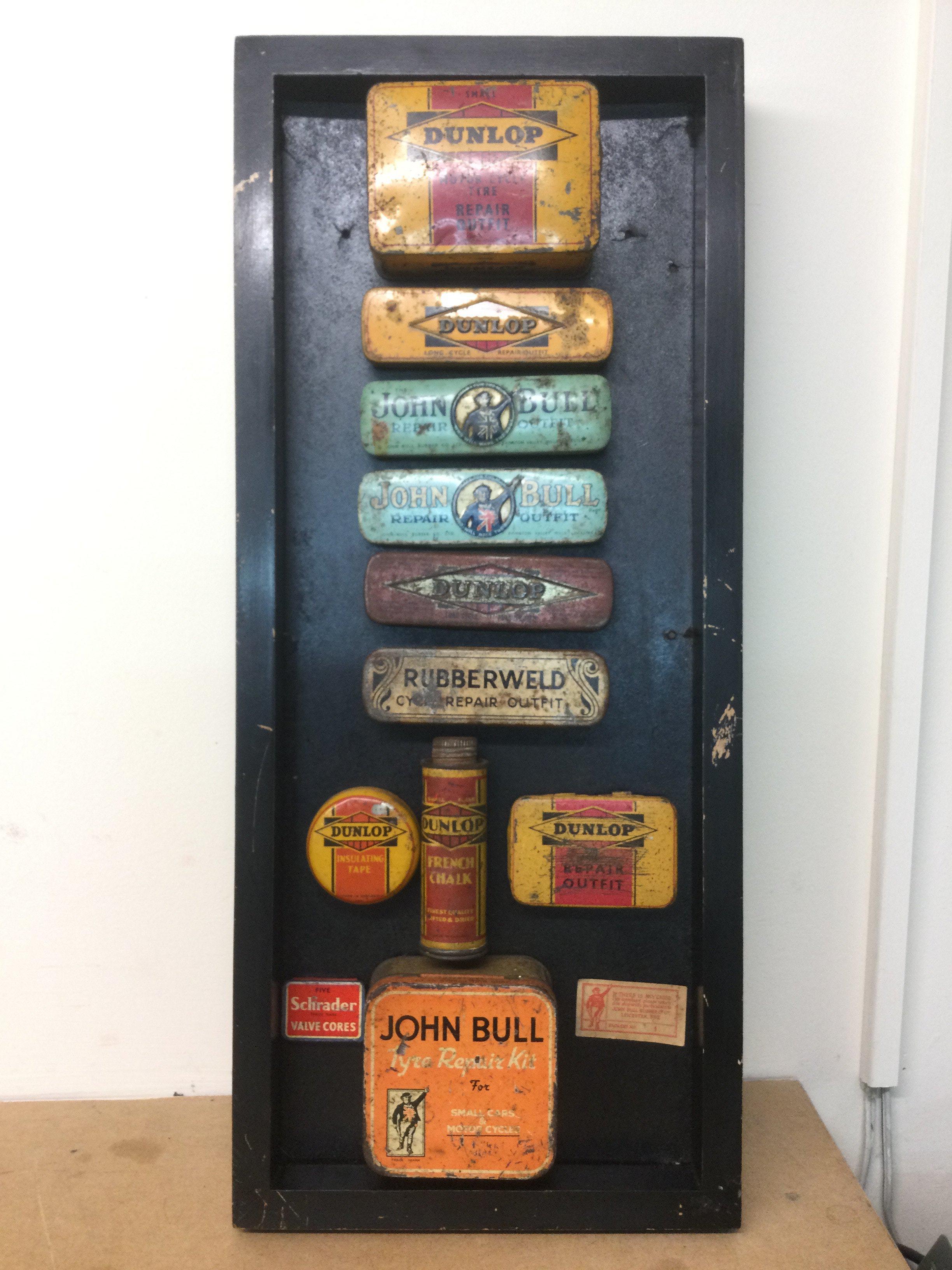 A mounted display of twelve vintage puncture repair kits. Shipping category C.