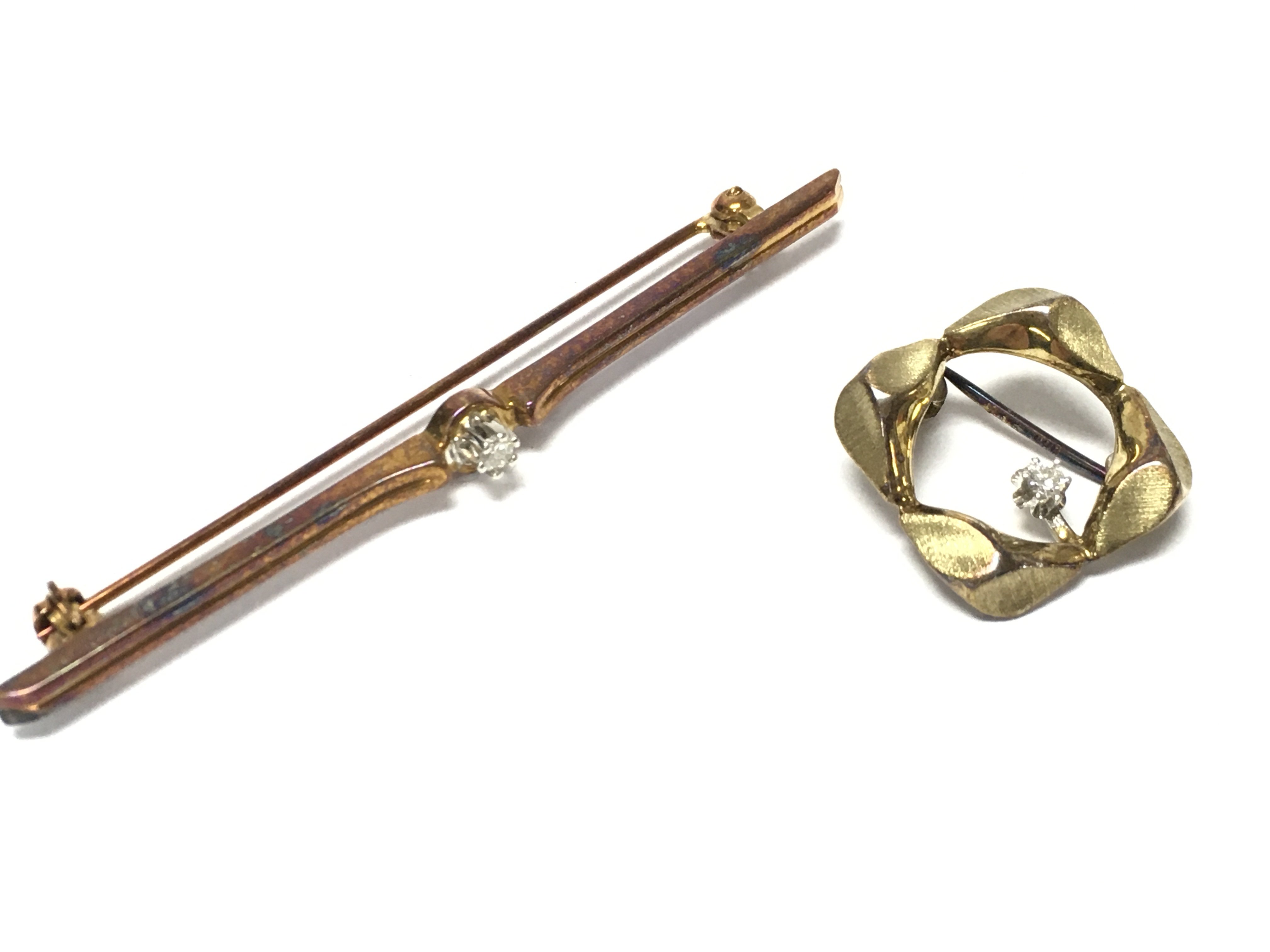 Two gold brooches, set with small diamonds , 5.5g total weight. Postage category A