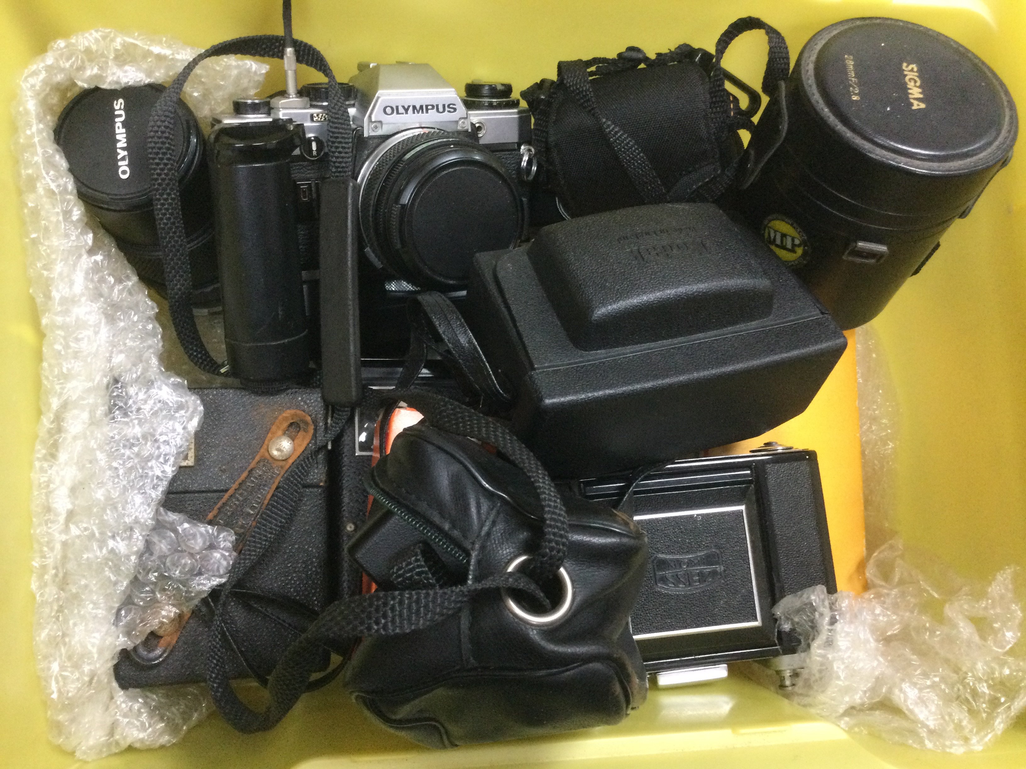 A box of camera equipment comprising an Olympus OM10, Zeiss Ikon etc. Shipping category D.