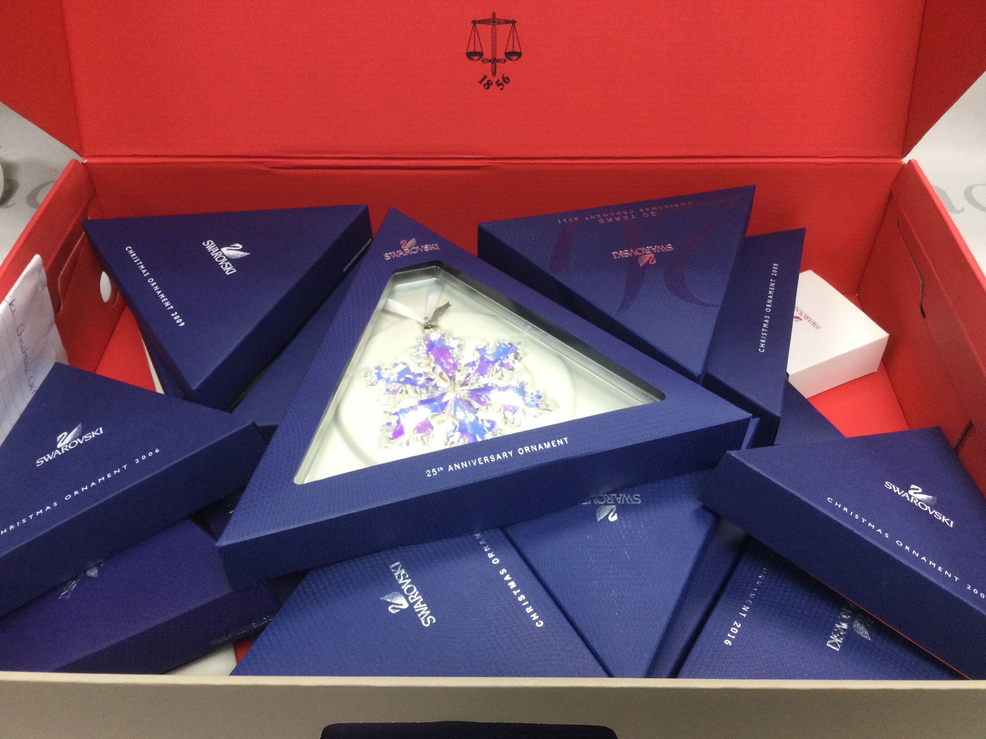 A box of Swarovski Christmas decorations from 2001-2018, all boxed and in good condition. Shipping category D.