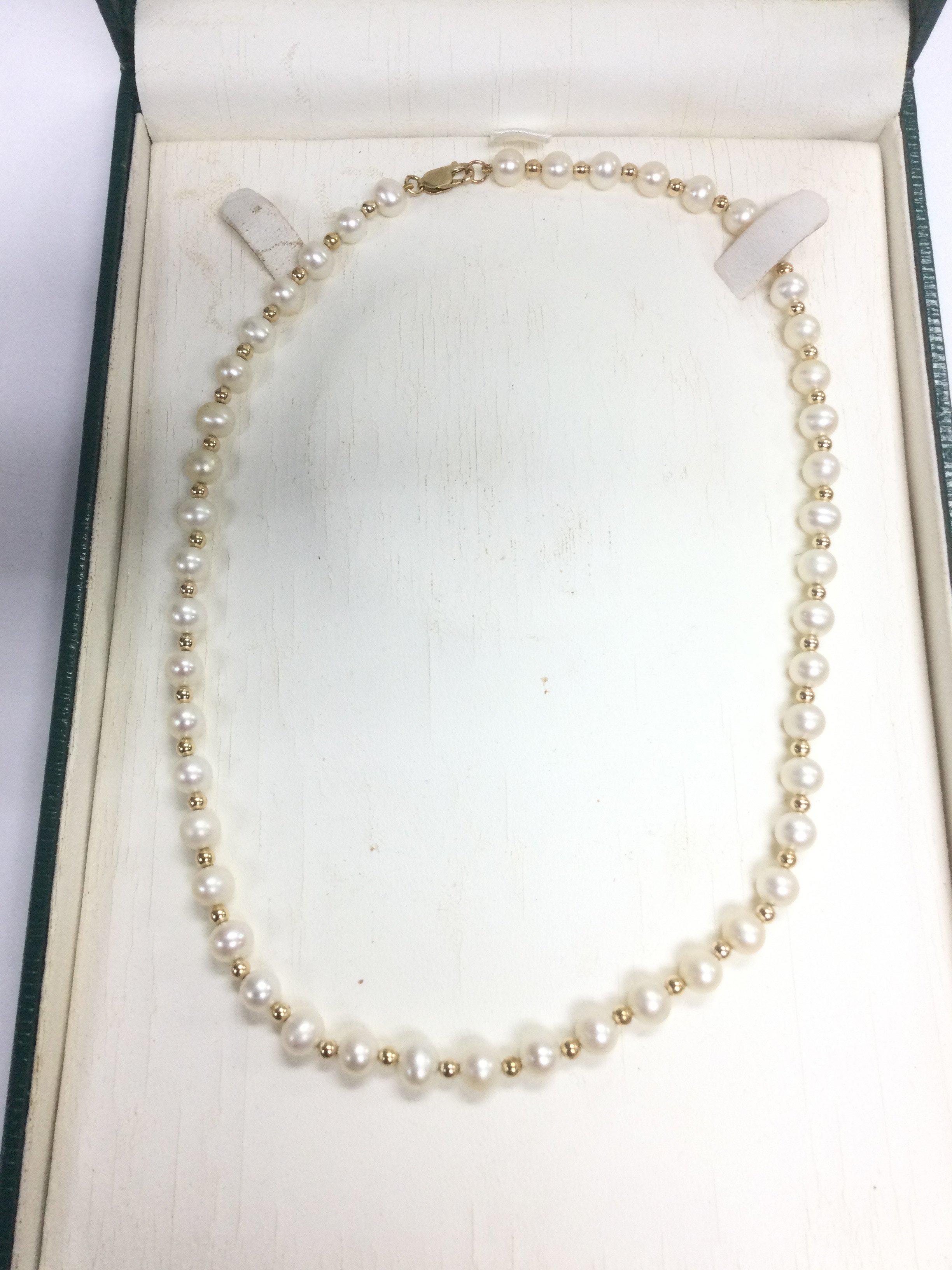 A pearl necklace interspersed with gold beads. Shipping category A.
