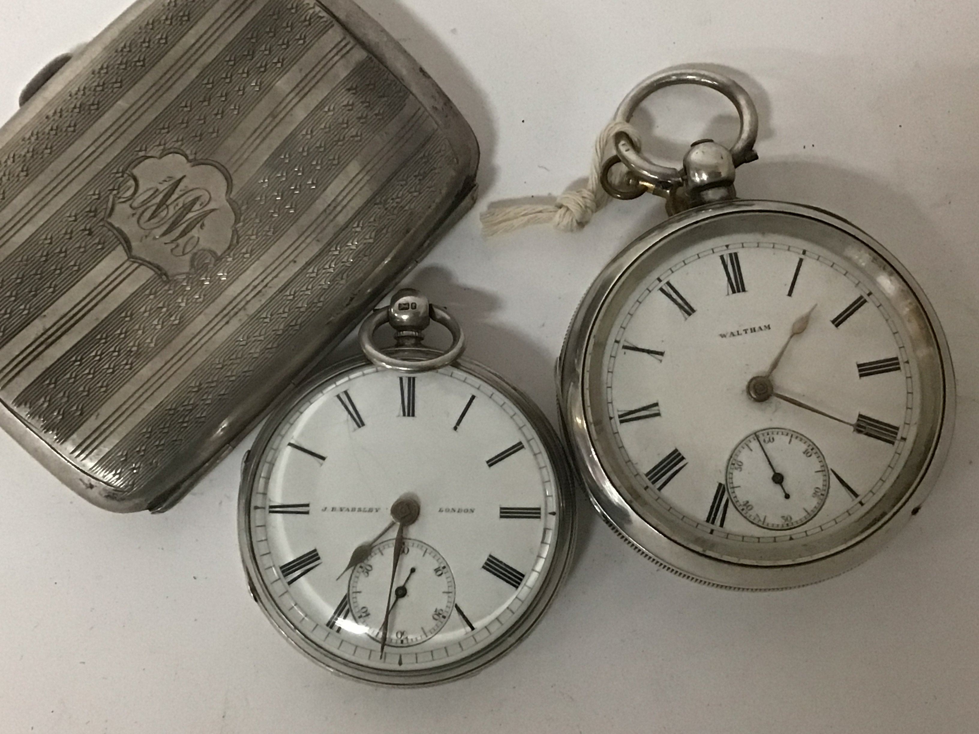 Two silver cased key wind pocket watches a Waltham J B Yabsley London and a silver cigarette case (3)