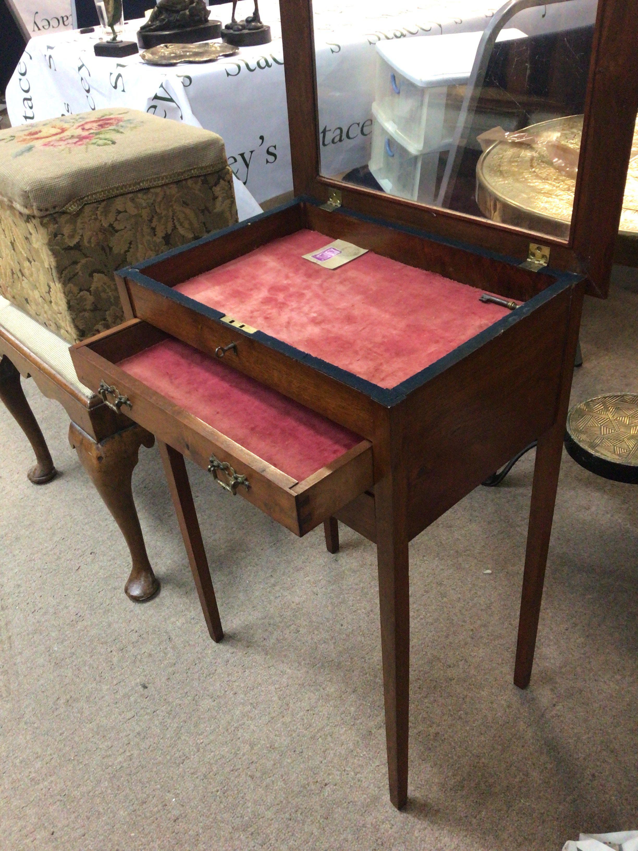 An Early 20th century walnut vertrine display cabinet with a hinged top above two drawers. on square tapering legs.
