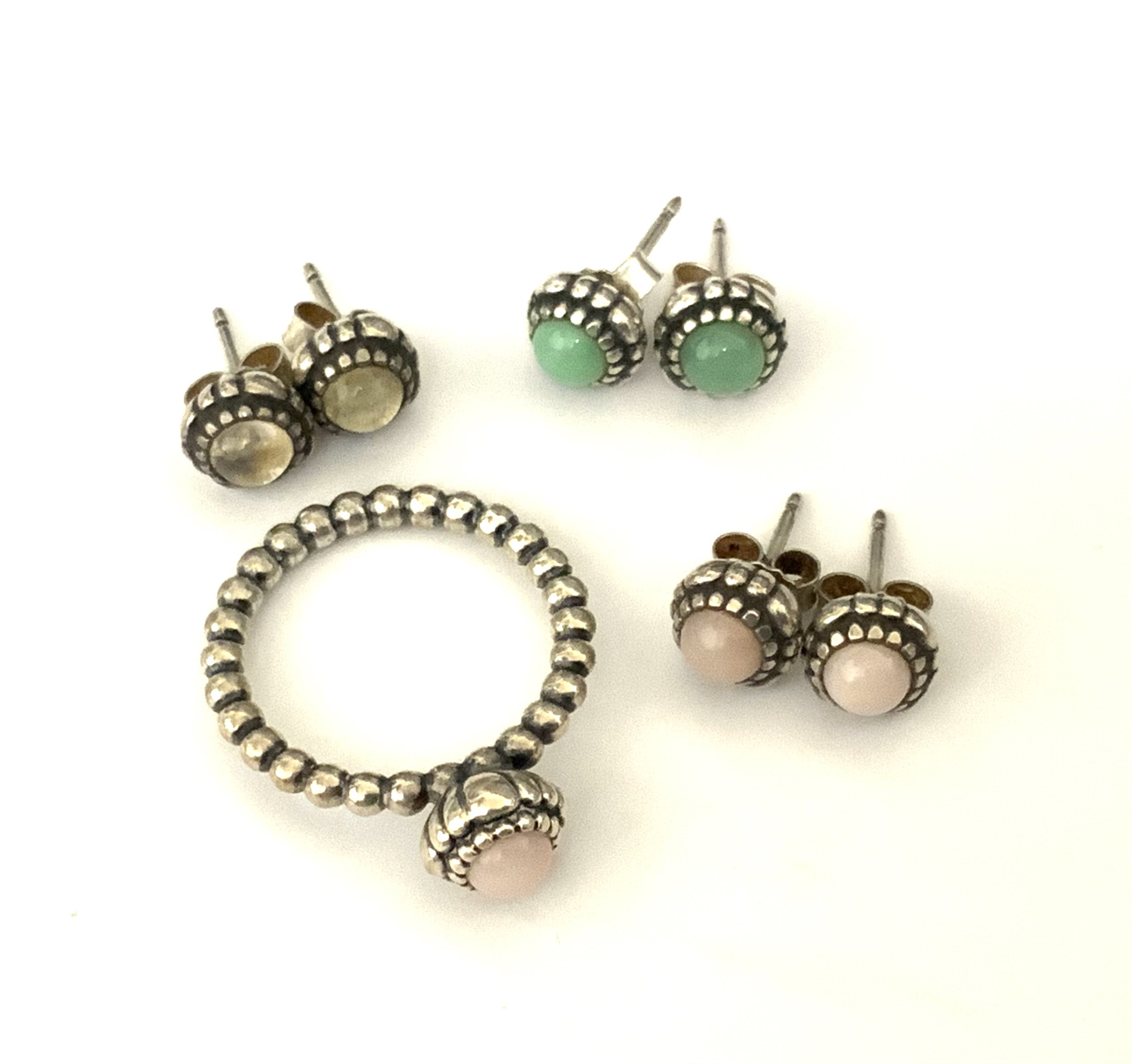 A Genuine sterling silver Pandora birthstone ring together with 3 pairs of matching stud earrings. (A)
