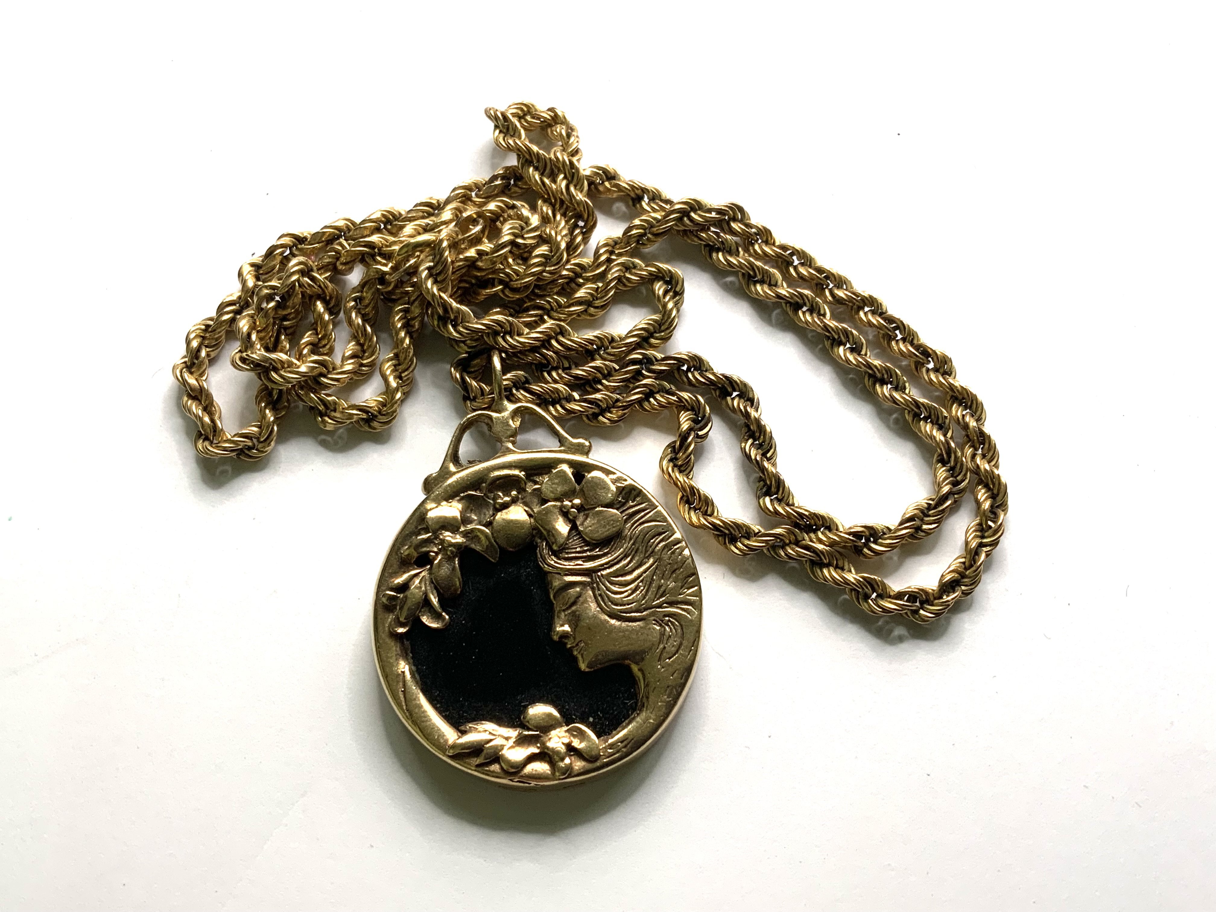 A 9ct gold rope chain together with a 9ct gold hallmarked art Noveau style pendant. (Overall weight 29.6g). A.