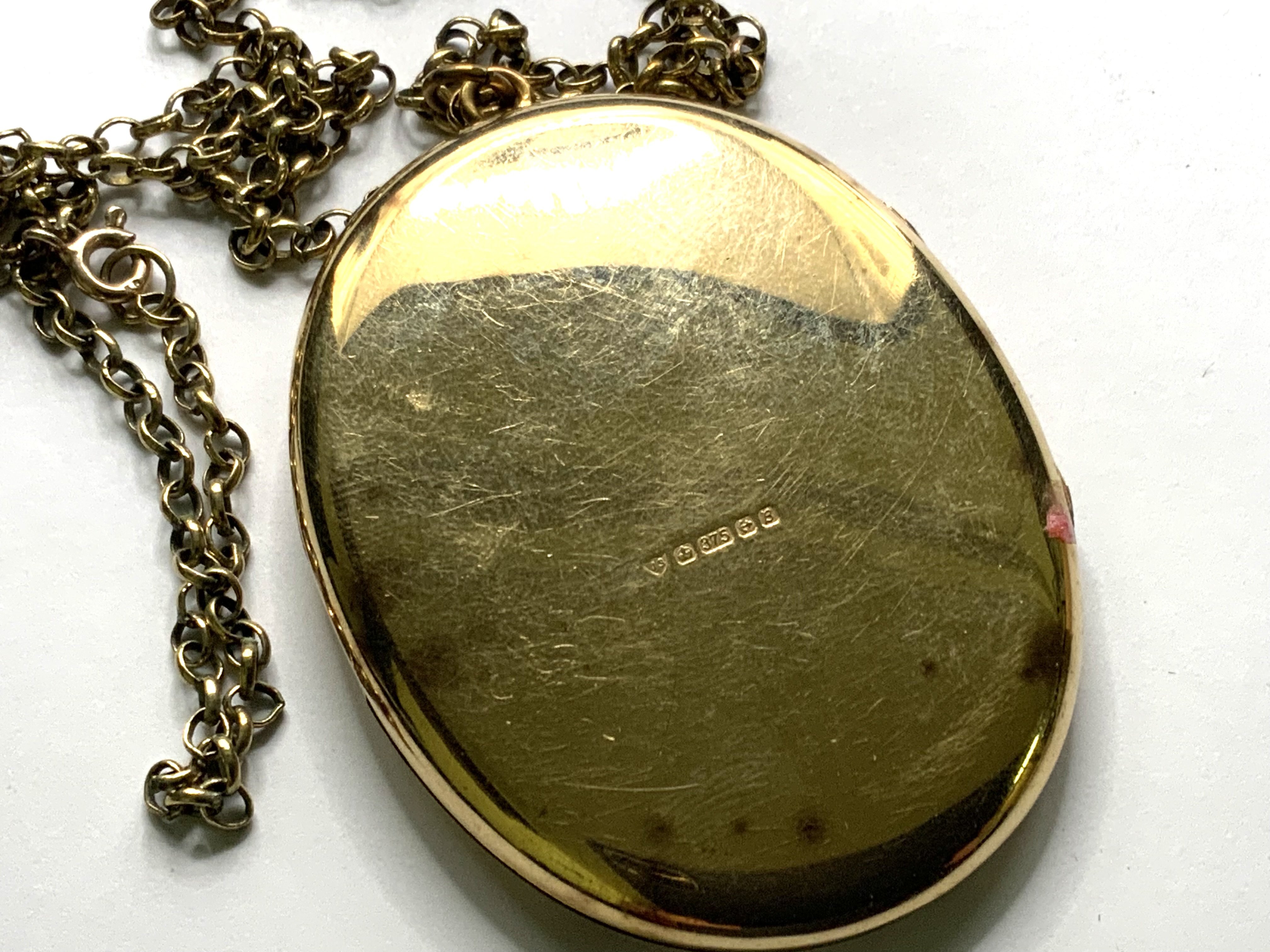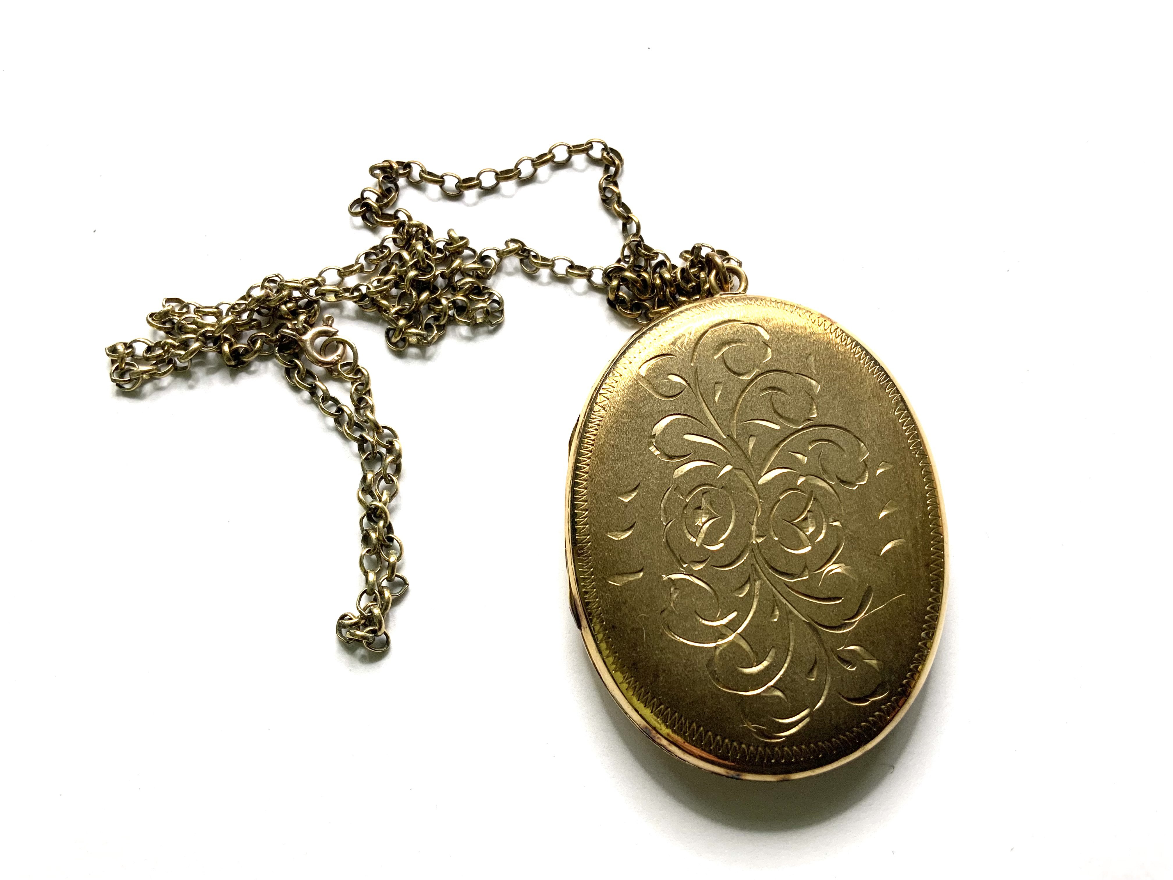 A large 9ct gold Locket with engraved rose design and chain. Overall 28.5g. (A)