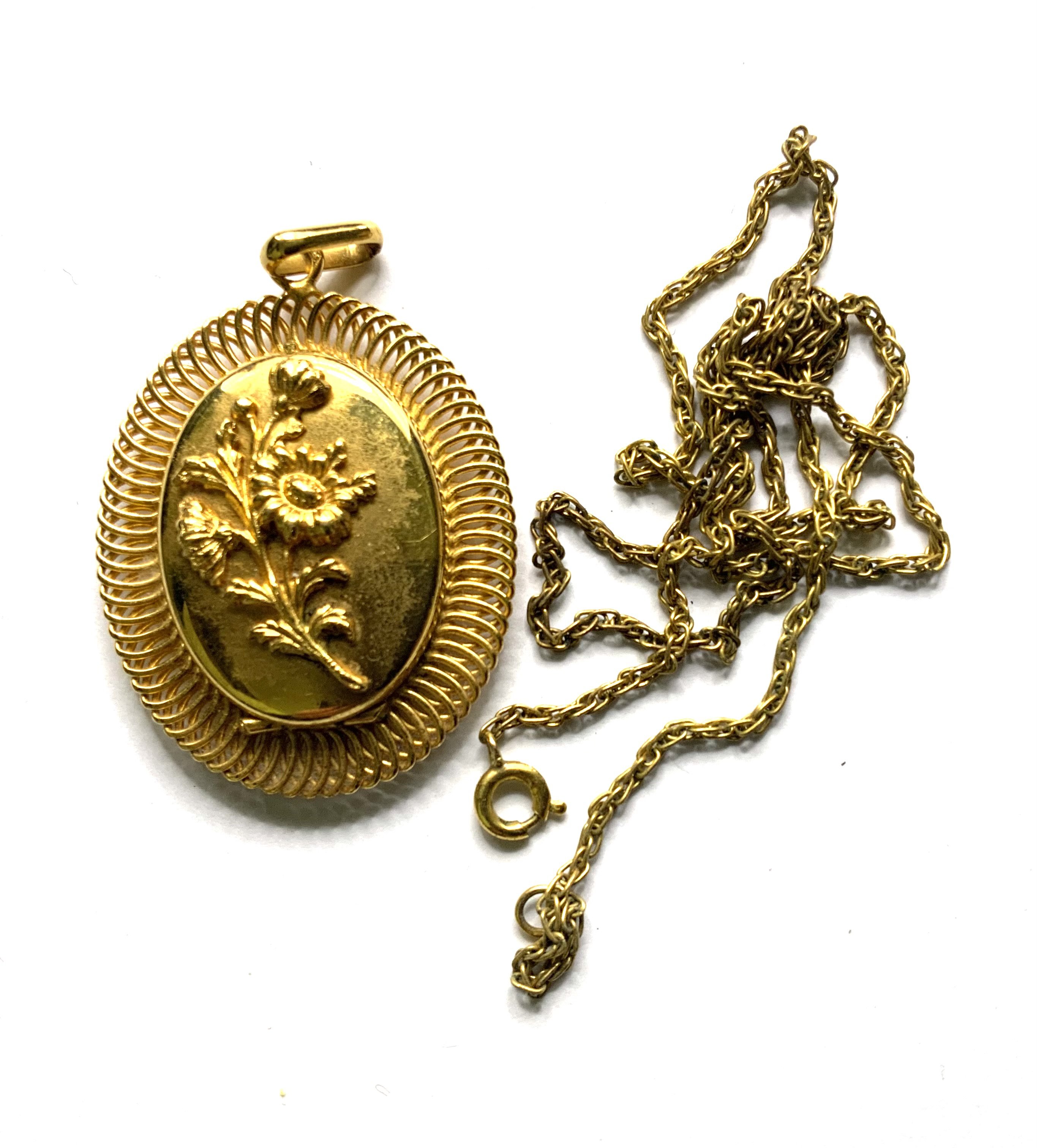 A gold locket with floral overlay design on a 9ct gold rope chain. 12.4g (A)
