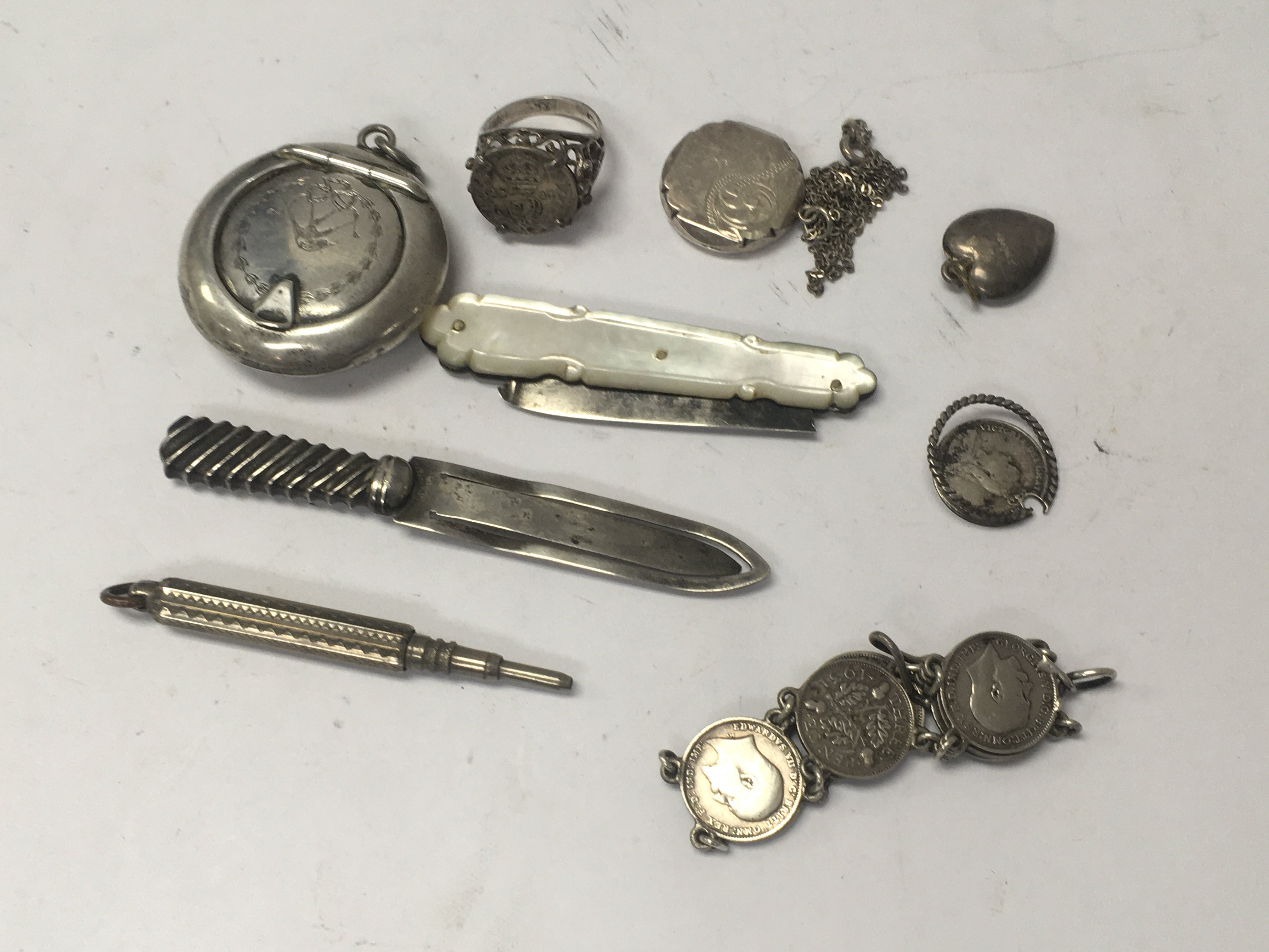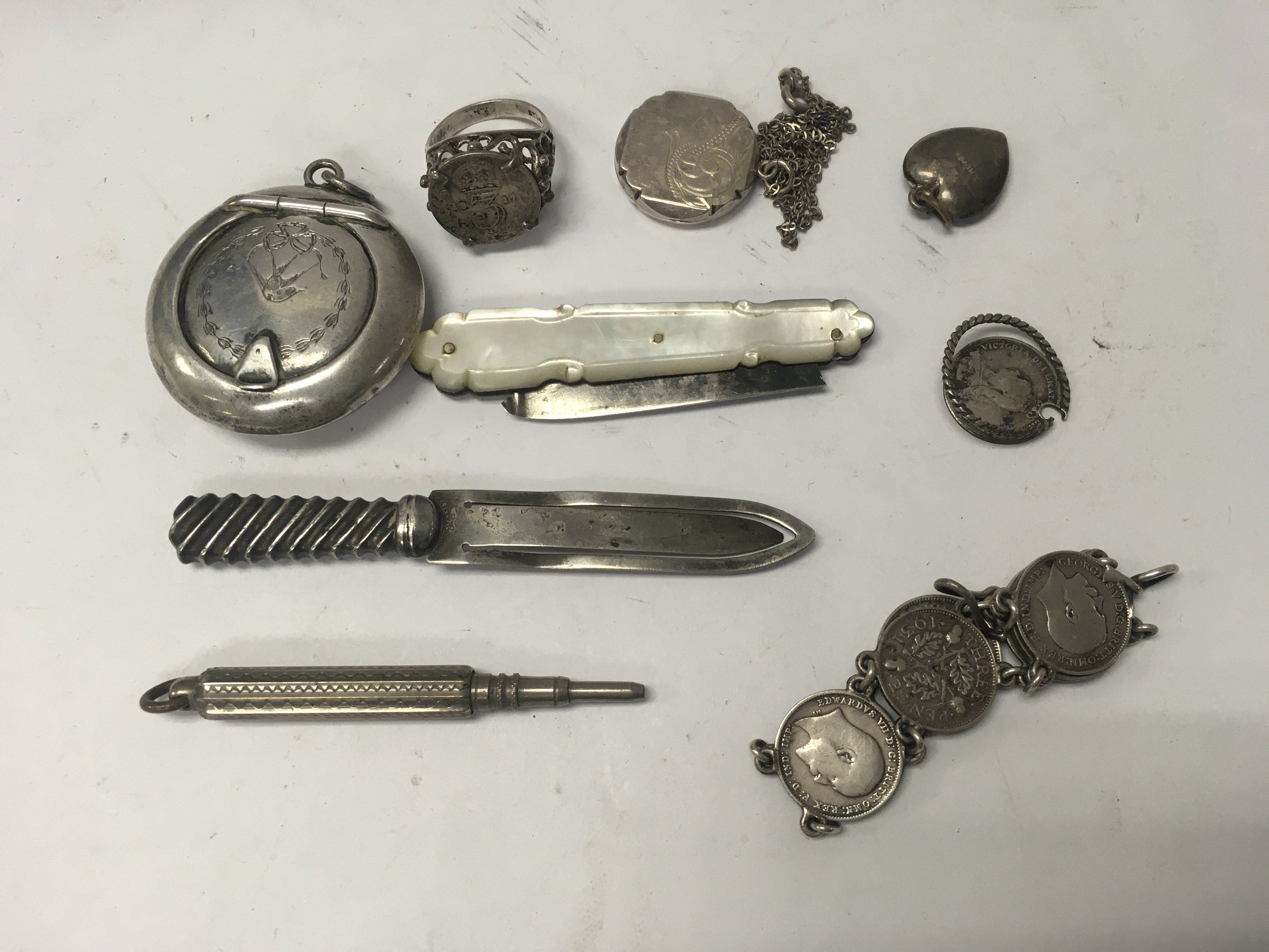 A small collection of silver items including jewellery fruit knife bracelet and pendants.