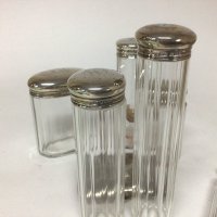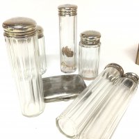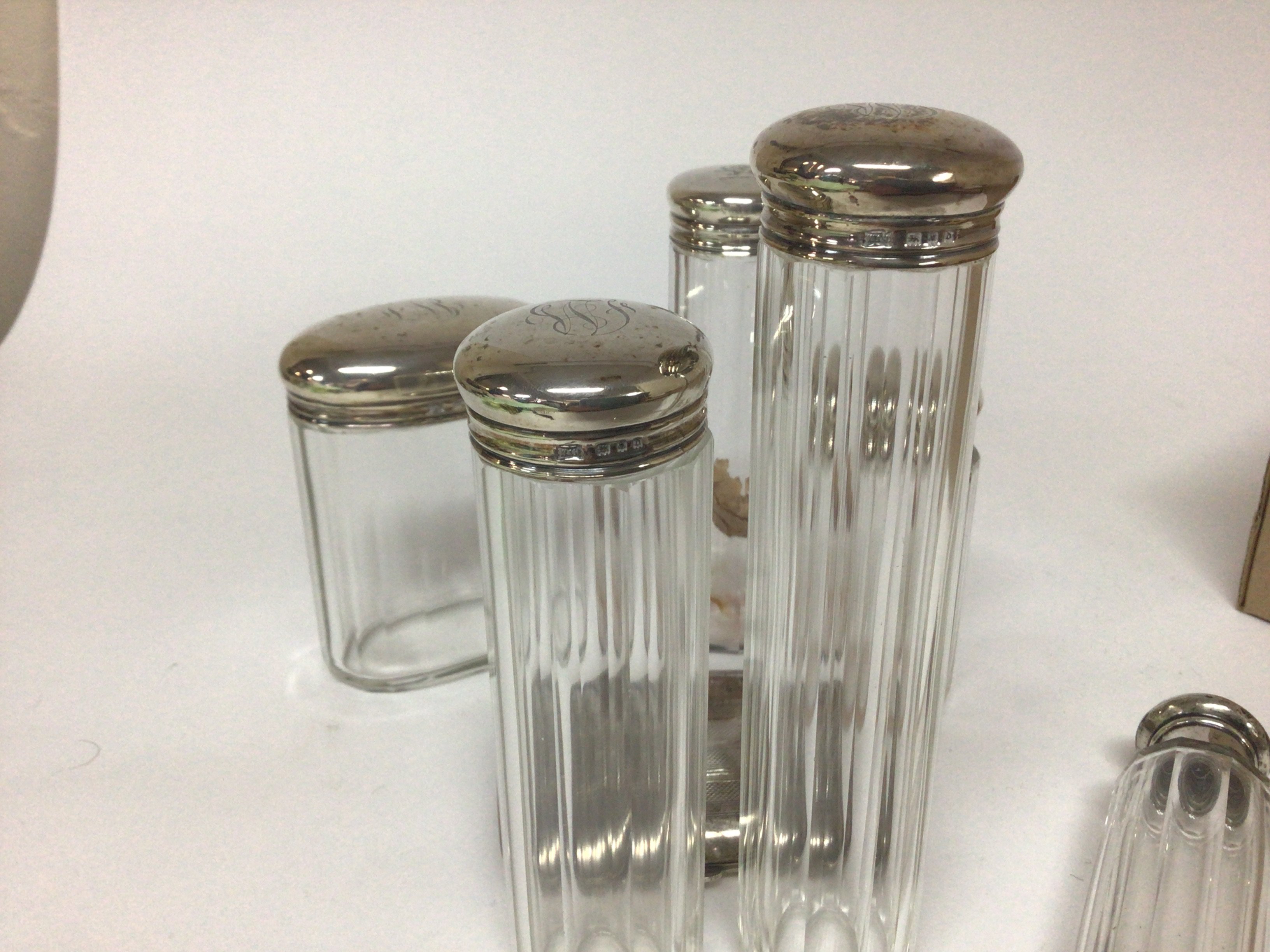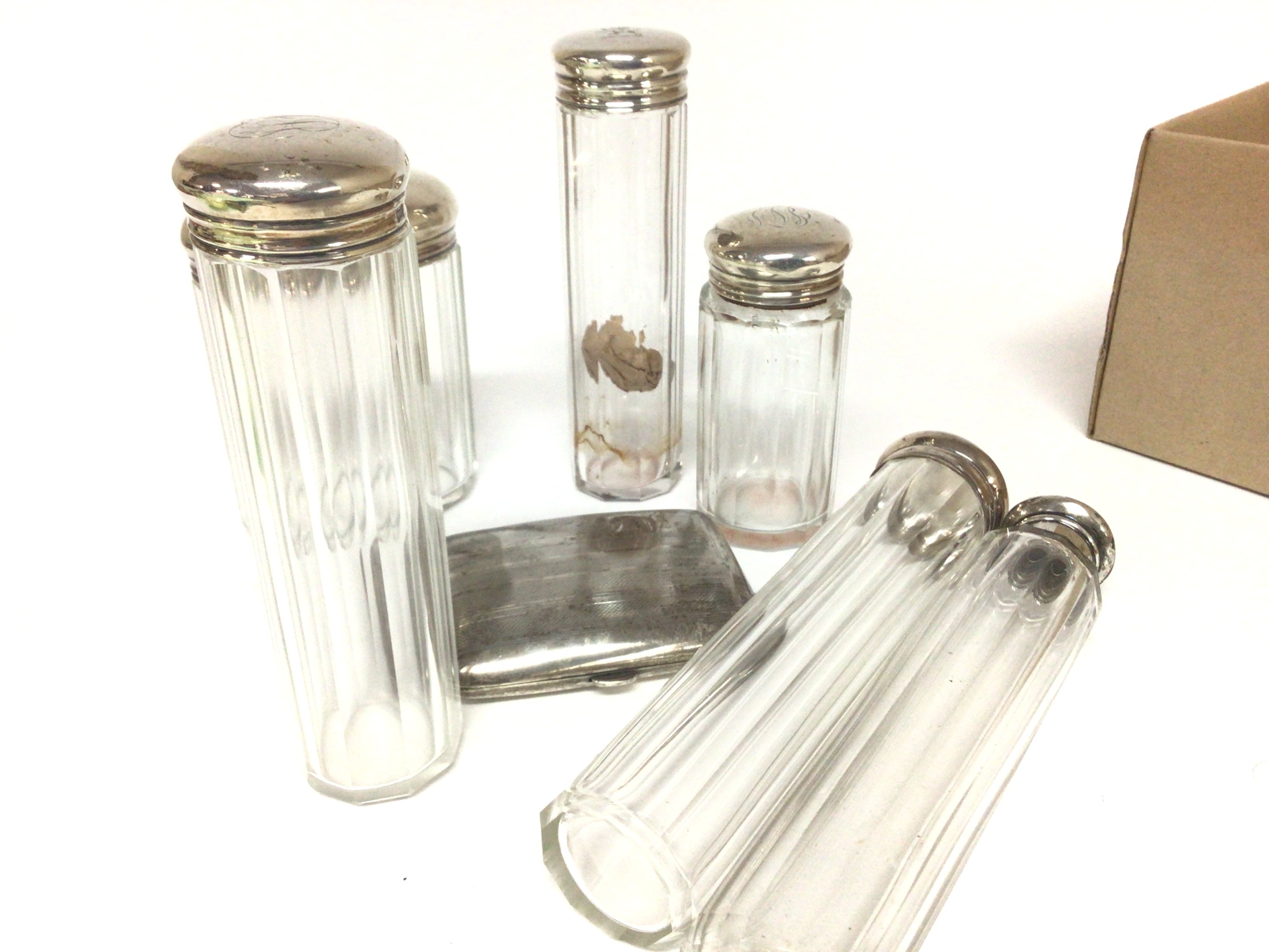 A silver cigarette case and silver topped tidy jars maker walker Hall London with personal initial inscriptions.