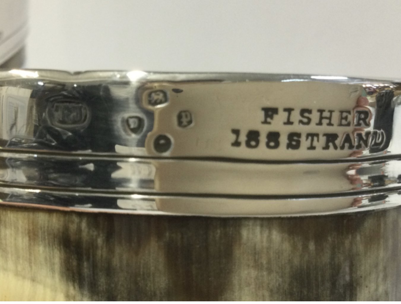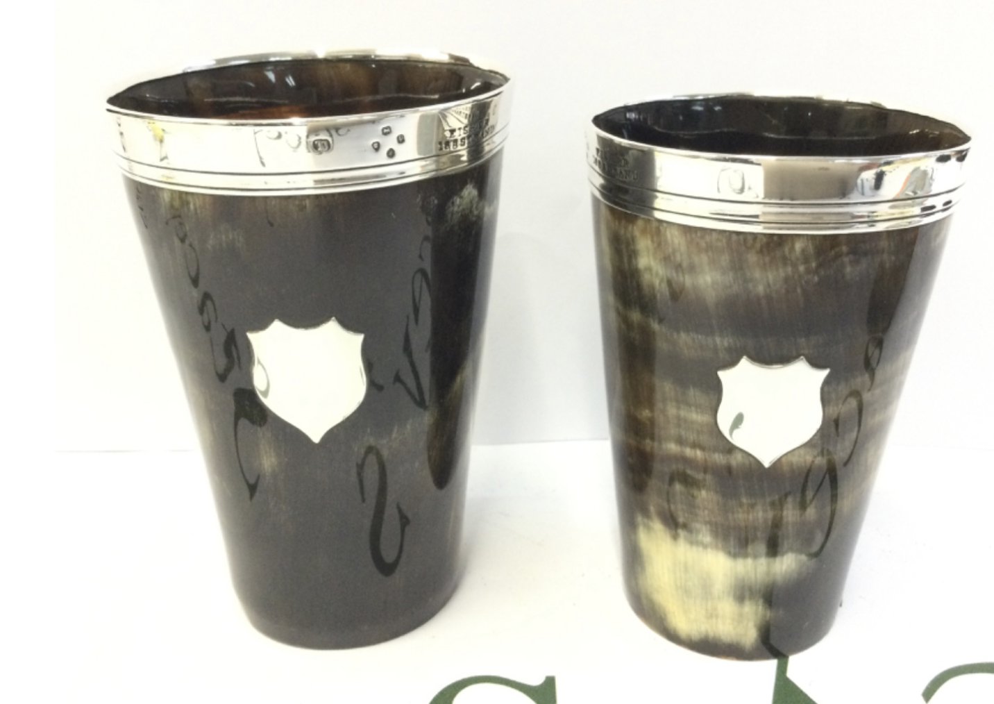 A pair of Victorian horn and silver beakers 11 & 11.5cm tall. Marked Fisher 188 Strand. Postage category B