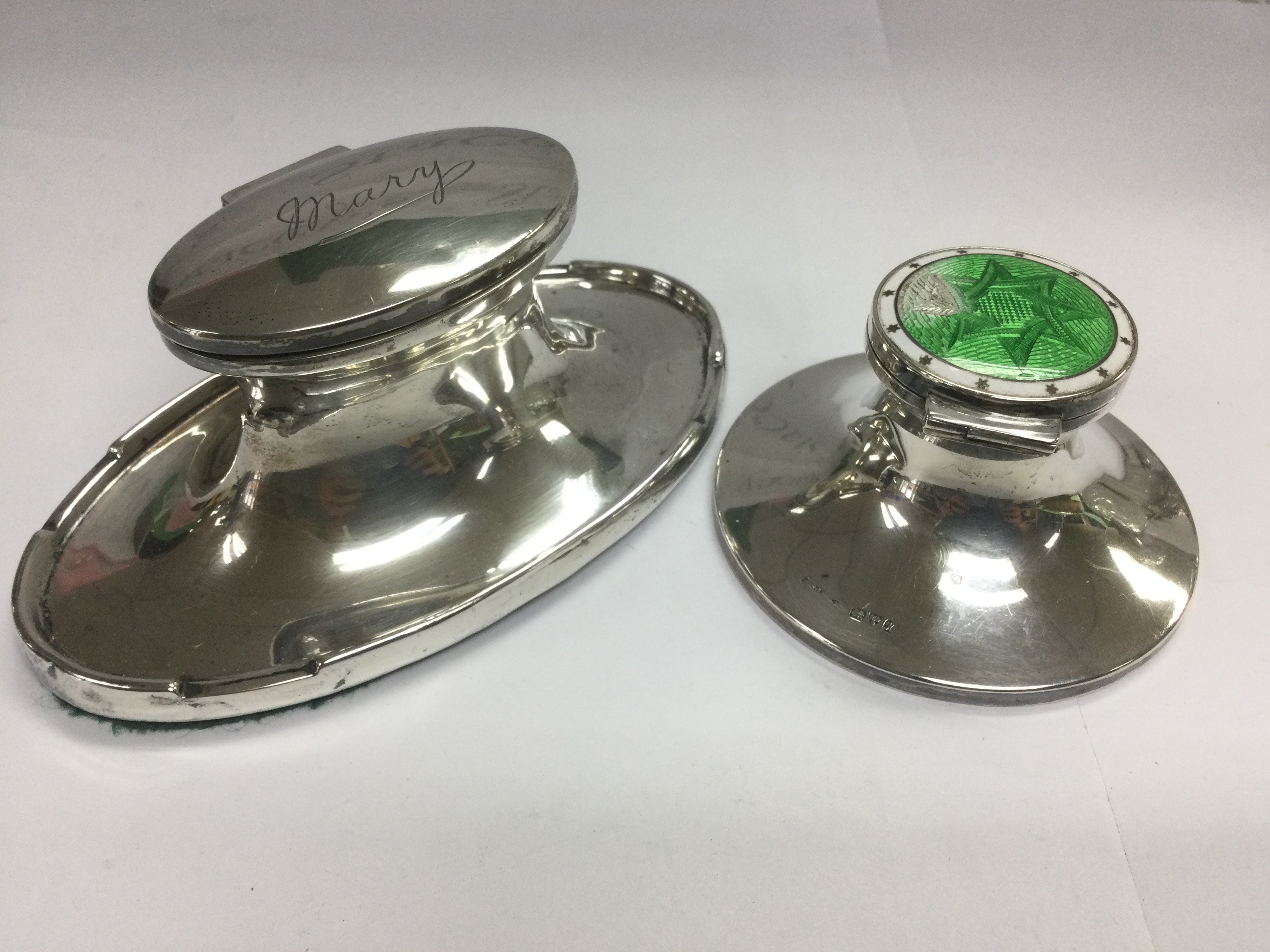 Two silver inkwells, one with enamel decoration, sadly damaged. Shipping category B.