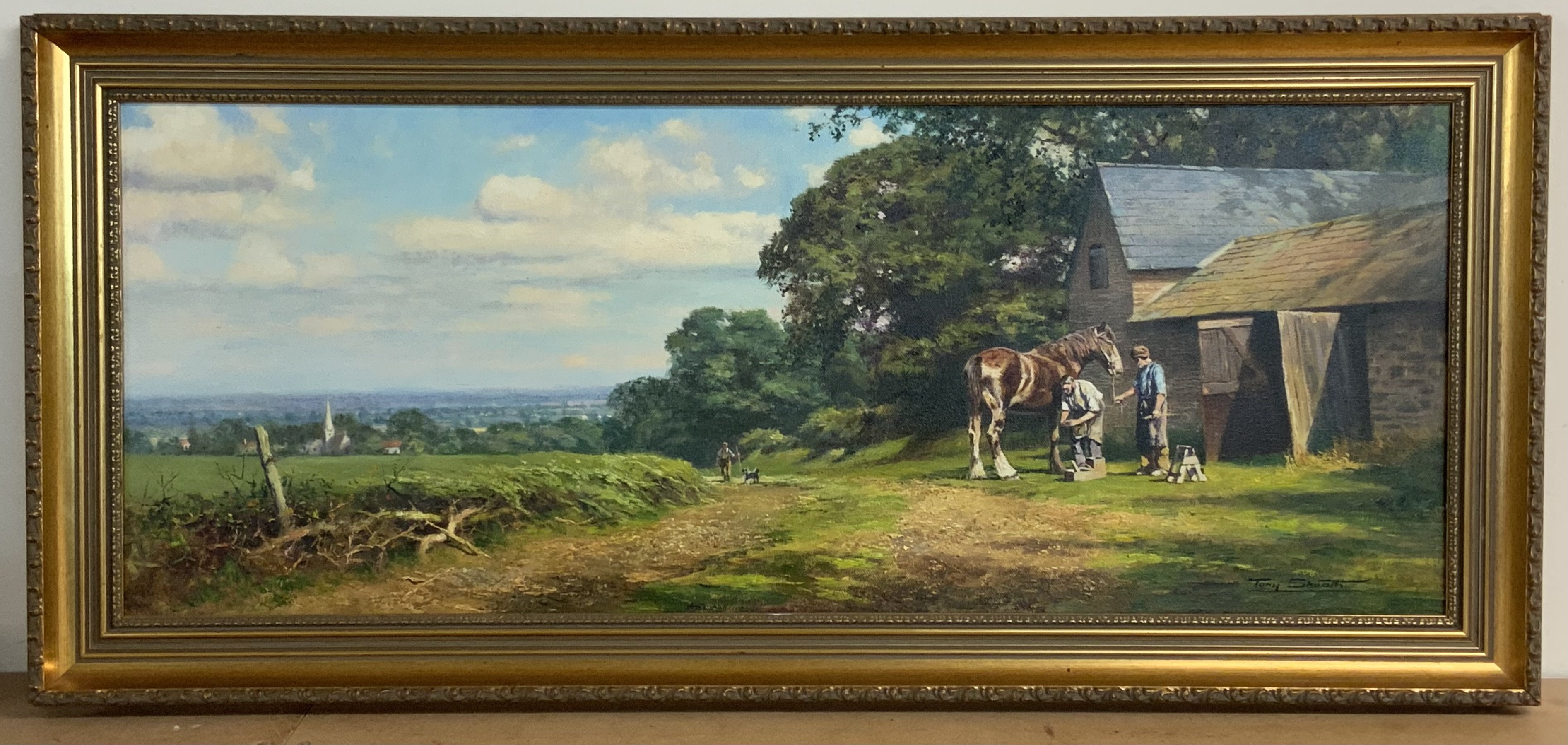 Tony Sheath 84cm x 36cm Blacksmiths shop against a landscape. (D)