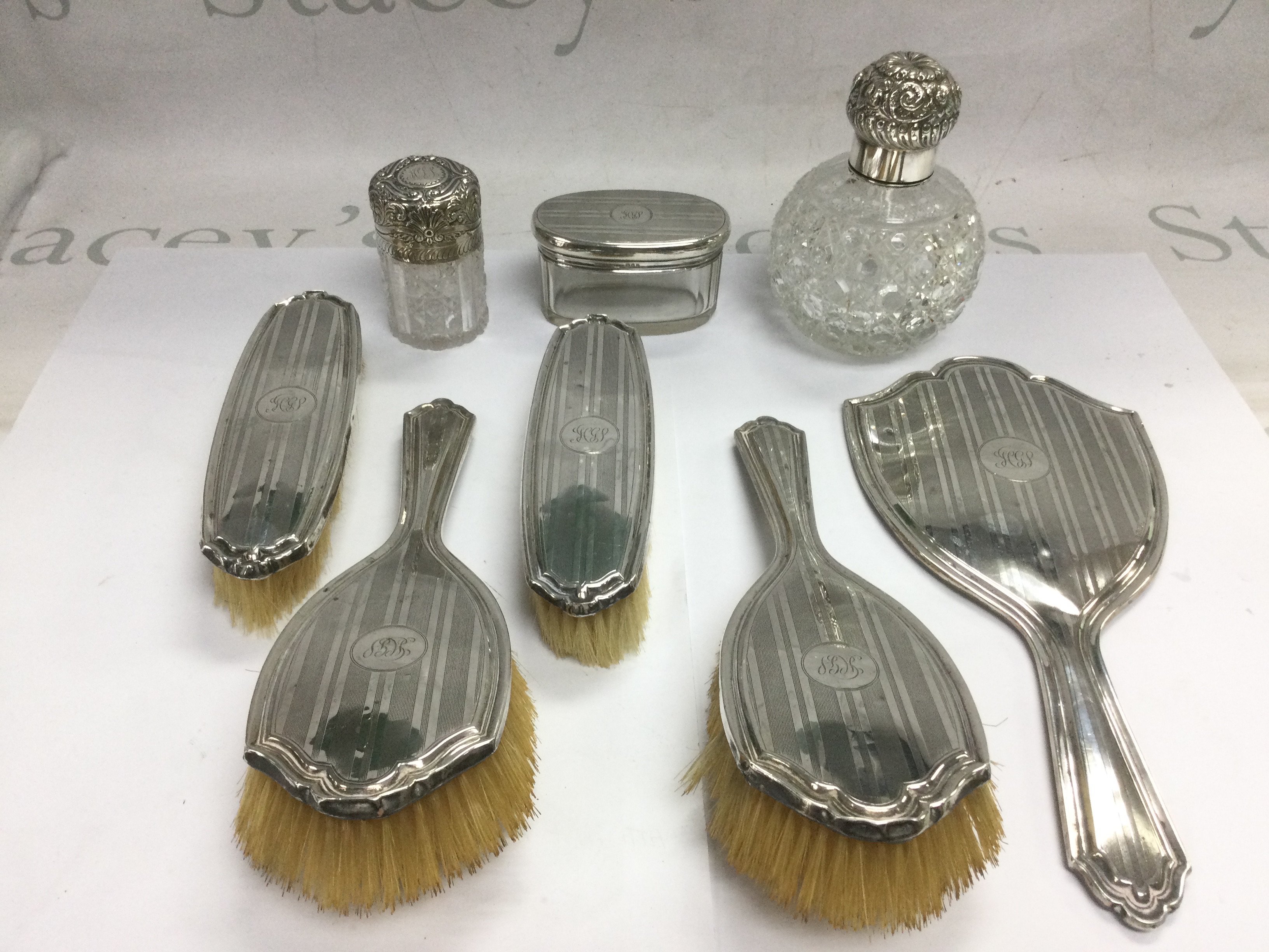 A diver dressing table set comprising a handmirror and brushes, Birmingham hallmarks, plus two silver topped perfume bottles with repousse work decoration and a silver topped tidy jar. Shipping category D.
