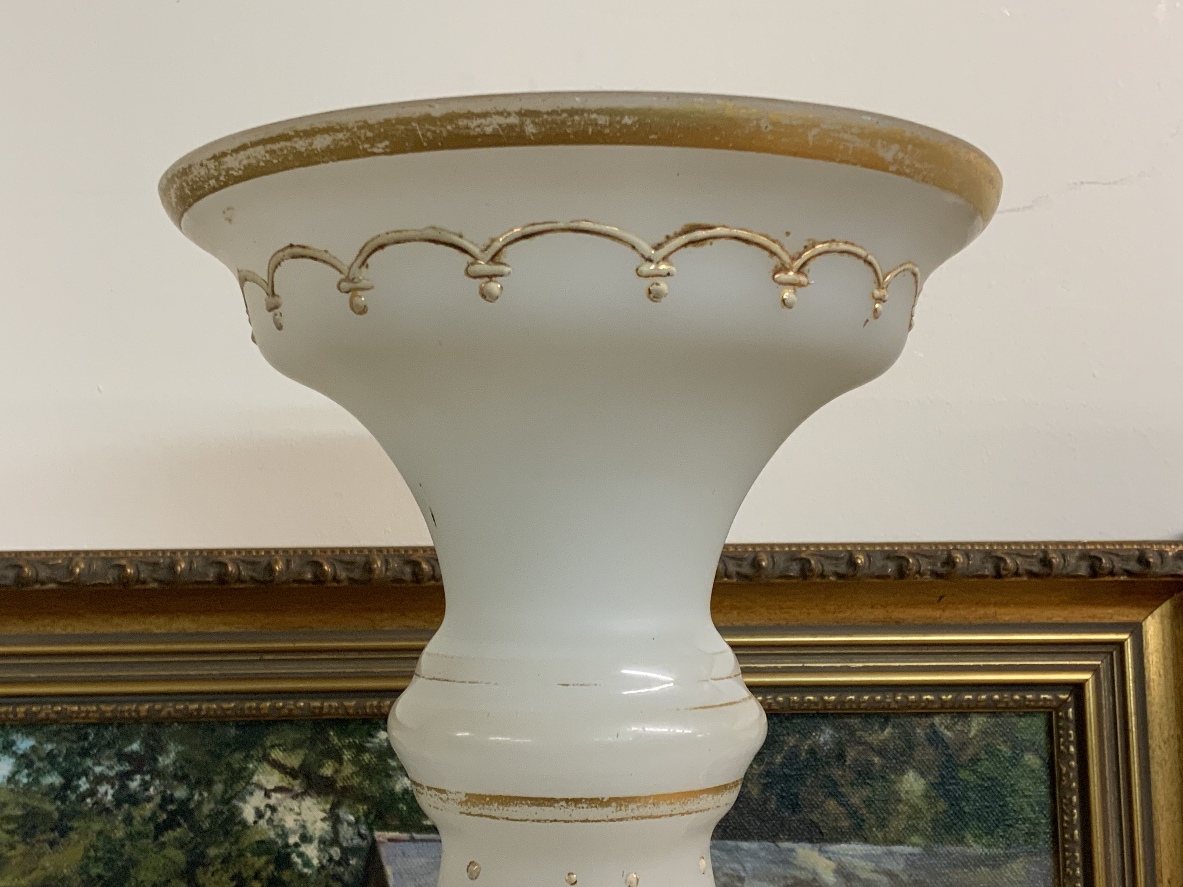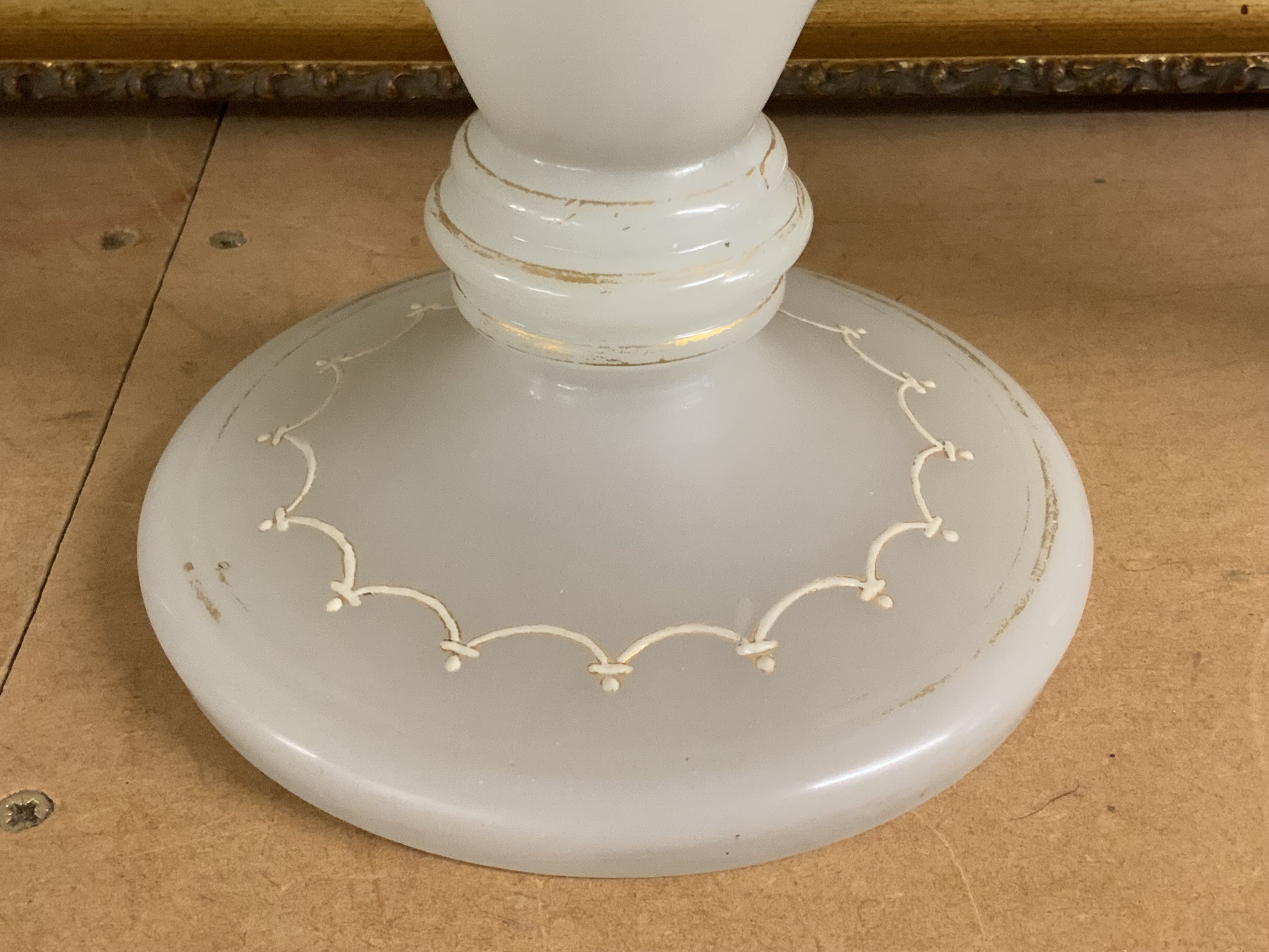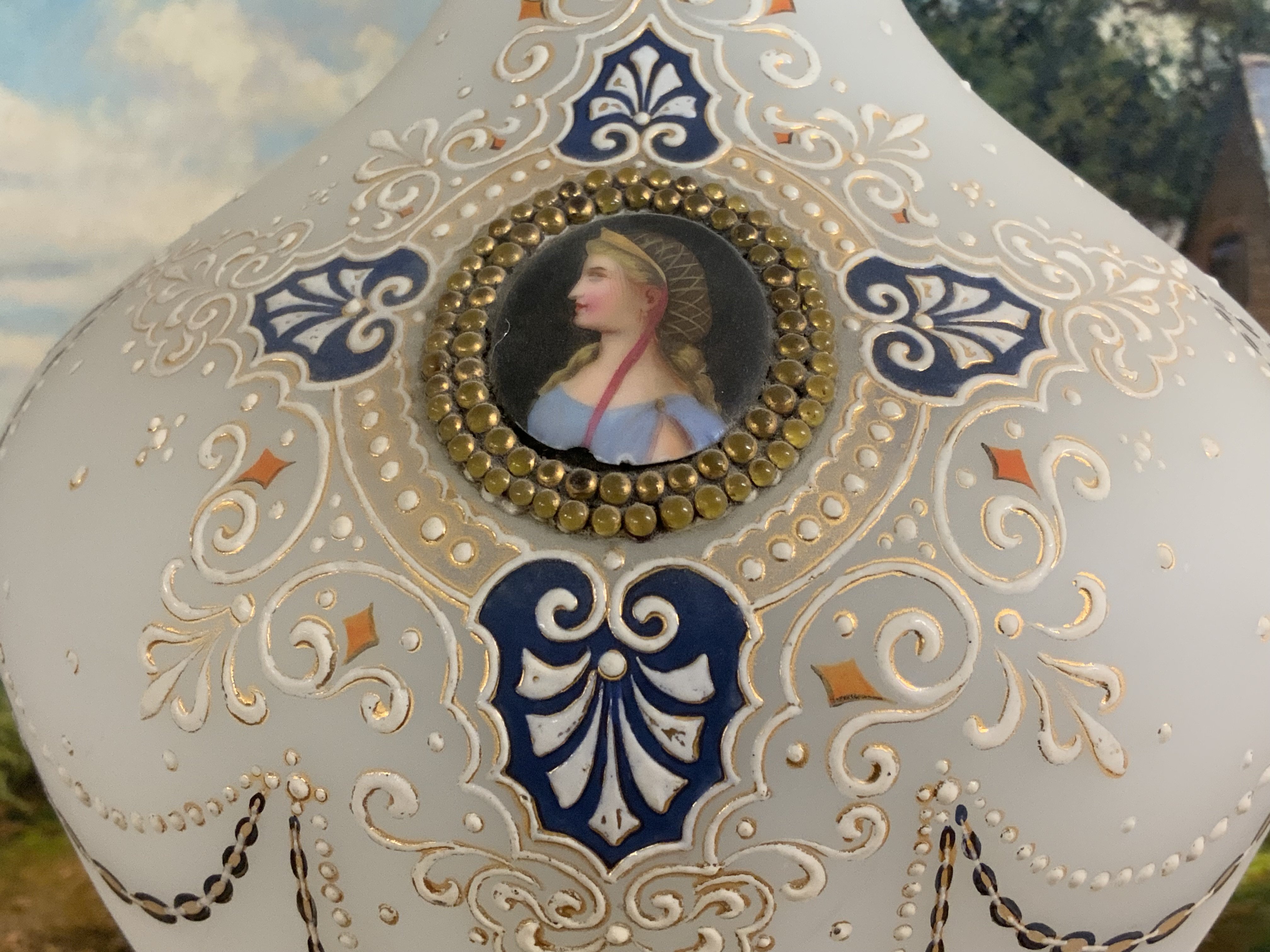 Pair Of Large Opaline Glass Footed Baluster Vases, C. 1900, The front decorated with 2 oval portrait panels, 45cm.