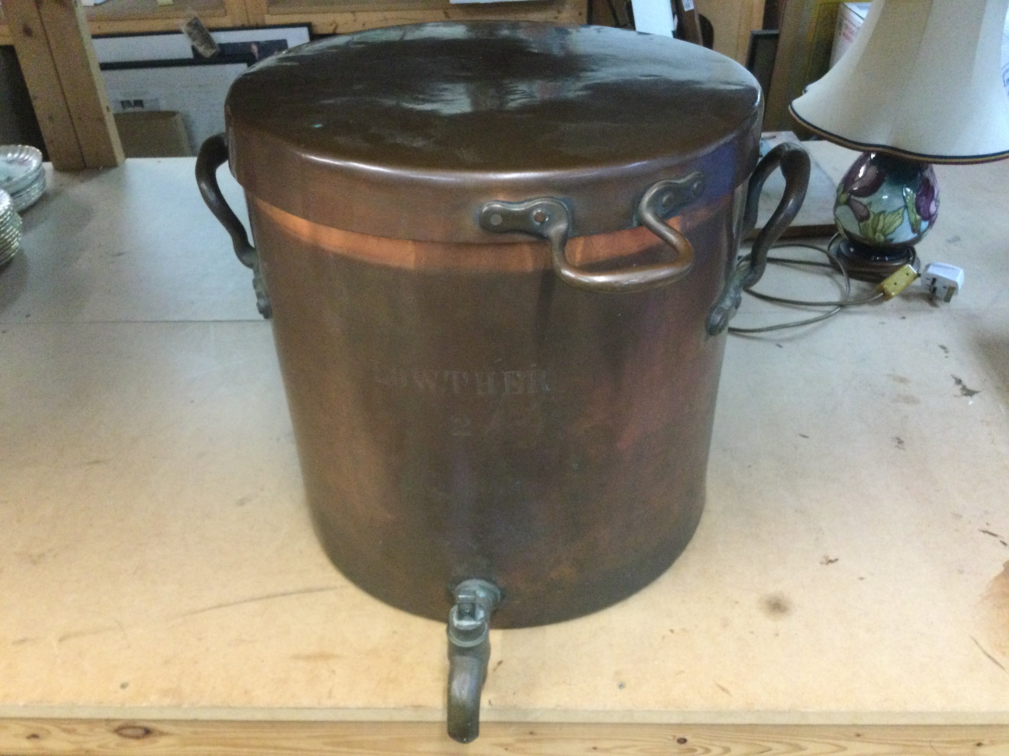 A large copper pot marked Lowther 2, approx height 42cm. Shipping category D.