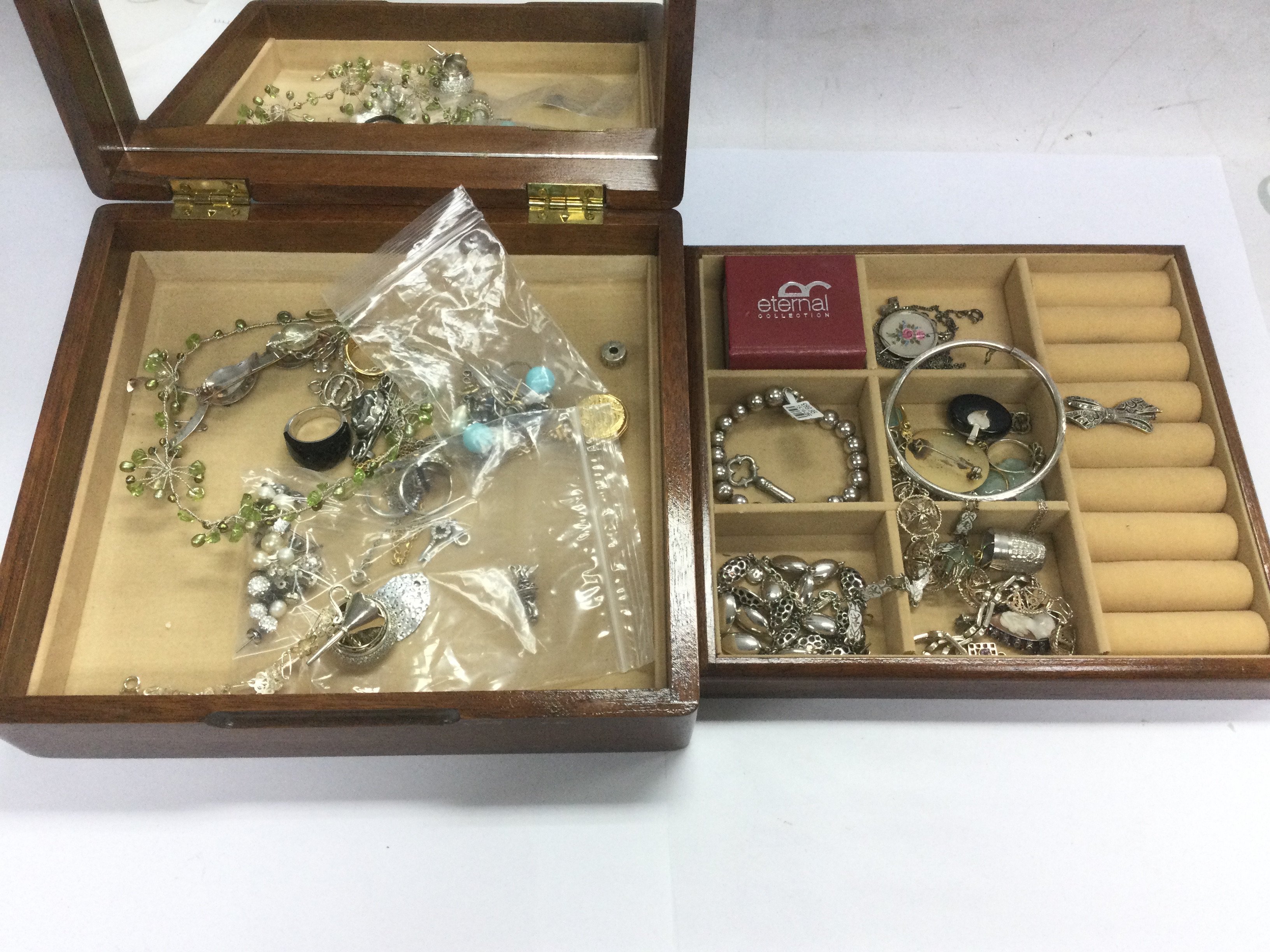 A jewellery box comprising mainly silver jewellery items. Shipping category D.