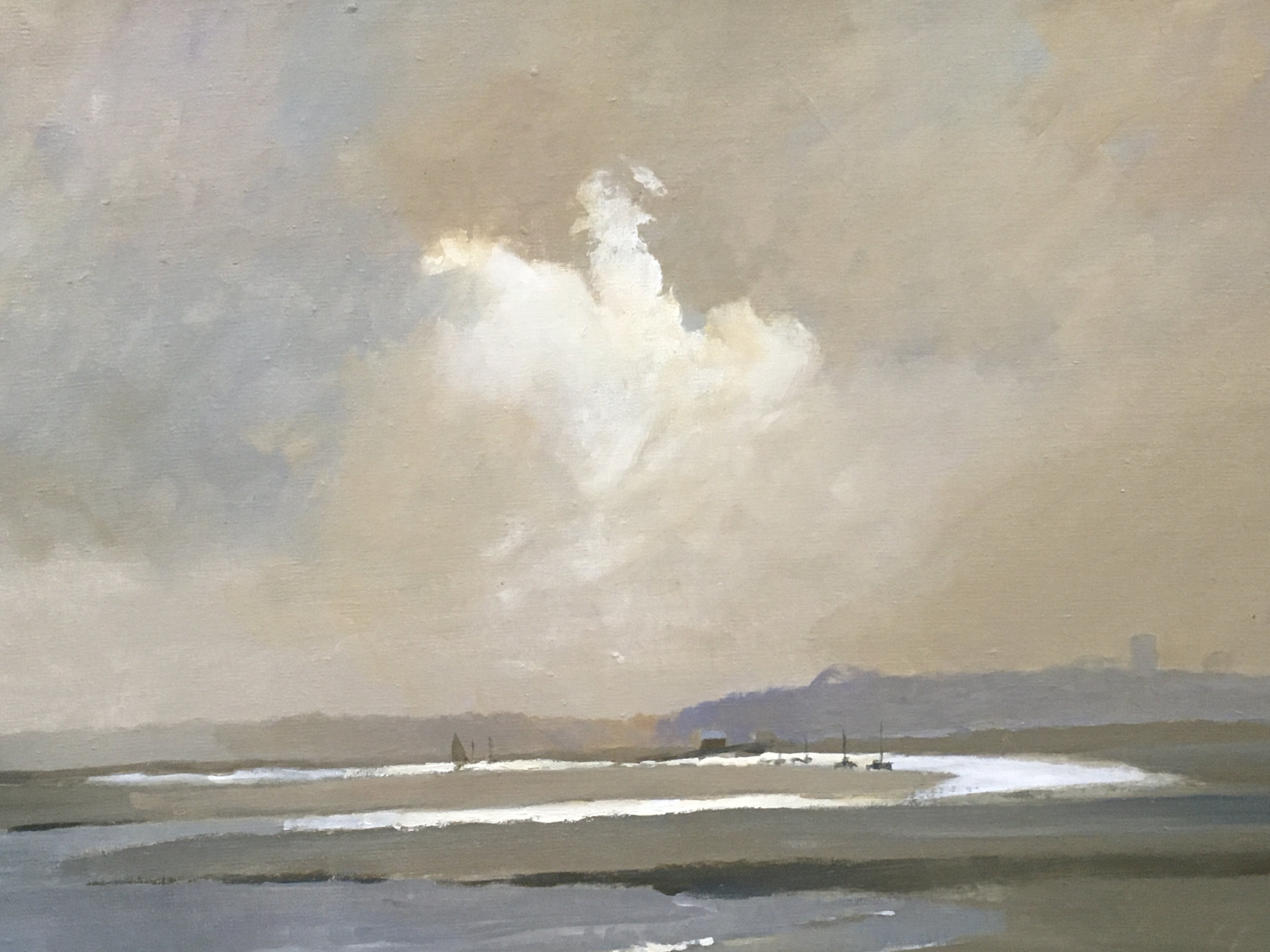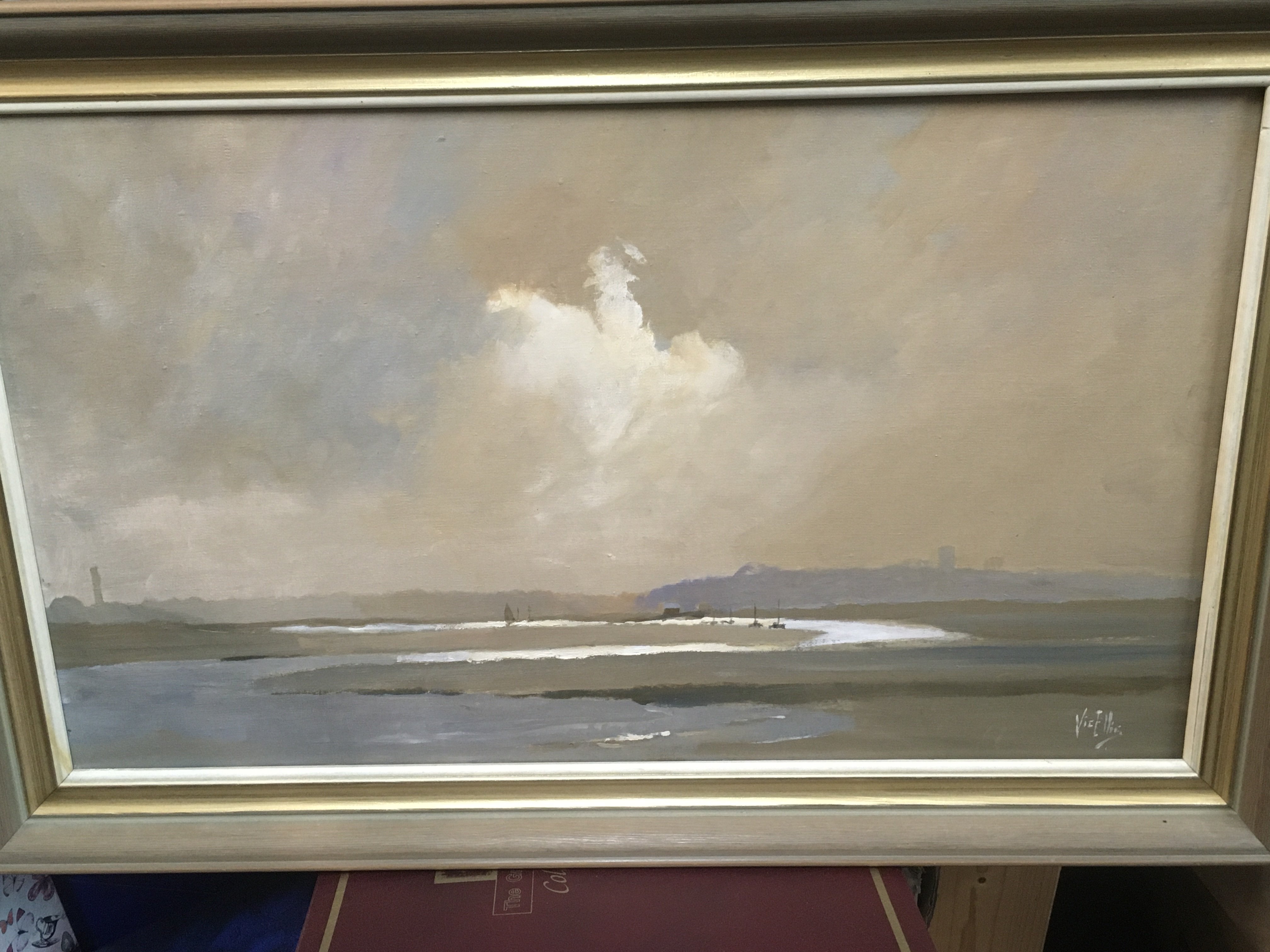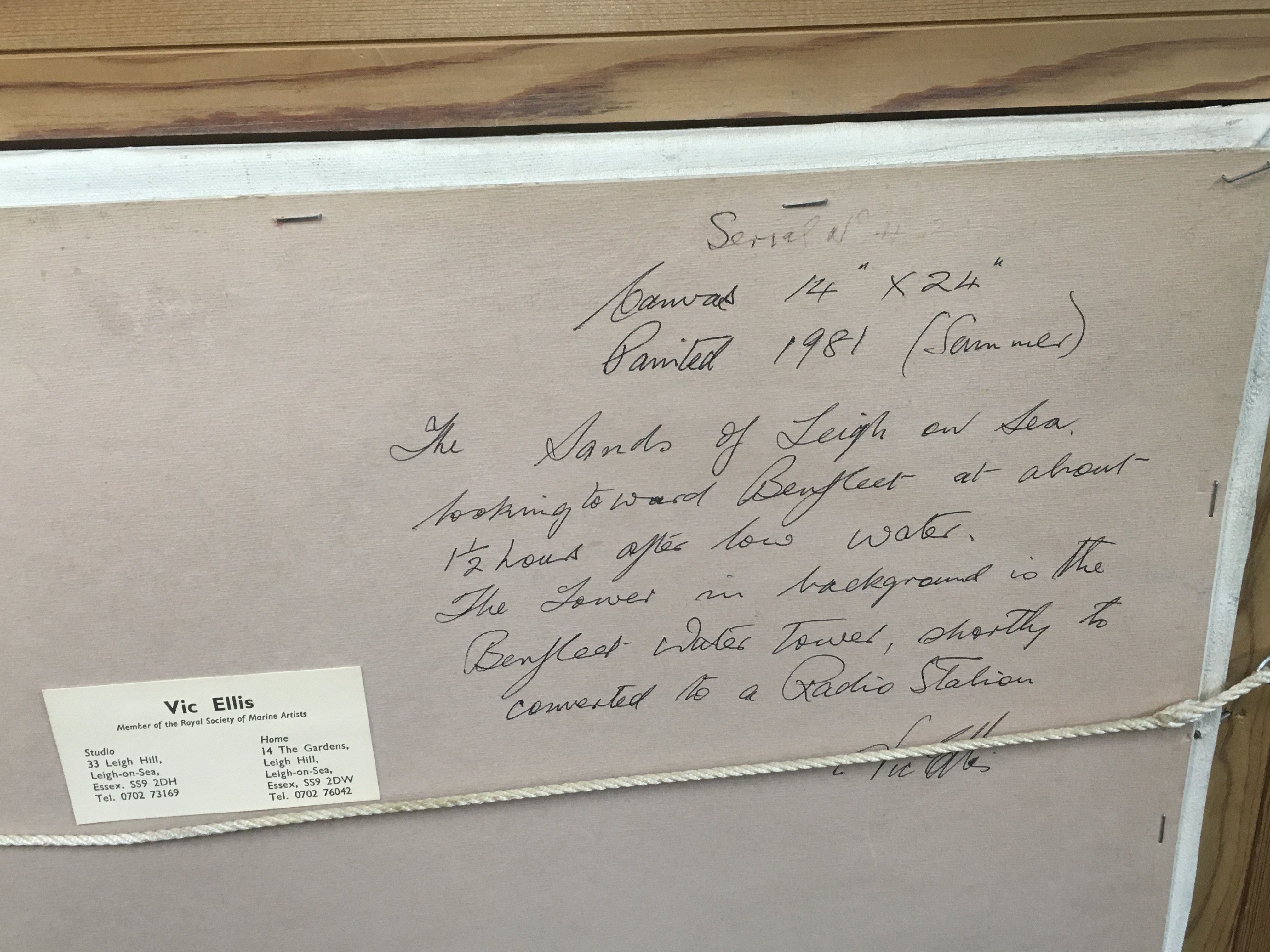 A Vic Ellis oil on canvas painting, The Sands of Leigh on Sea with written description from Vic Ellis on the back.