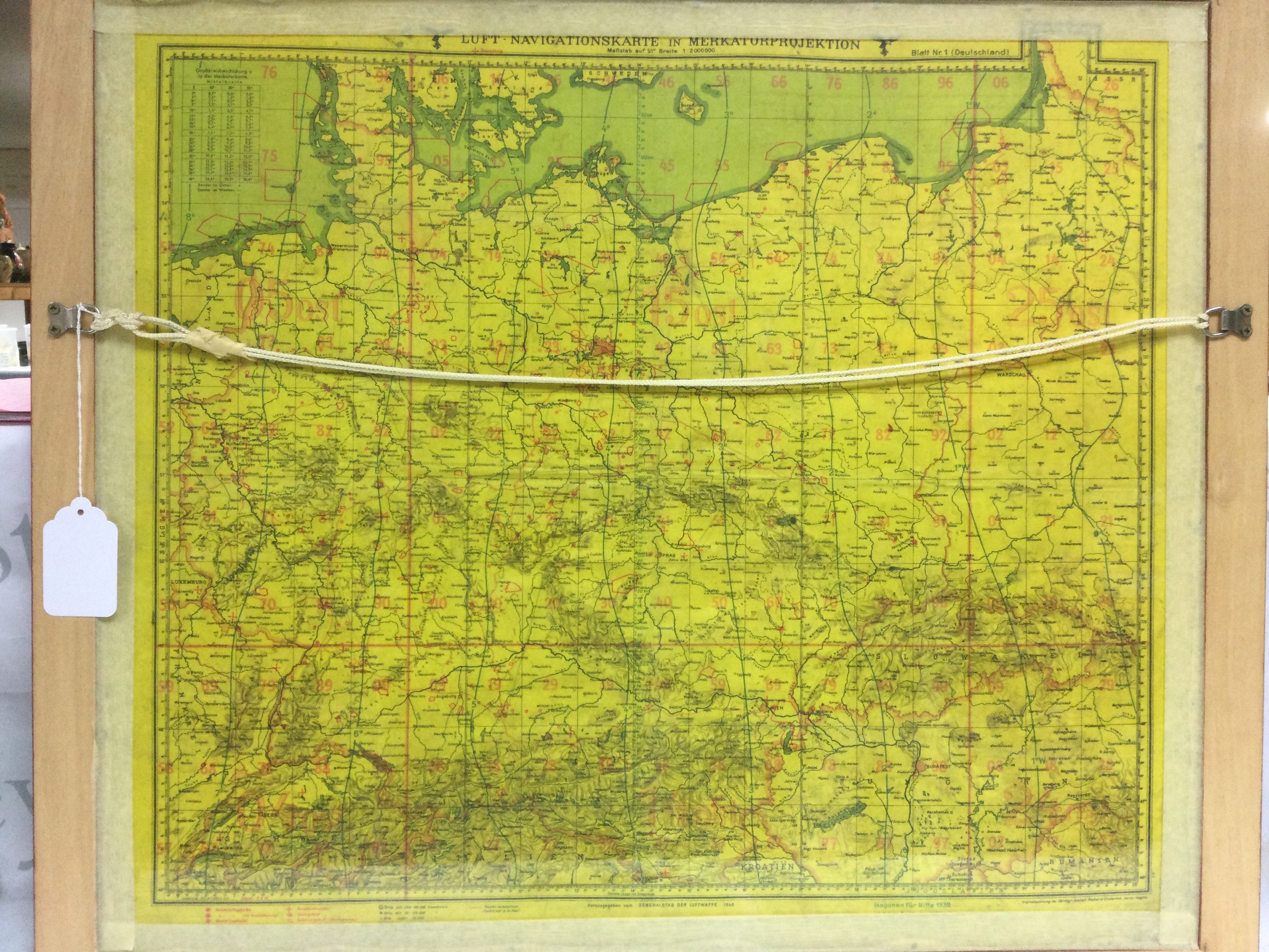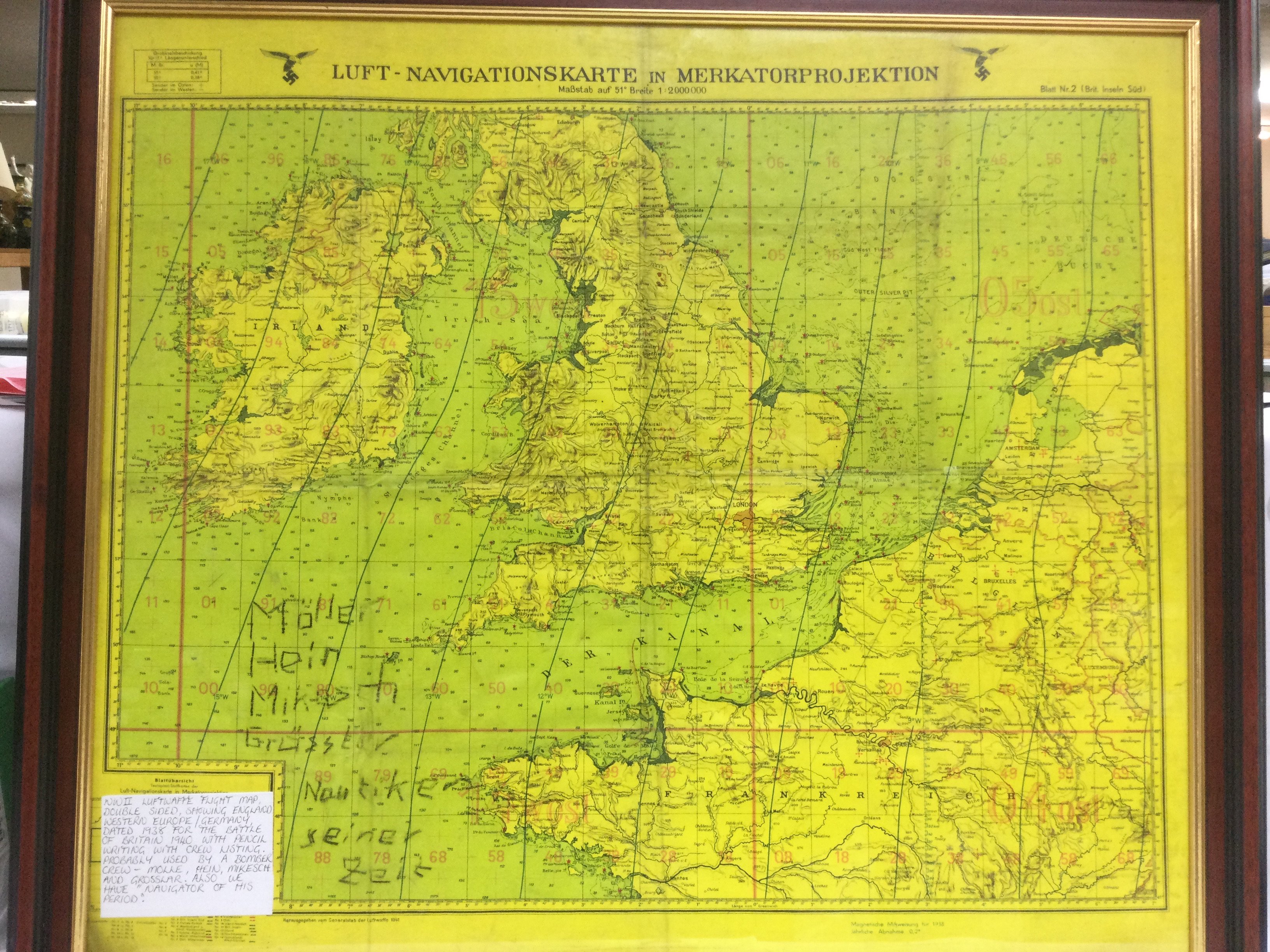 A framed and glazed double sided WW2 Luftwaffe bomber crew flight map depicting England and Western Europe on one side, Germany on the other. Includes crew names added in pencil. Approx 77cm x 68cm. Shipping category D.