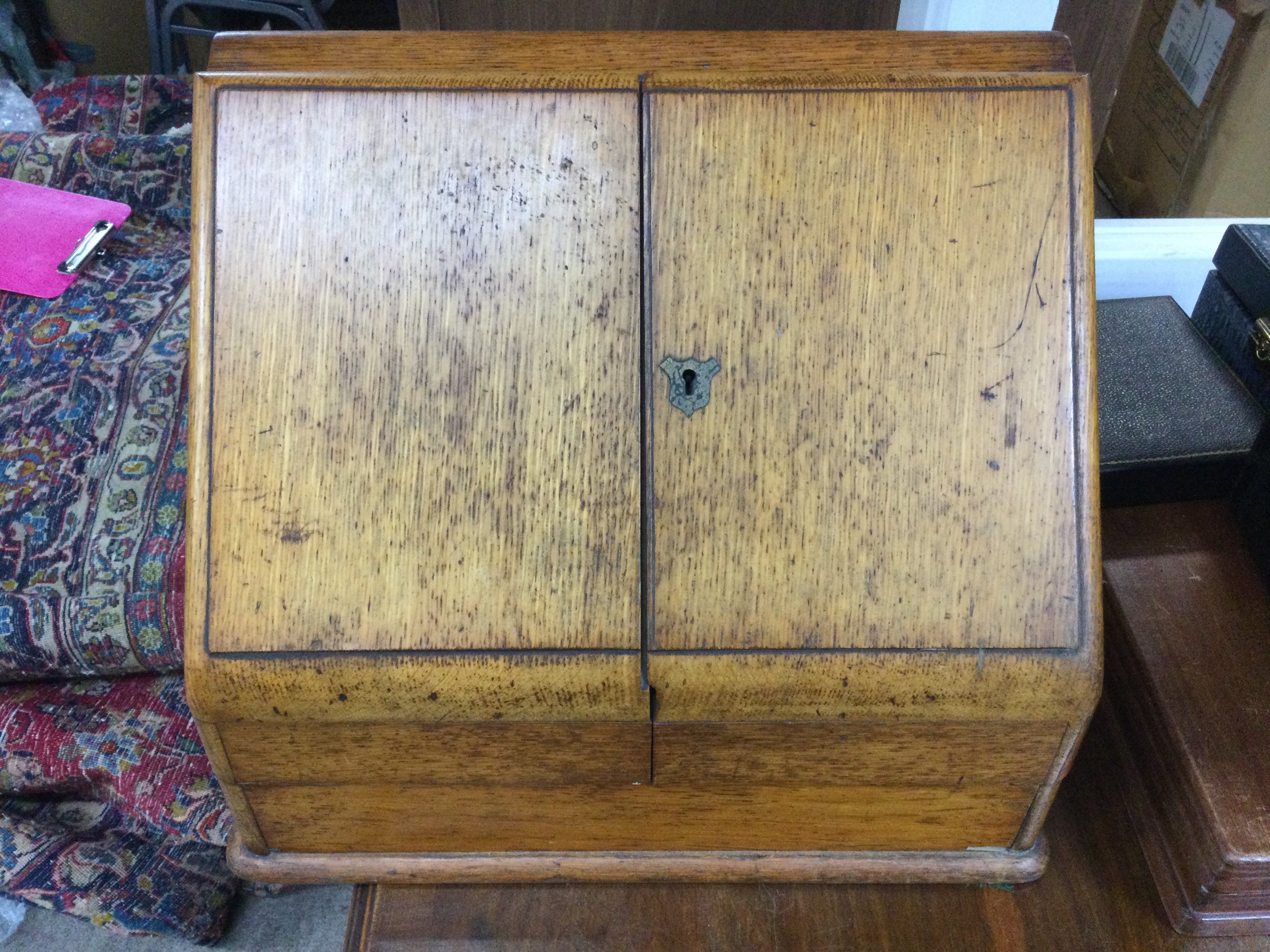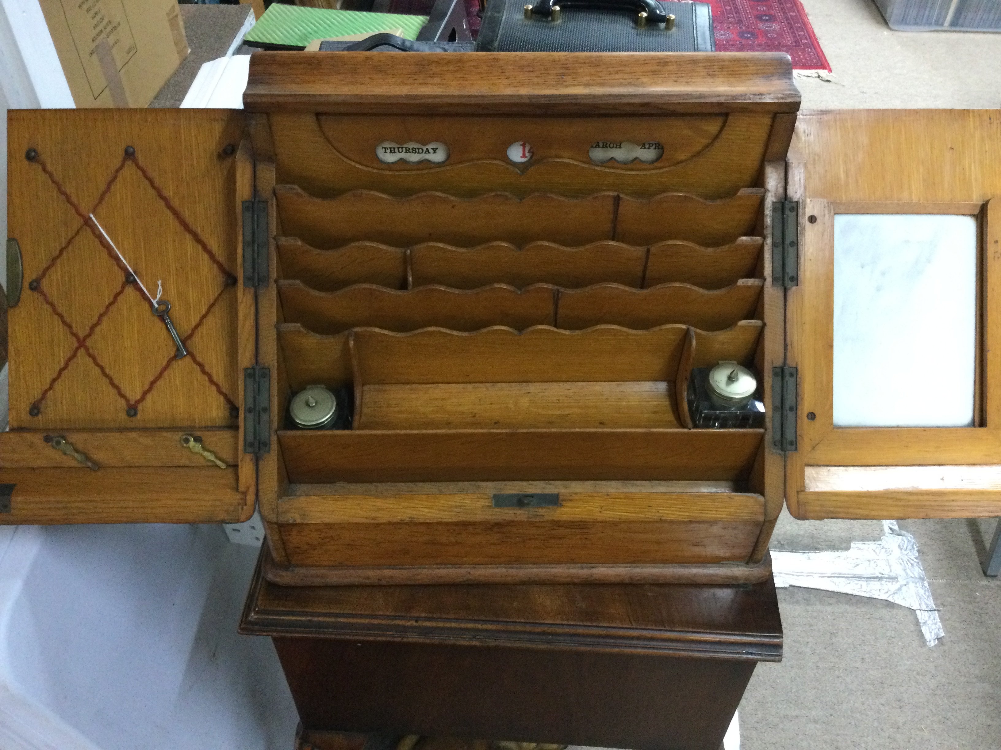 A stationary cabinet with glass ink wells.