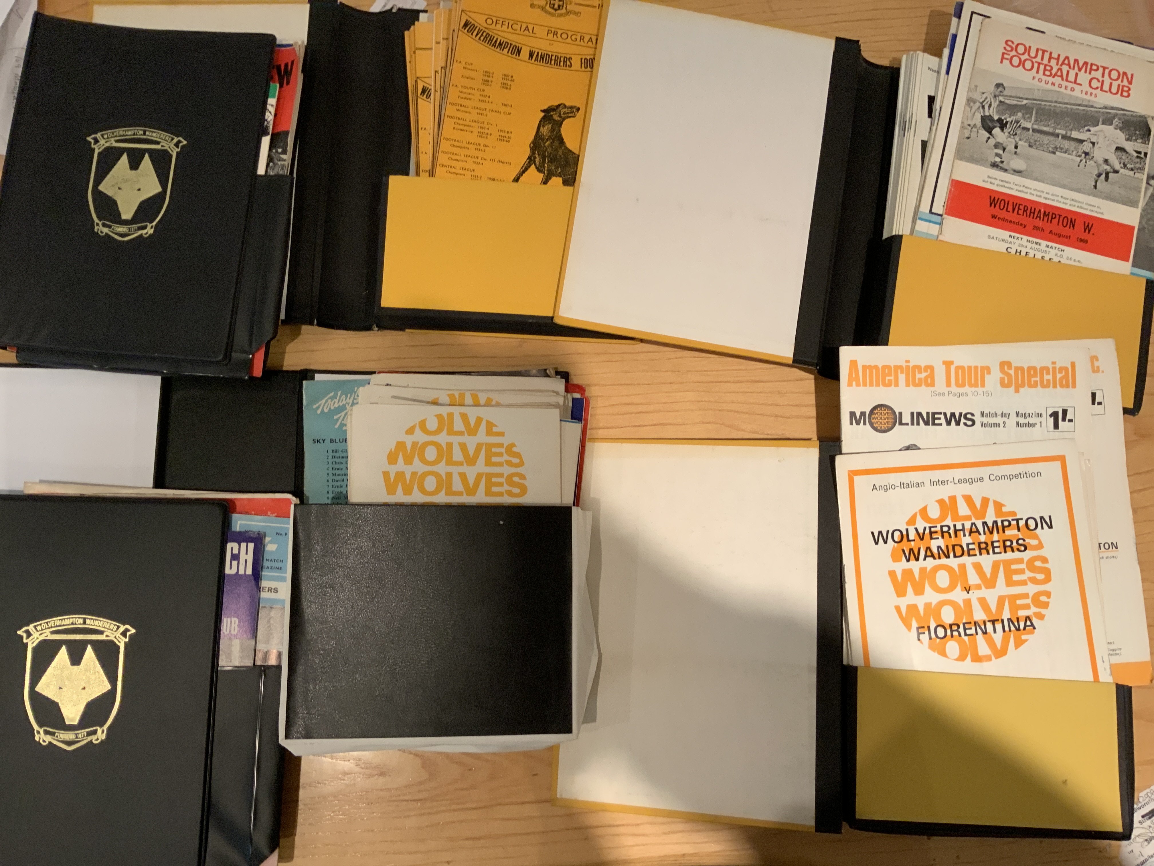 Wolves Football Programmes: Probable complete sets of homes from 66/67 to 77/78 in 14 official binders. C/W some sets of aways from the late 60s. Some great tickets to include 68/69 aways at Hull, QPR Tottenham league and cup. Home tickets include European homes and many more. (box)