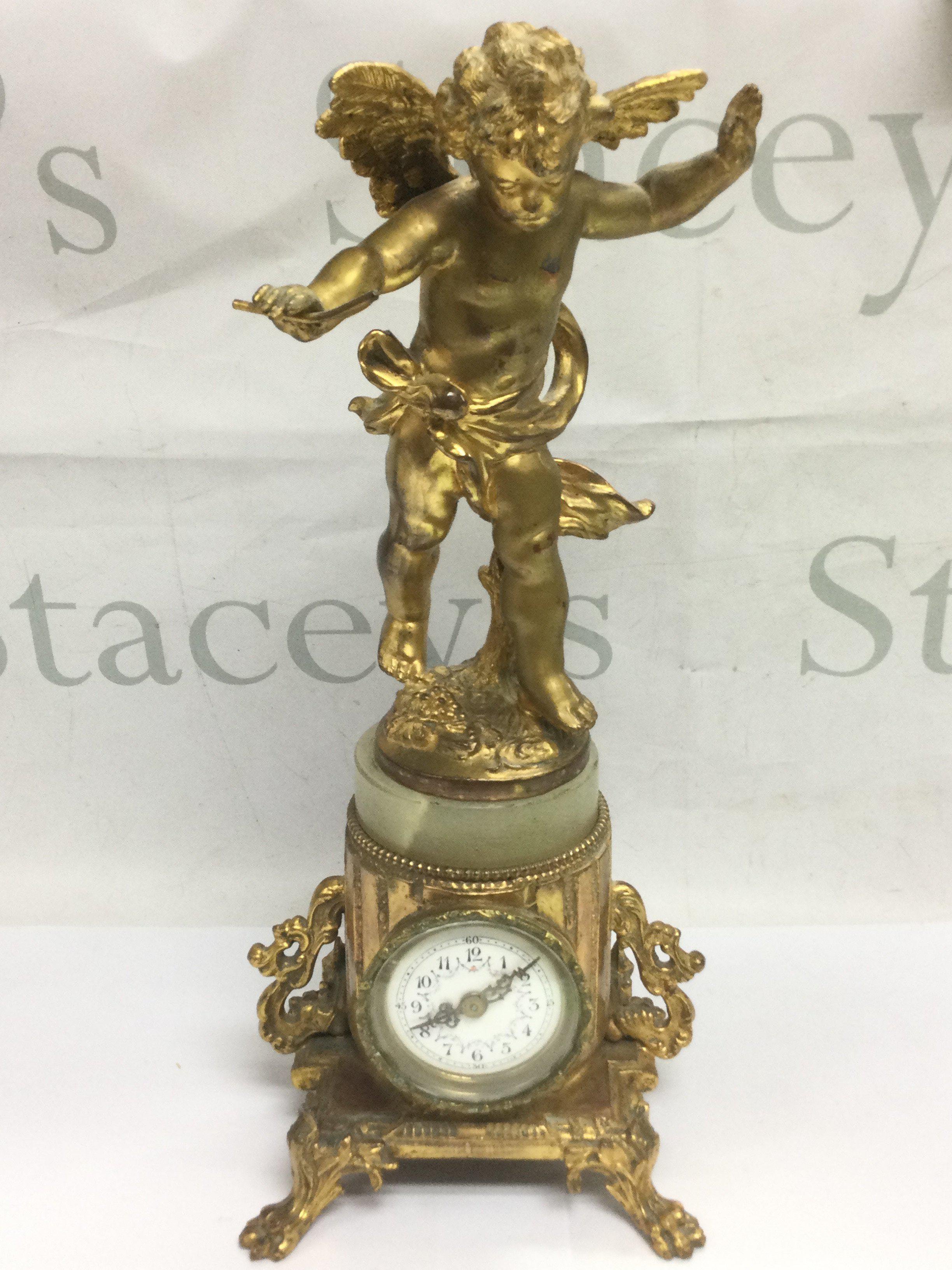 A gilt figural clock surmounted by a standing cherub, later movement, approx height 35cm. Shipping category D.