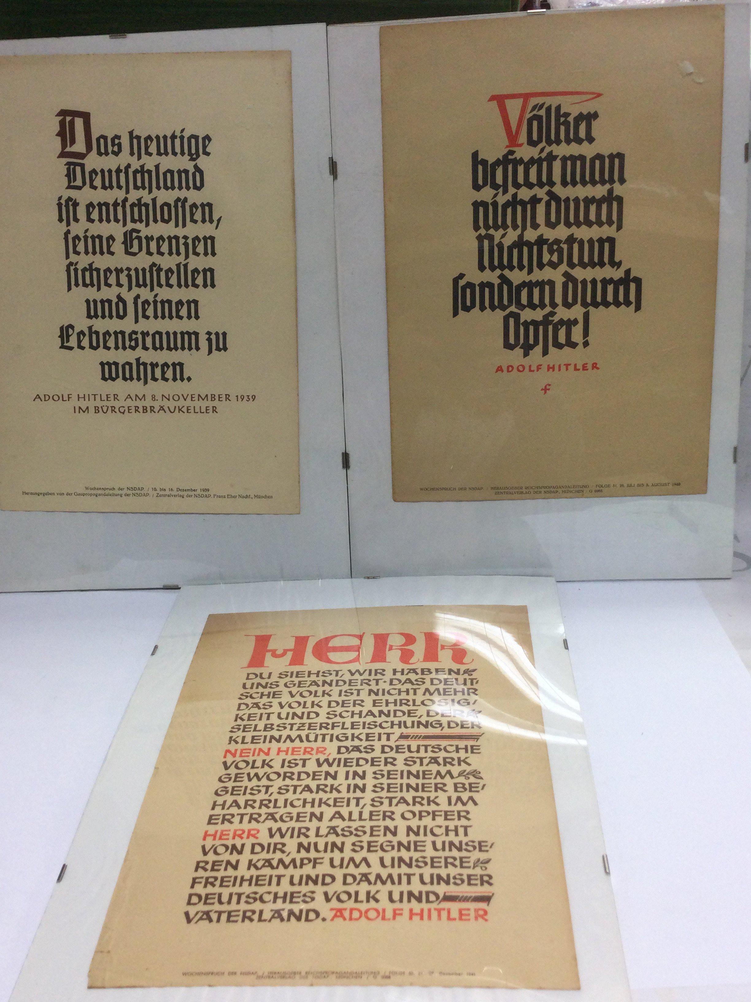 Three Nazi propaganda posters, approx 24cm x 34cm excluding frames. Shipping category B.