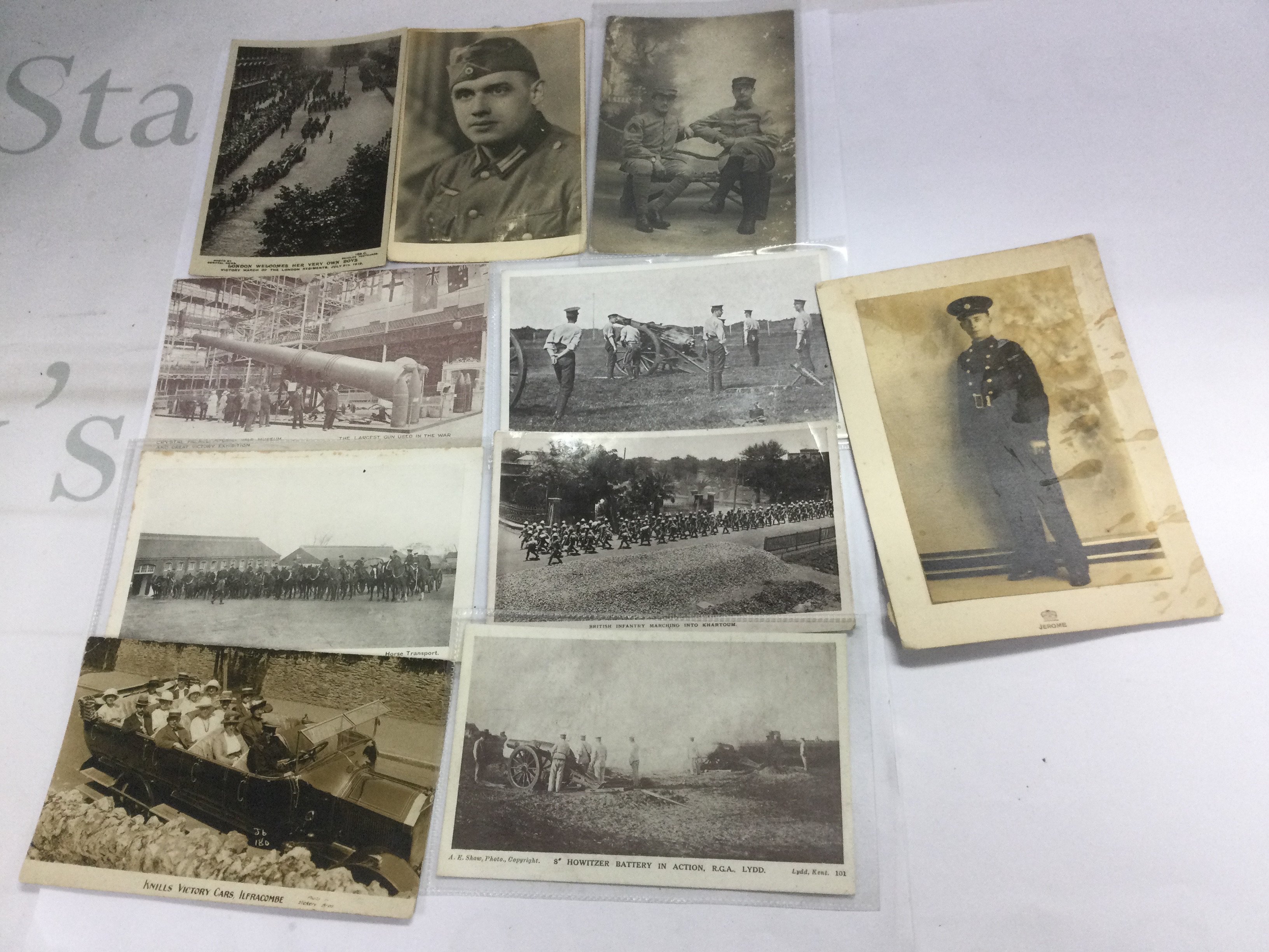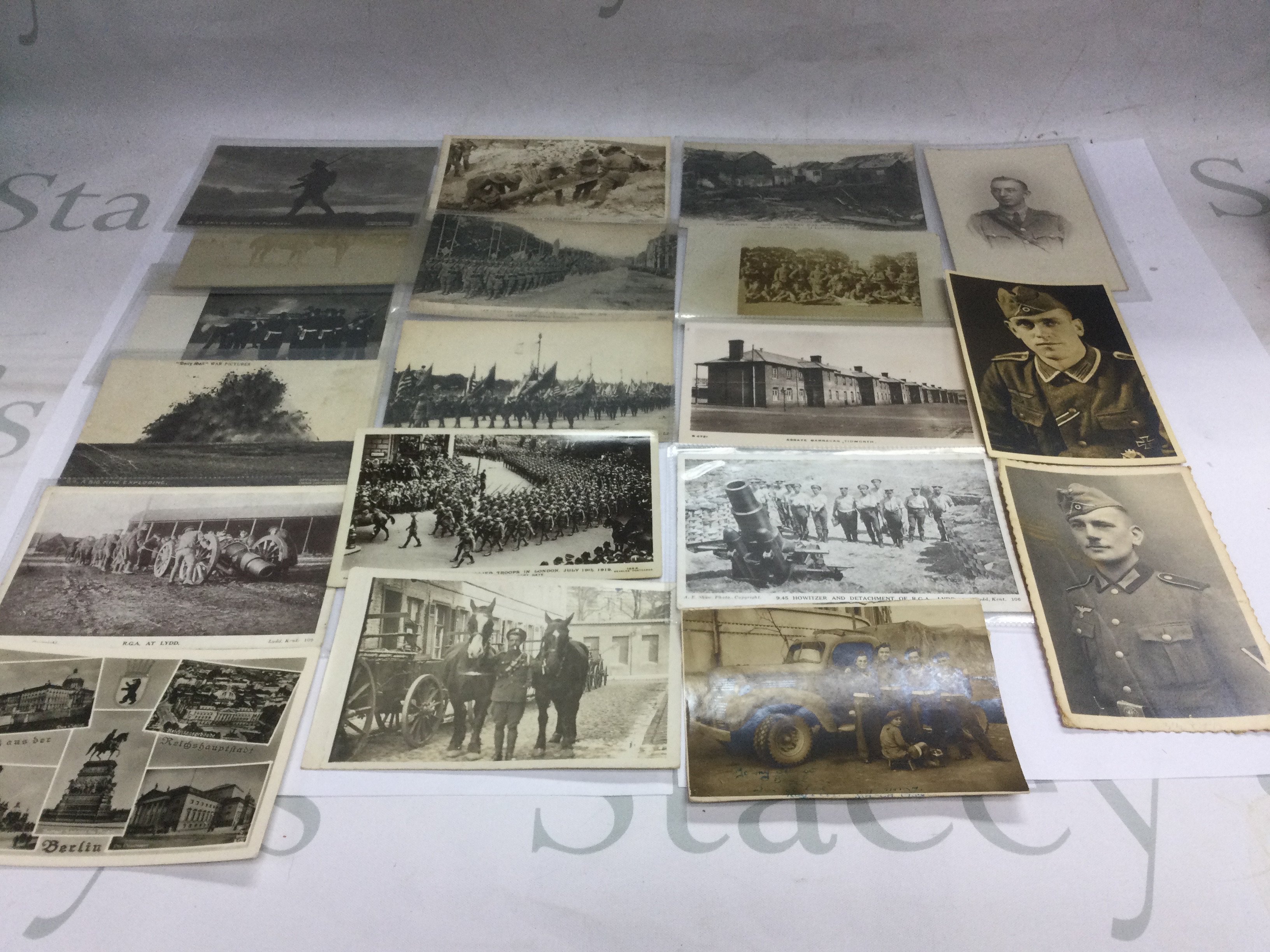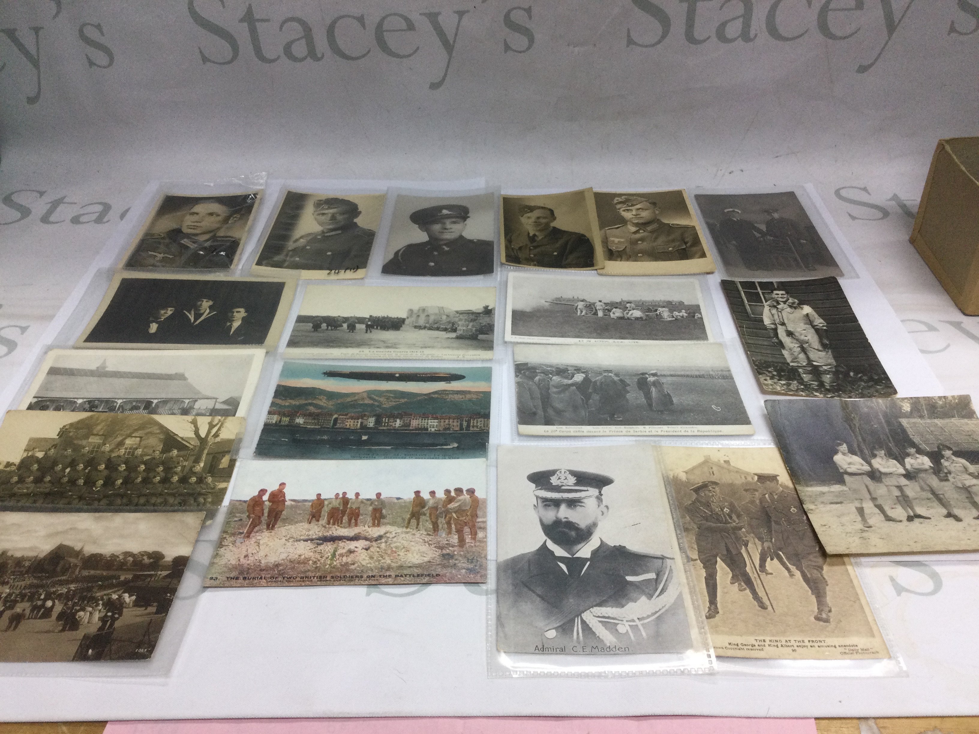 A box of military postcards and photos from both World Wars. Shipping category B.