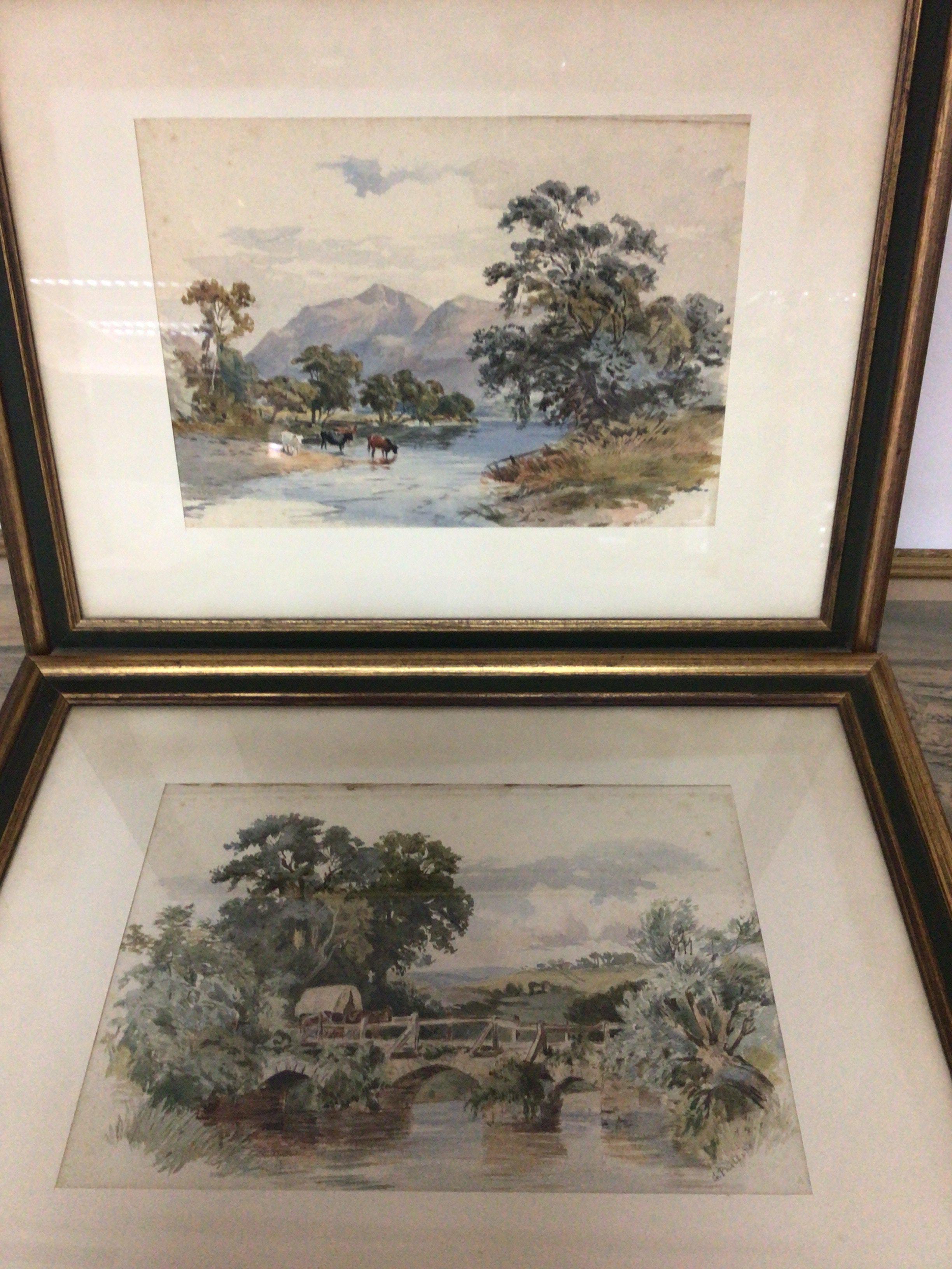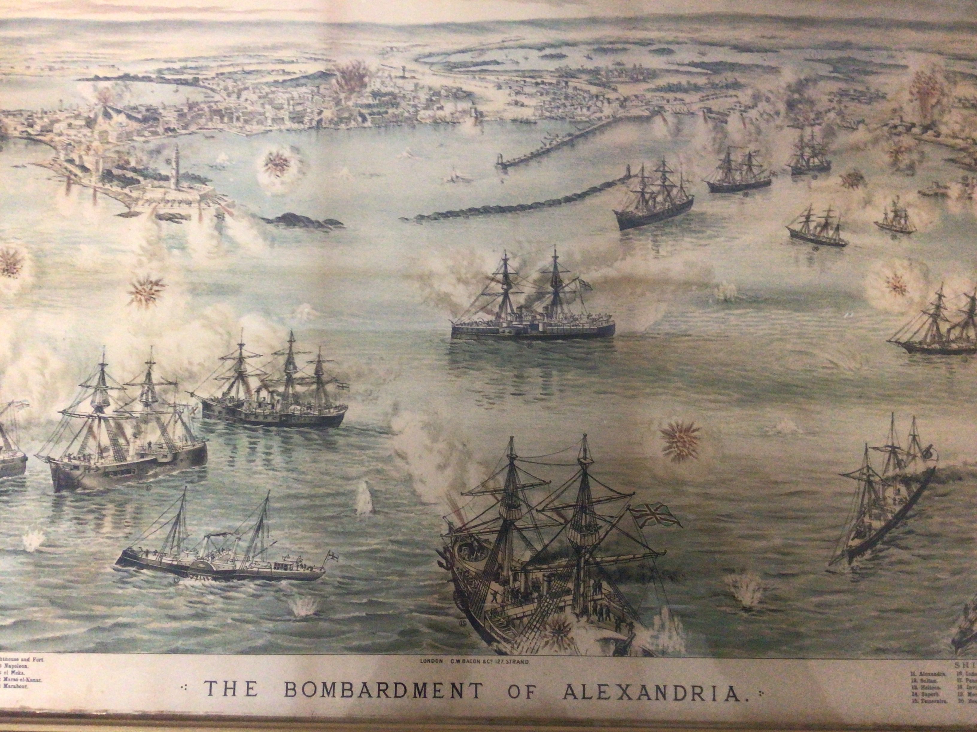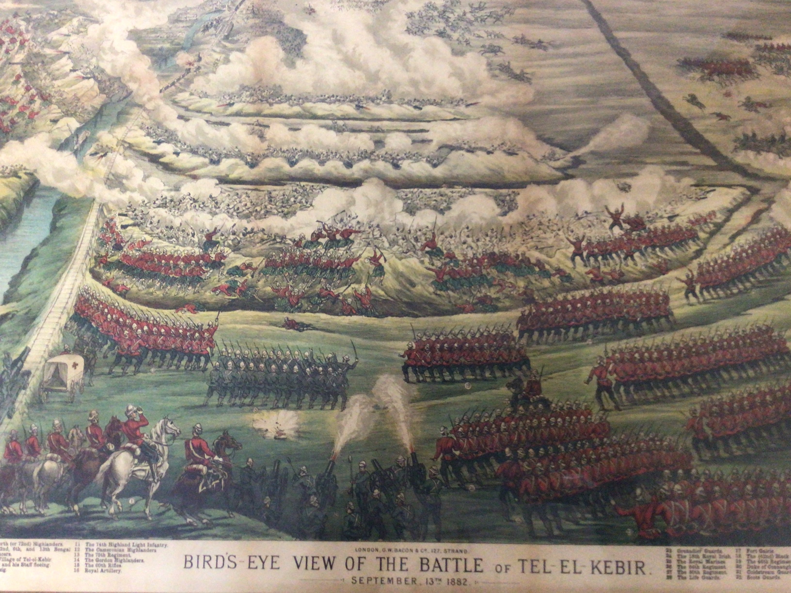 A late Victorian Military print a Birds Eye view of the battle of Tel-El-Kebir 1882 one other military print The Bombardment of Alexandria and three watercolours one attributed to John Snelling. (5)