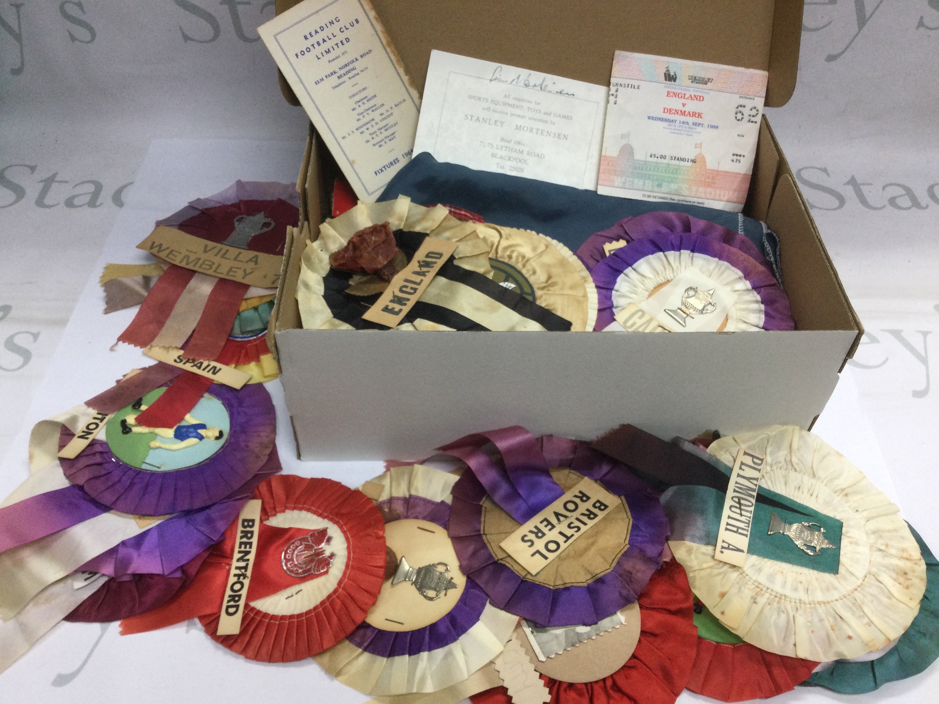 A box containing football memorabilia comprising rosettes, programs, a signed Stan Mortensen business card, tickets etc. Shipping category B.