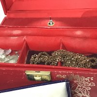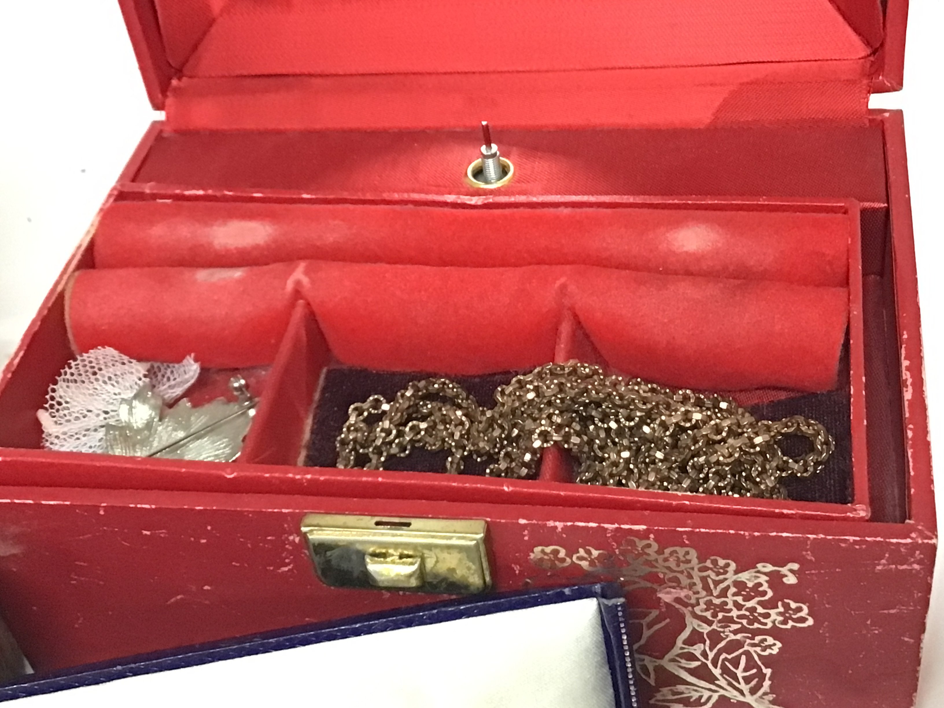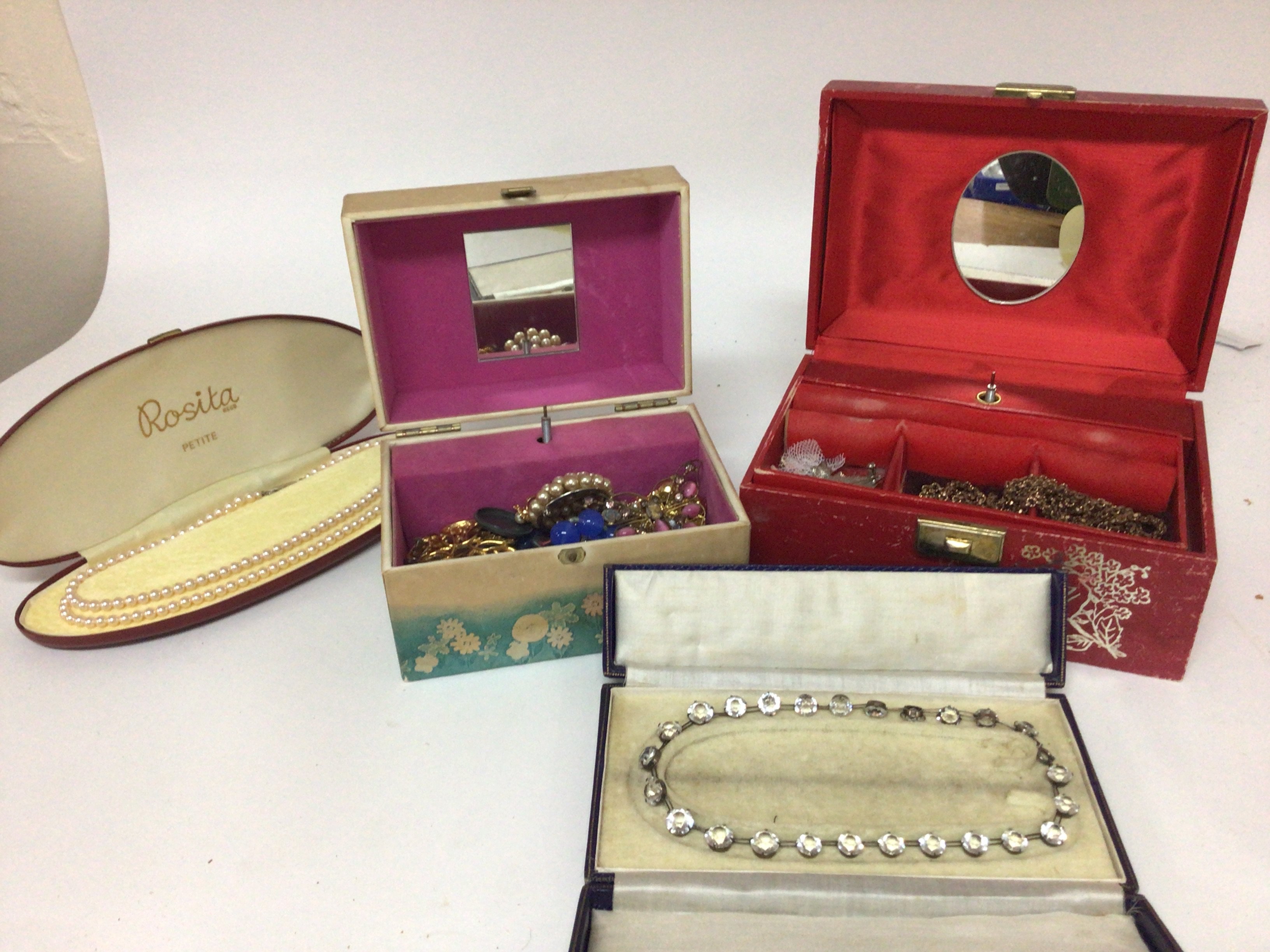 A collection of costume jewellery including a cased vintage crystal necklace brooches and a long guard chain and other ornaments.