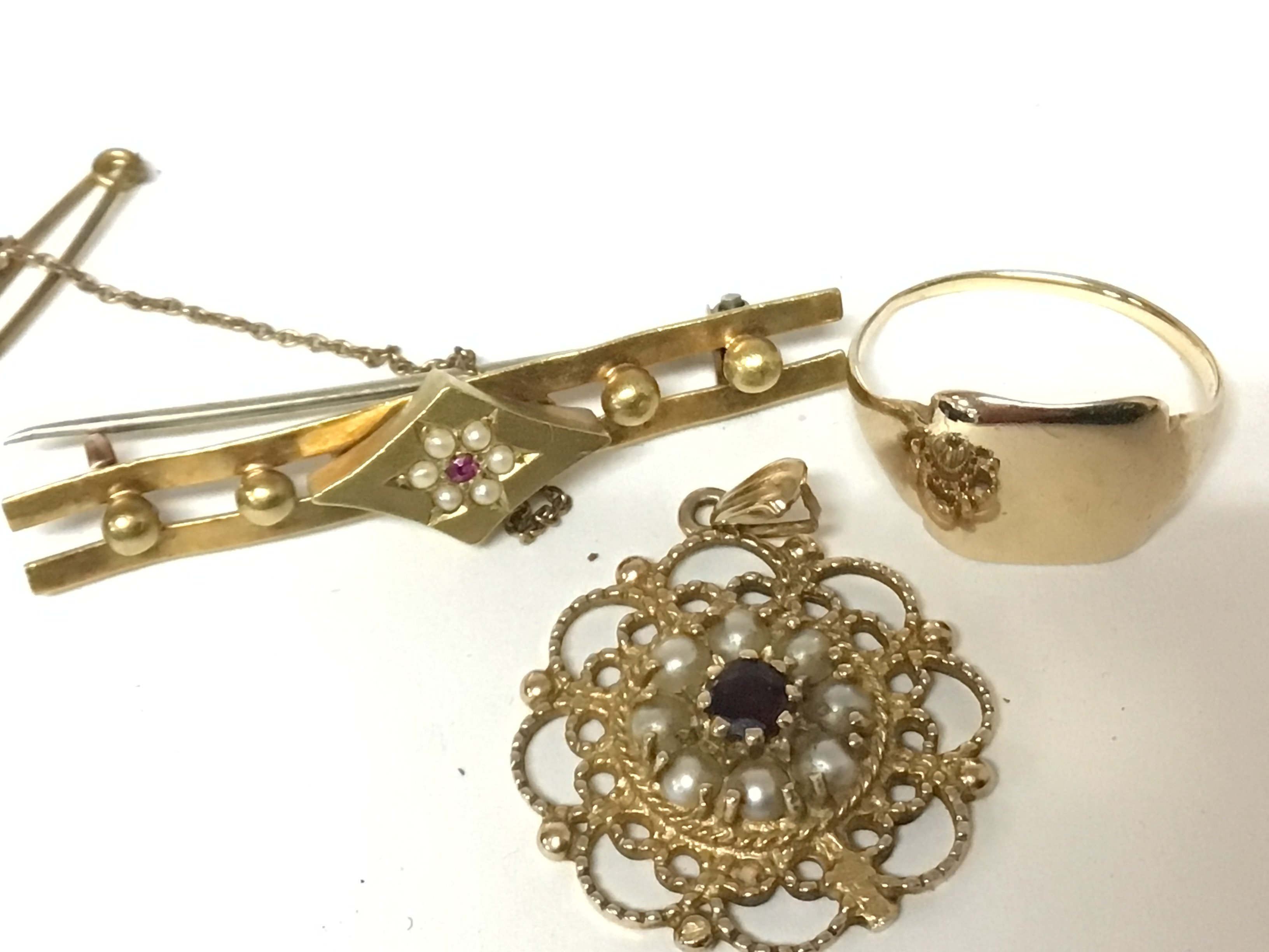 A gold ring and two brooches one with a steel pin all unmarked yellow metal. Total weight 11g.