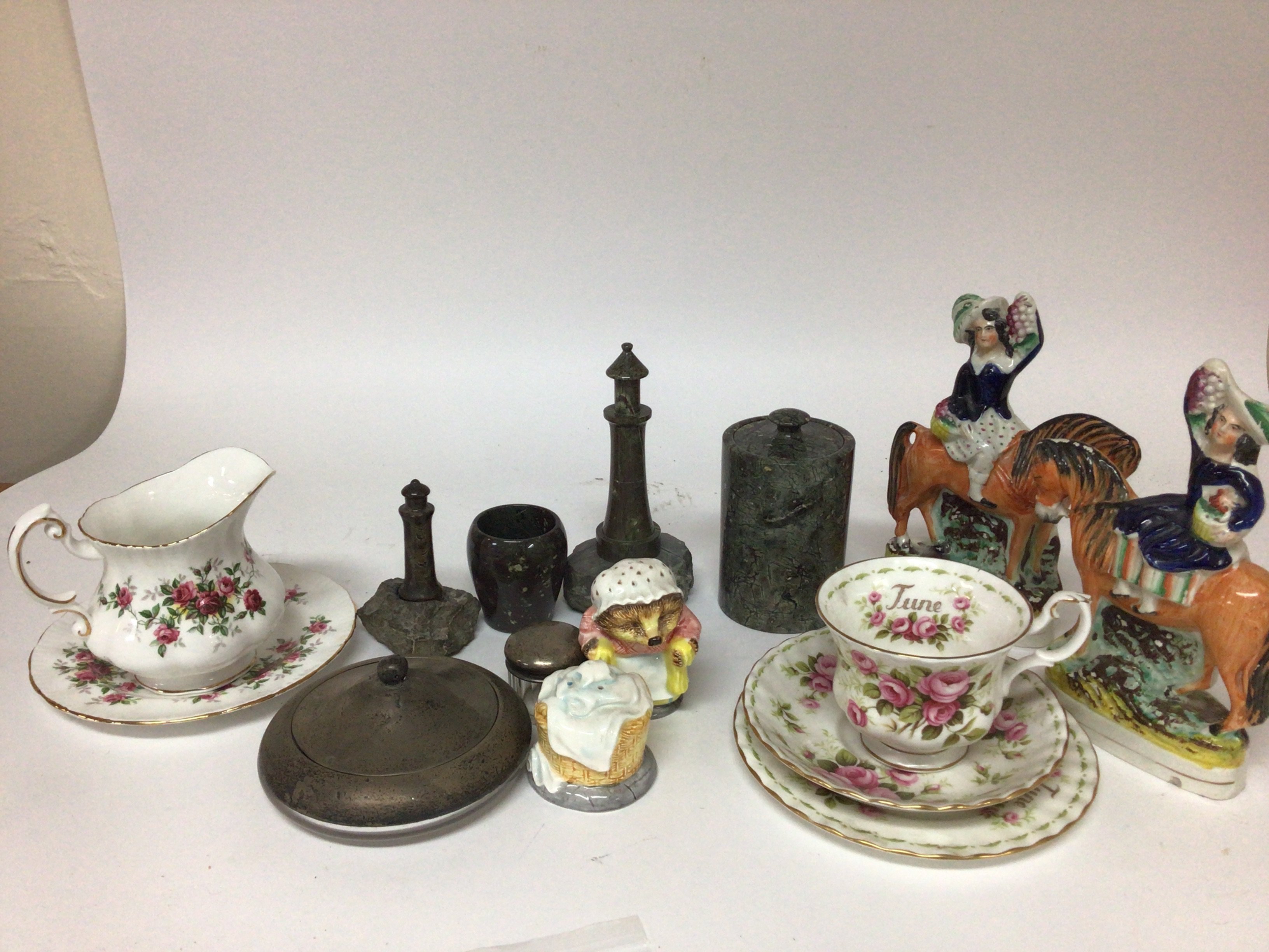 A collection of Royal Albert porcelain a pair of Victorian hand painted Staffordshire figures Serpentine marble two silver mounted jars and other ornaments.