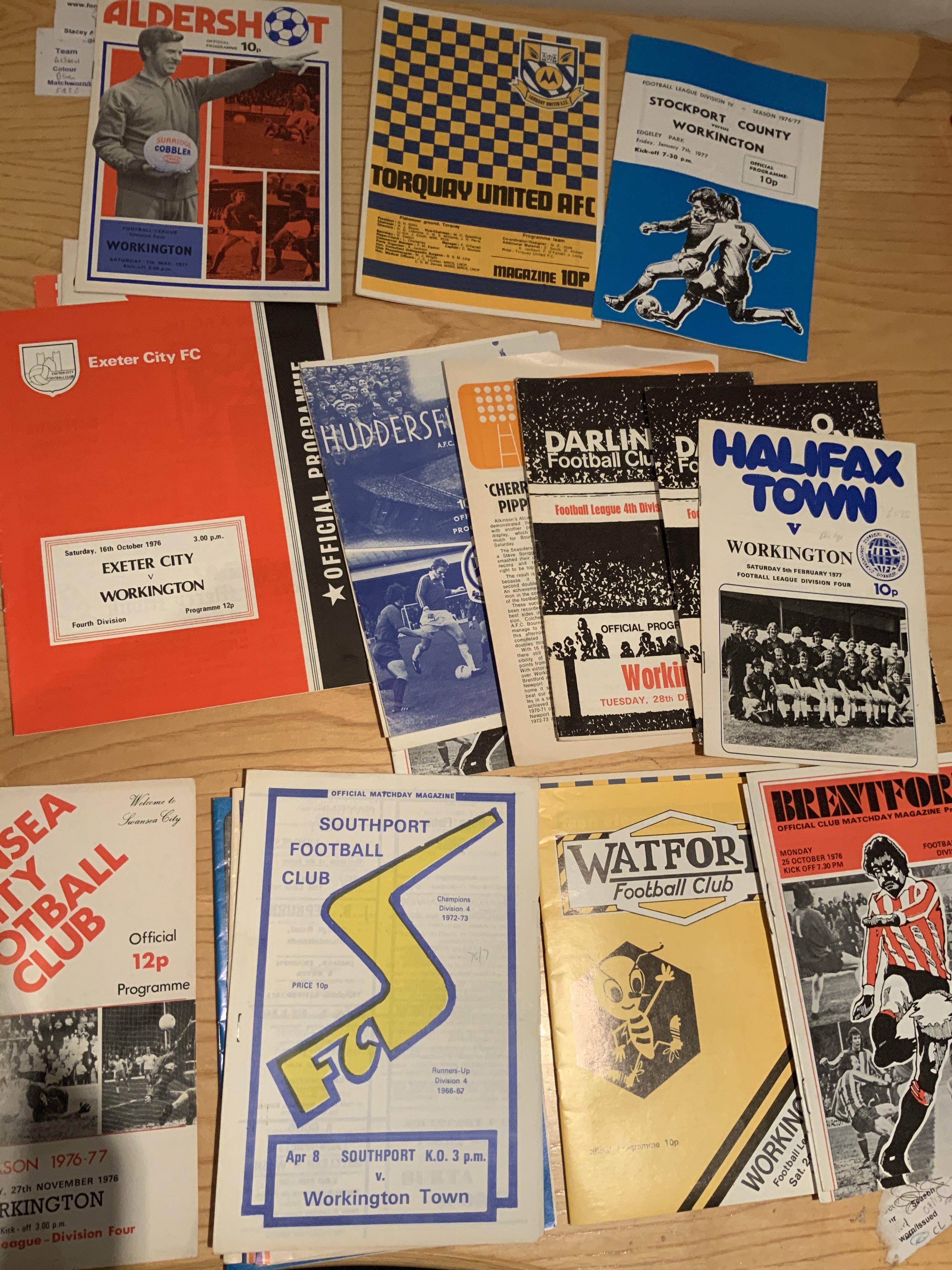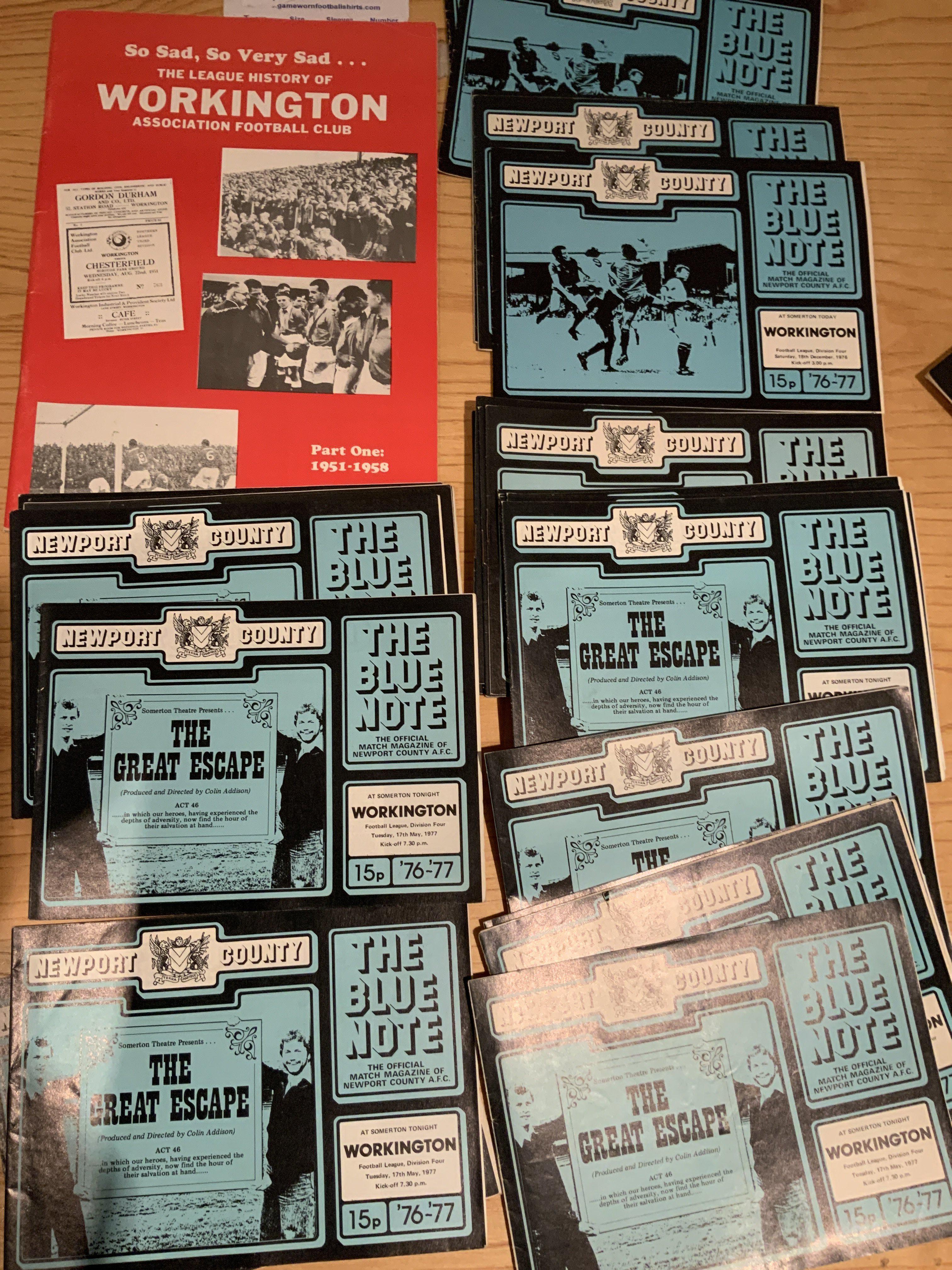 1970s Workington Football Programmes: 76/77 large homes from last season in the league and 77/78 first season in the Northern Premier League. Both sets look mint and complete. C/W possible complete season of 76/77 aways and incredibly for Newport County there are 6 postponed dated 18/12/76 and 28 of the played match on 17/5/77 which was the last match in division four. Excellent. (100+)