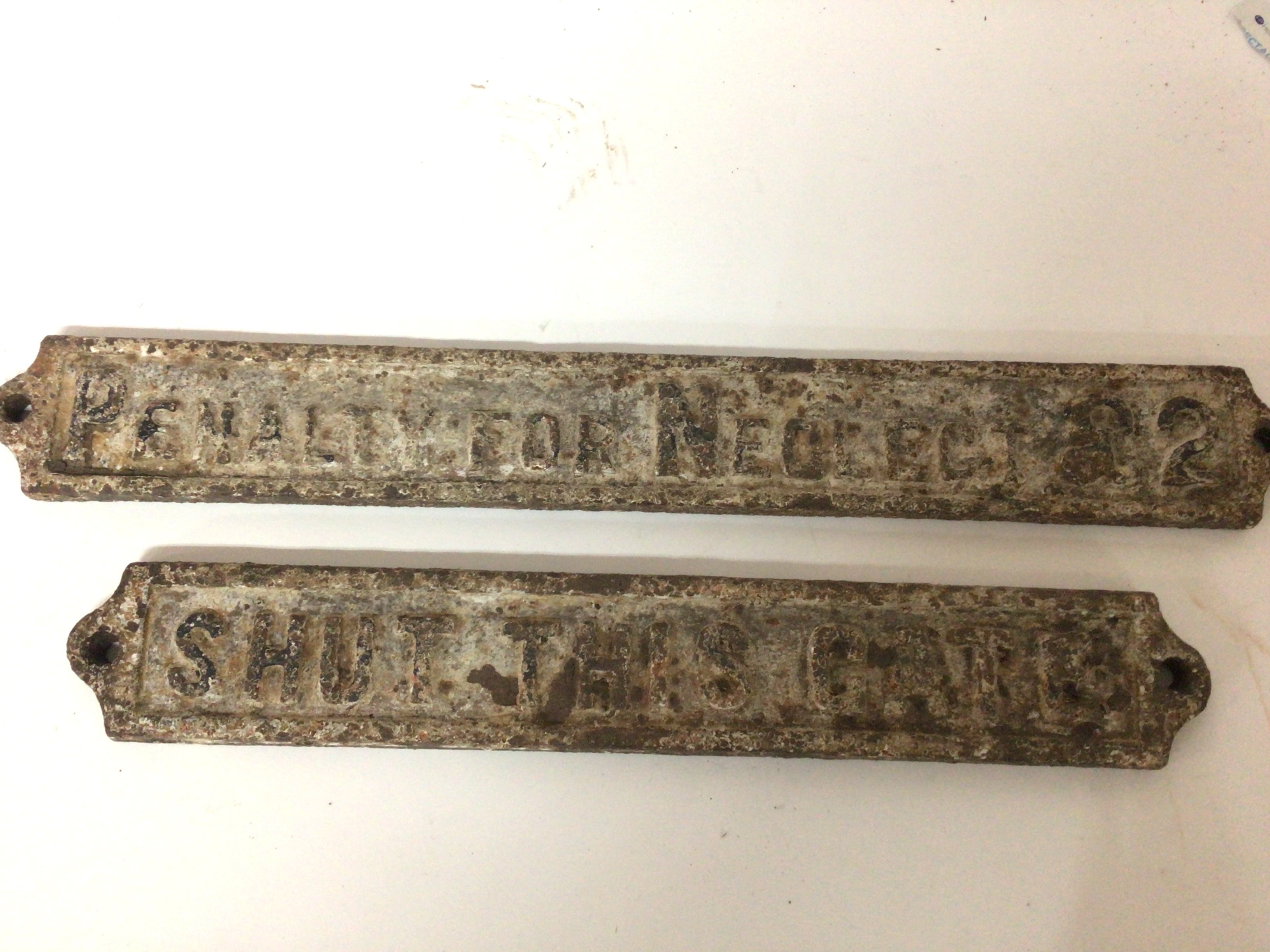 Two Genuine Railway cast iron railway gate sings Shut the gate and Penalty for Neglect £2 from a field crossing gate from the Scarborough York line near Kirkham Abbey. The signs possibly of North Eastern Railway origin. (2) length 52cm