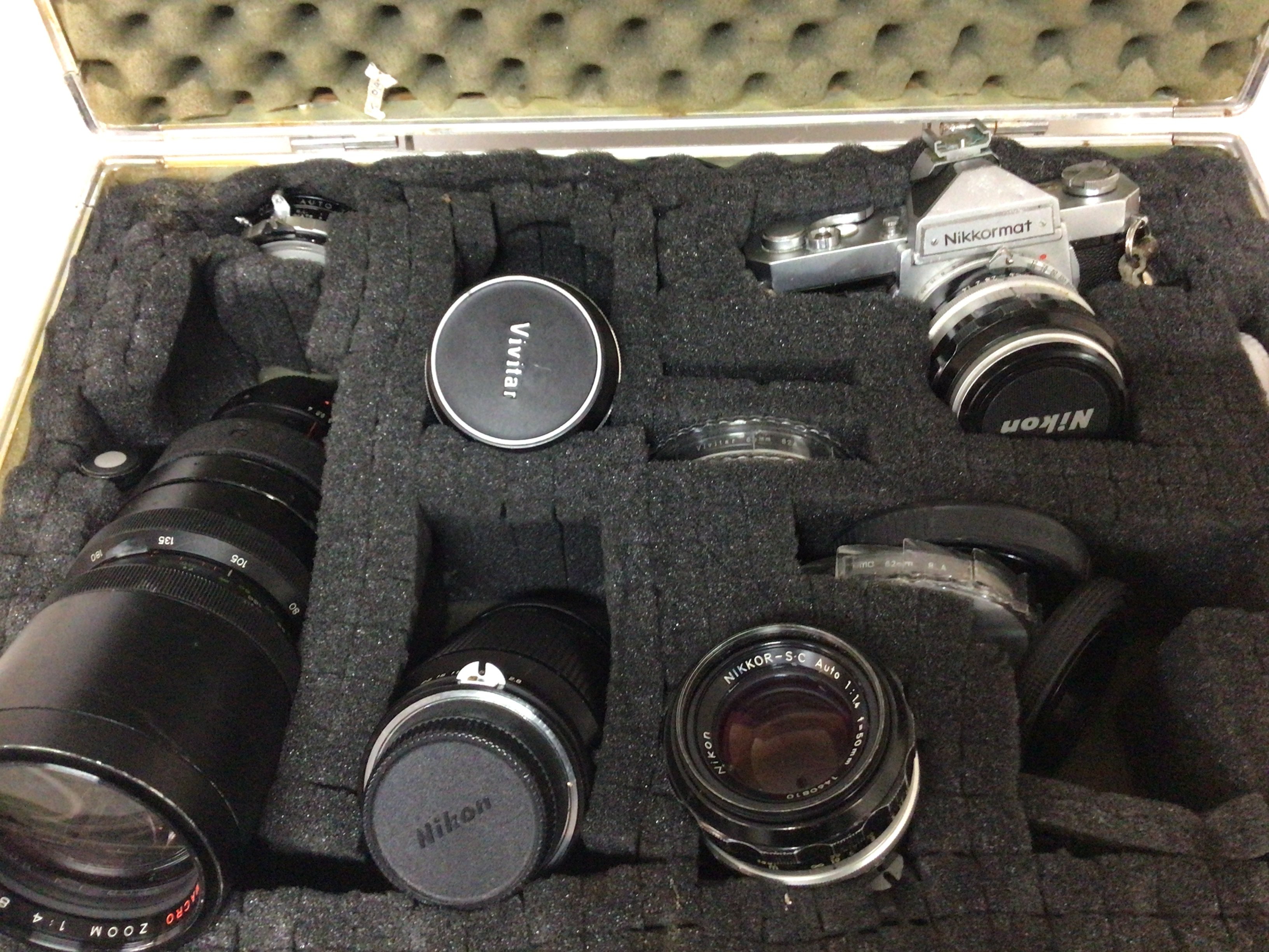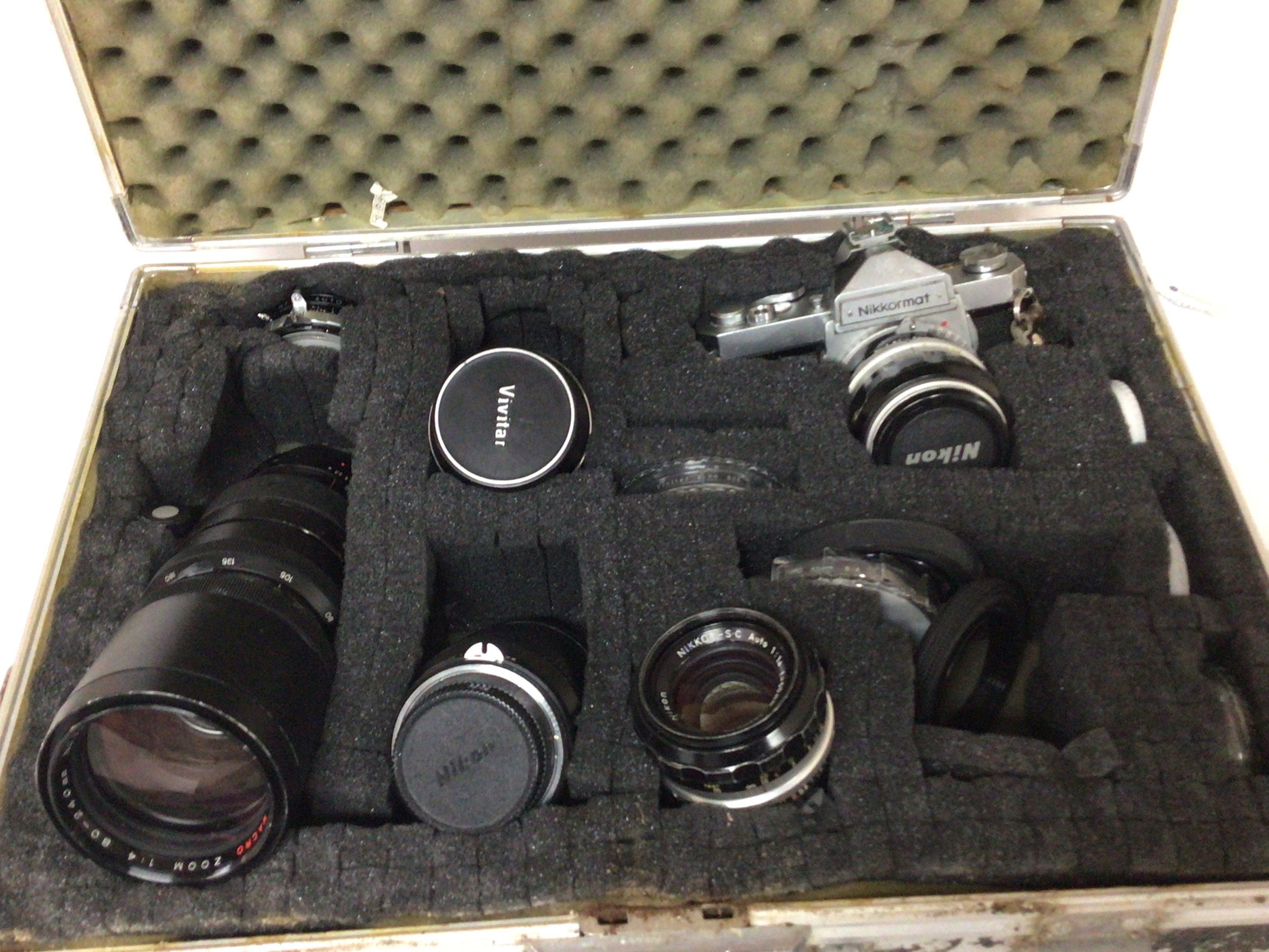 A Nikkormat camera and other Nikon telescopic lens and others in a fitted case.