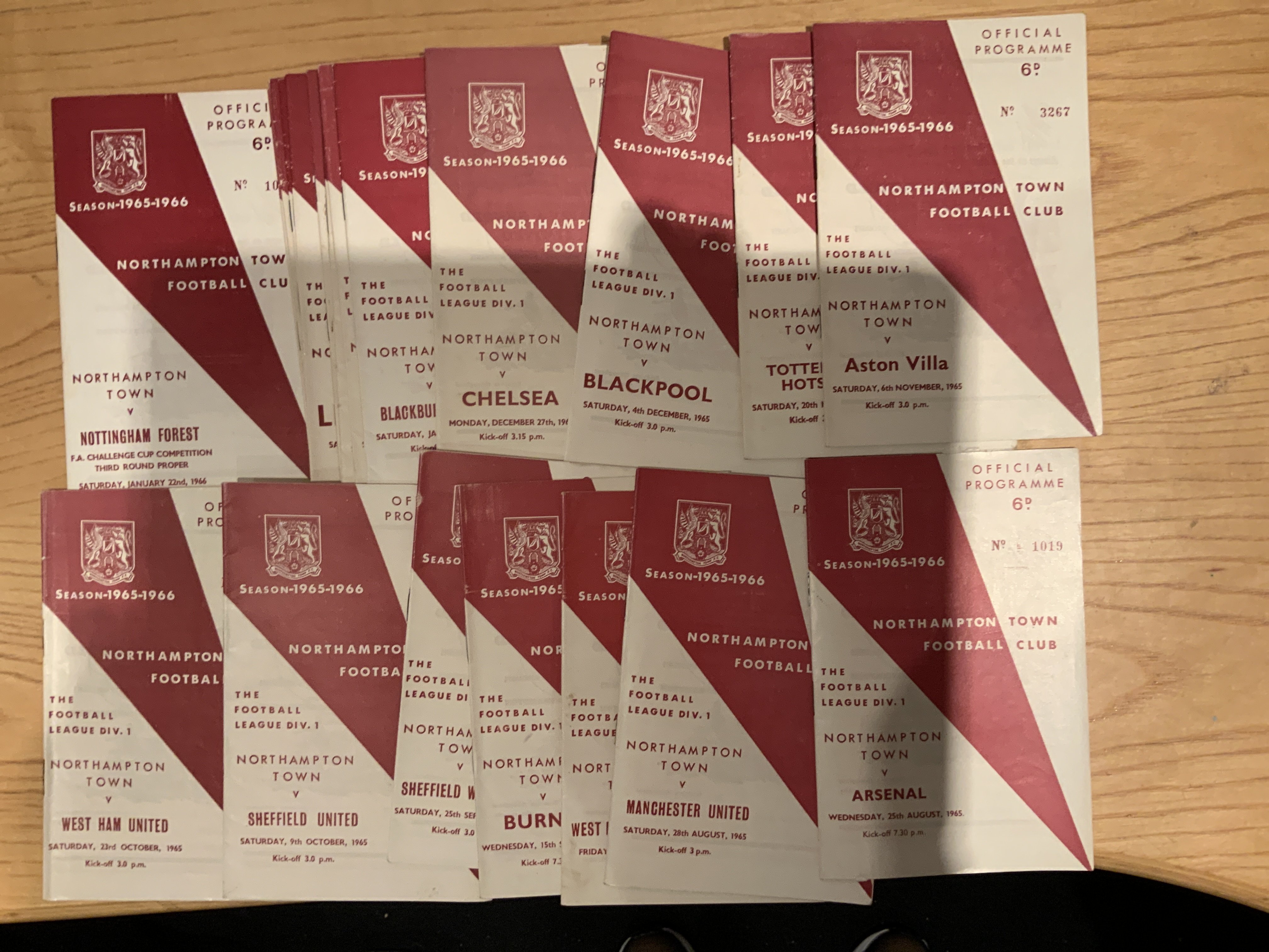 65/66 Northampton Town Complete Home Football Programmes: First and only season in division one to include Leeds postponed on 18 12 1965. Excellent condition to include all league plus the FA Cup match. (23)