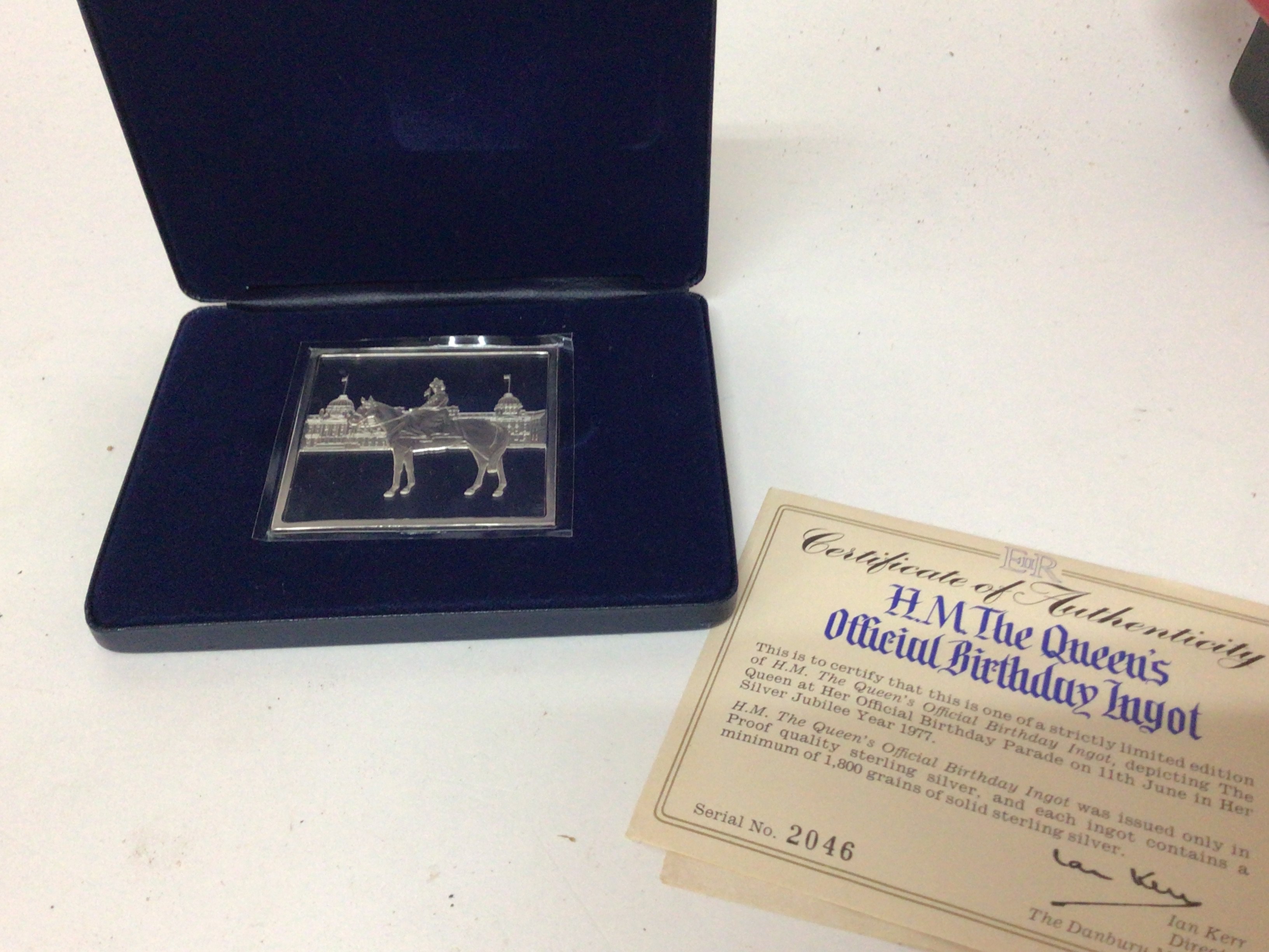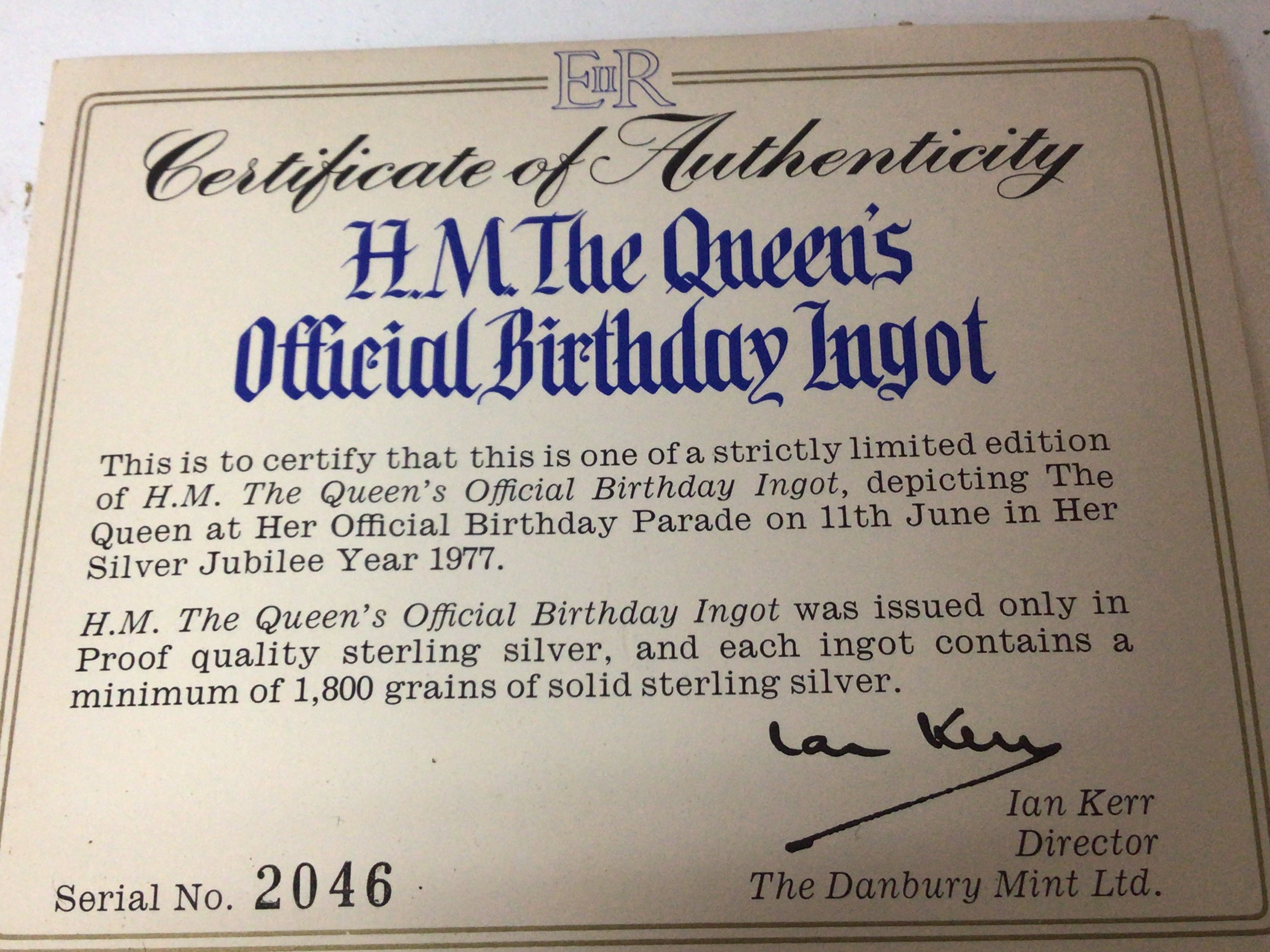 A silver 925 commemorative H M The Queen official birthday Ingot 1977 with certificate of authenticity.