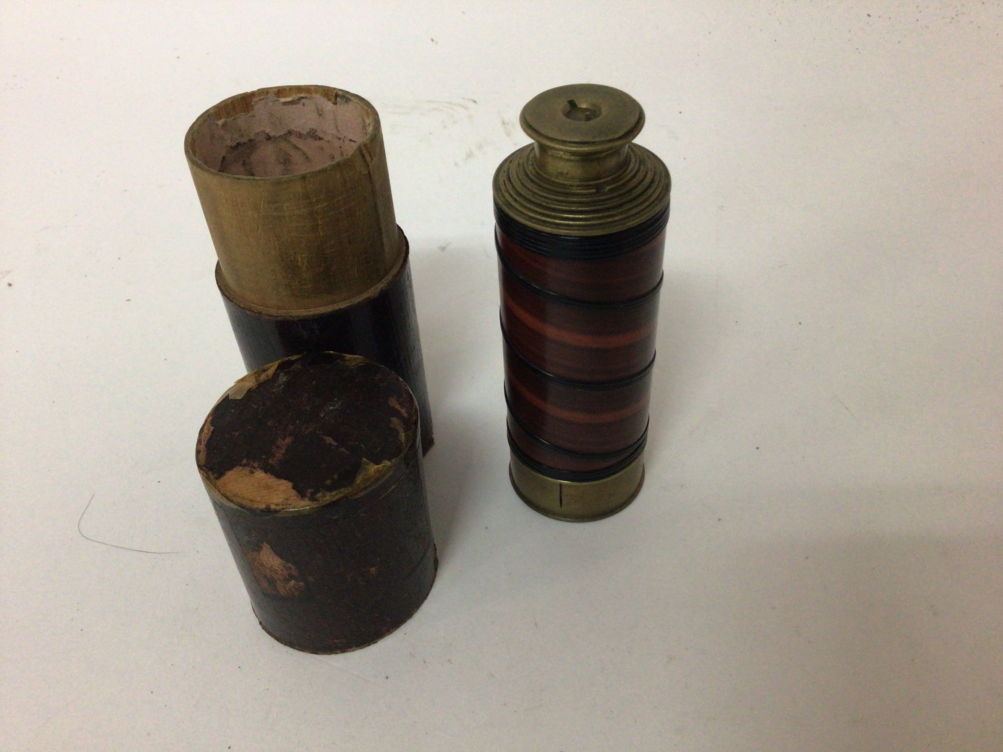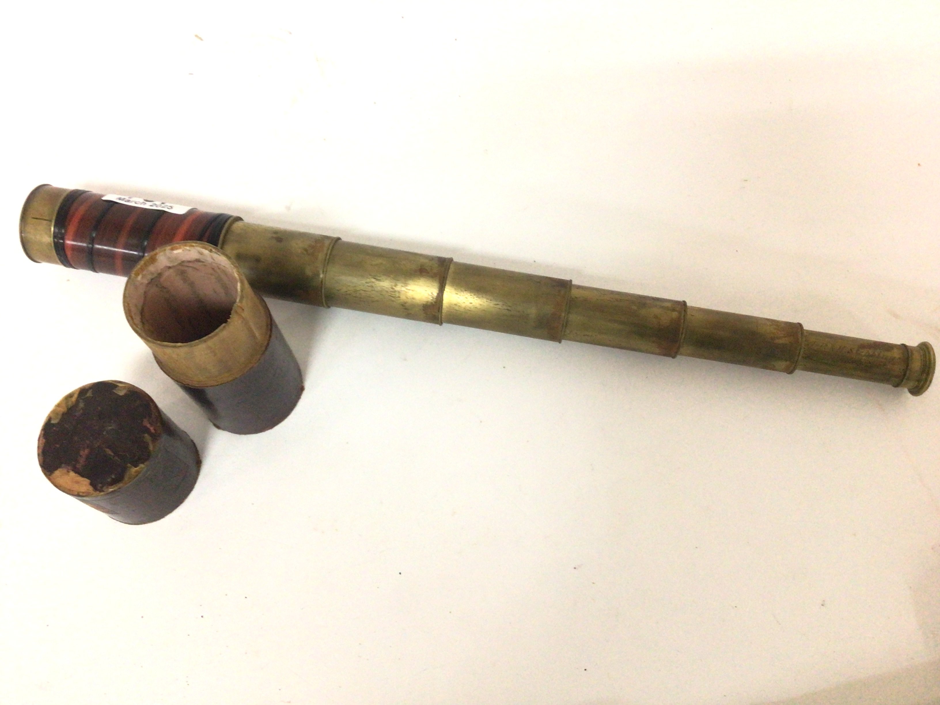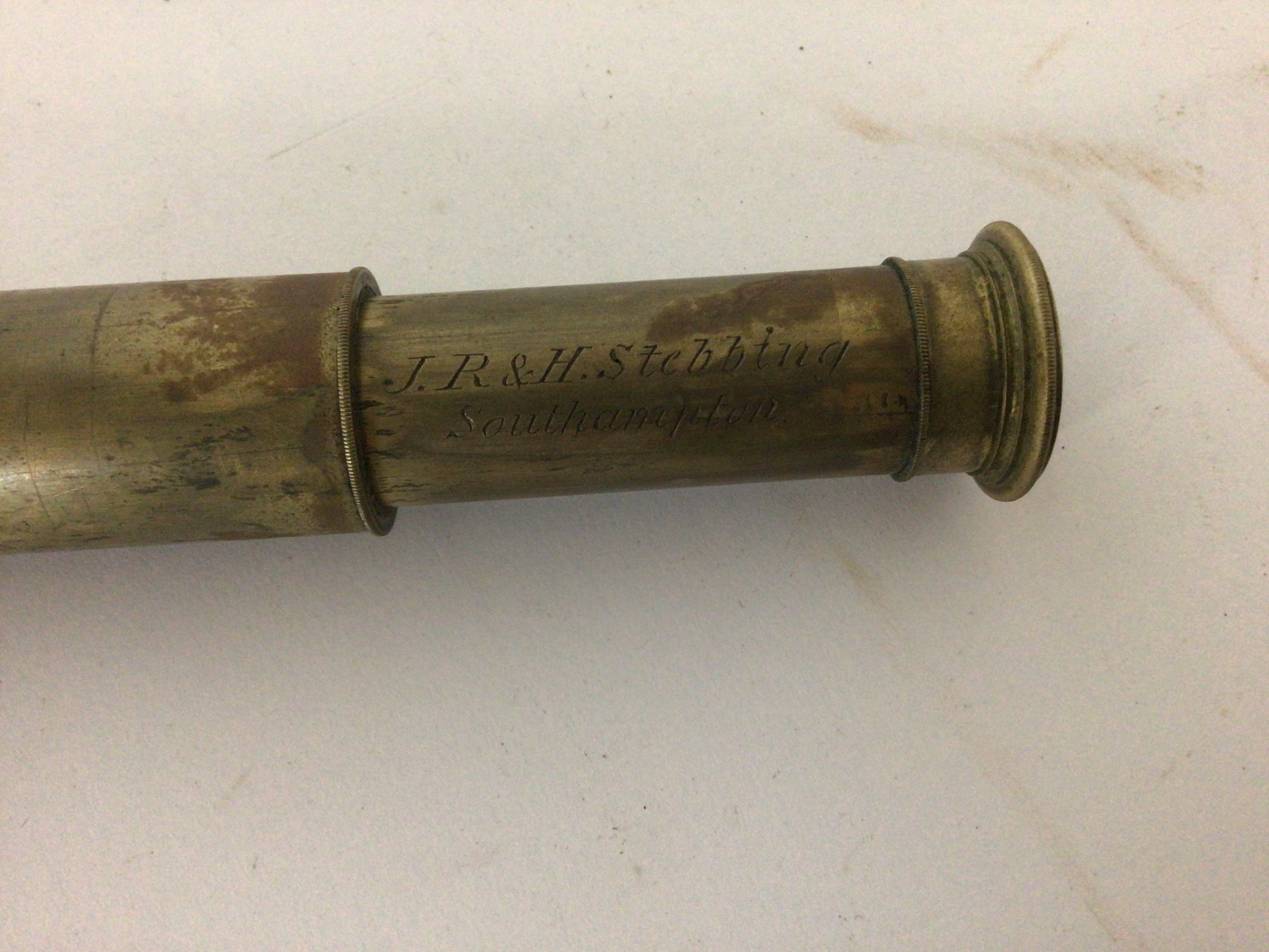 A seven drawer brass and walnut and ebony wood finish small telescope. Maker JR & H Stebbington Southampton with an outer case overall length 40cm