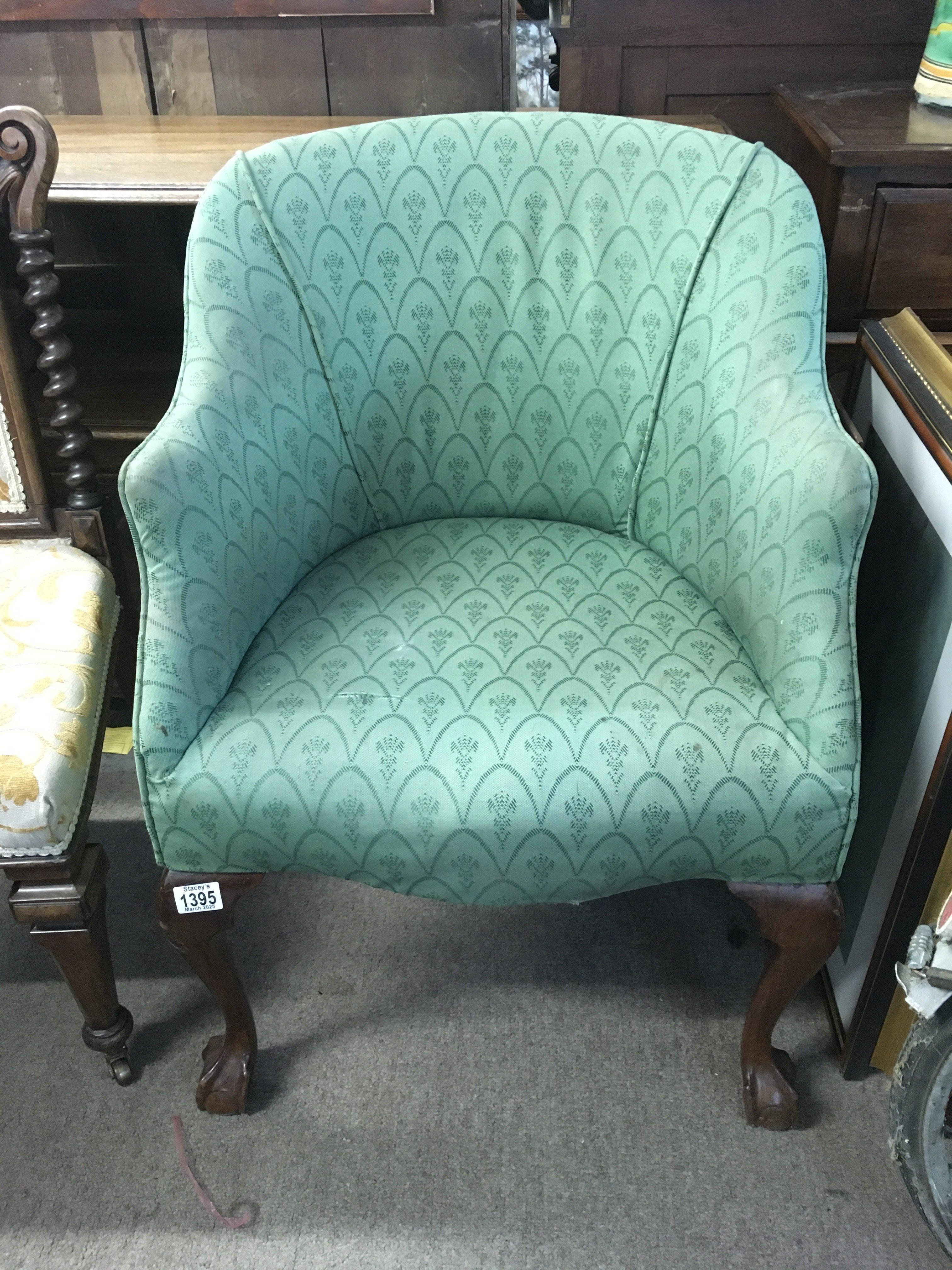 An upholstery mahogany chair with ball and claw feet.