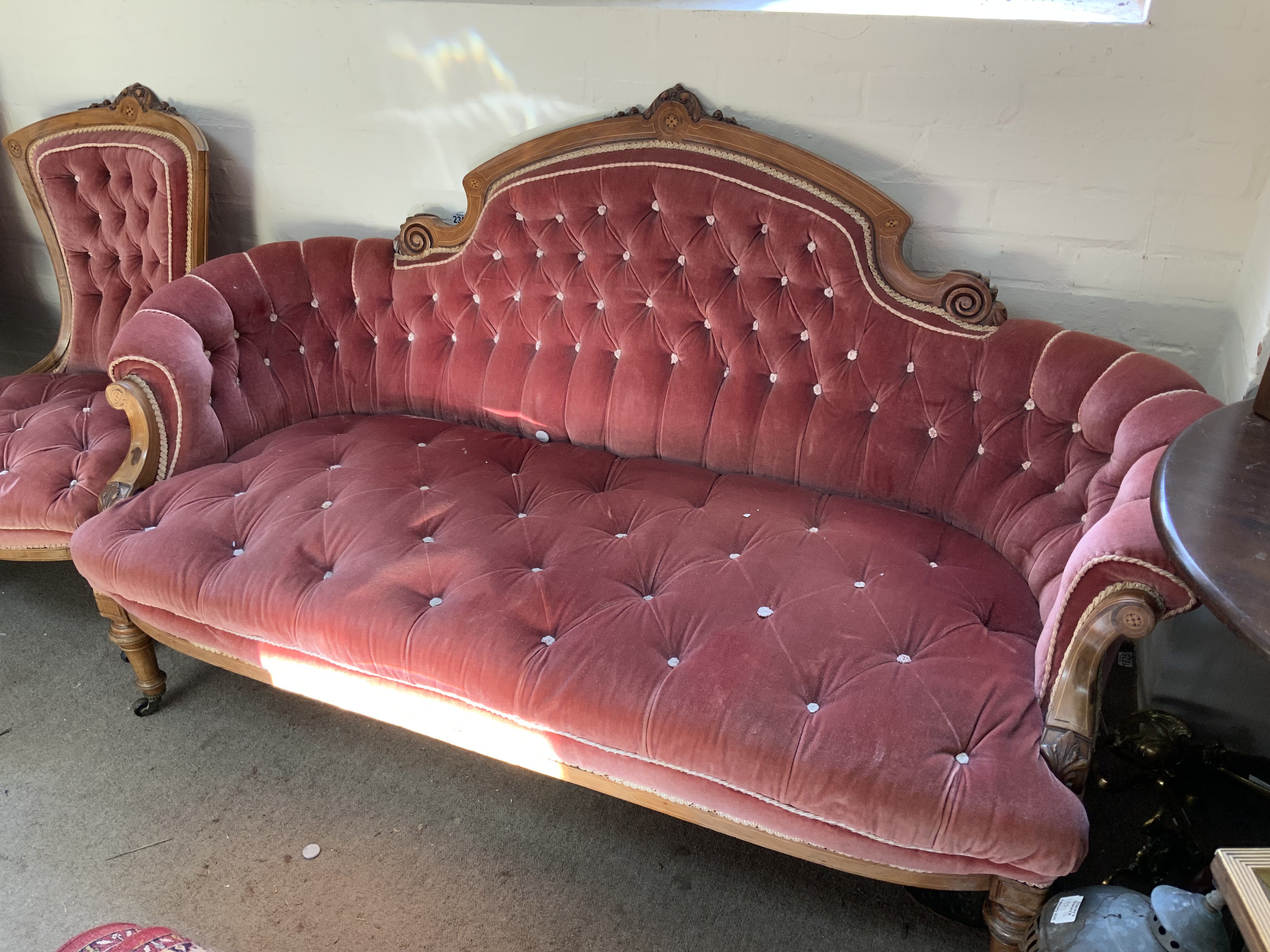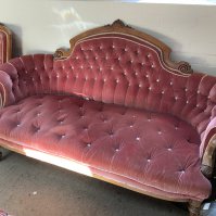 A Large Victorian upholstered sofa together with matching ladies and gents armchairs.