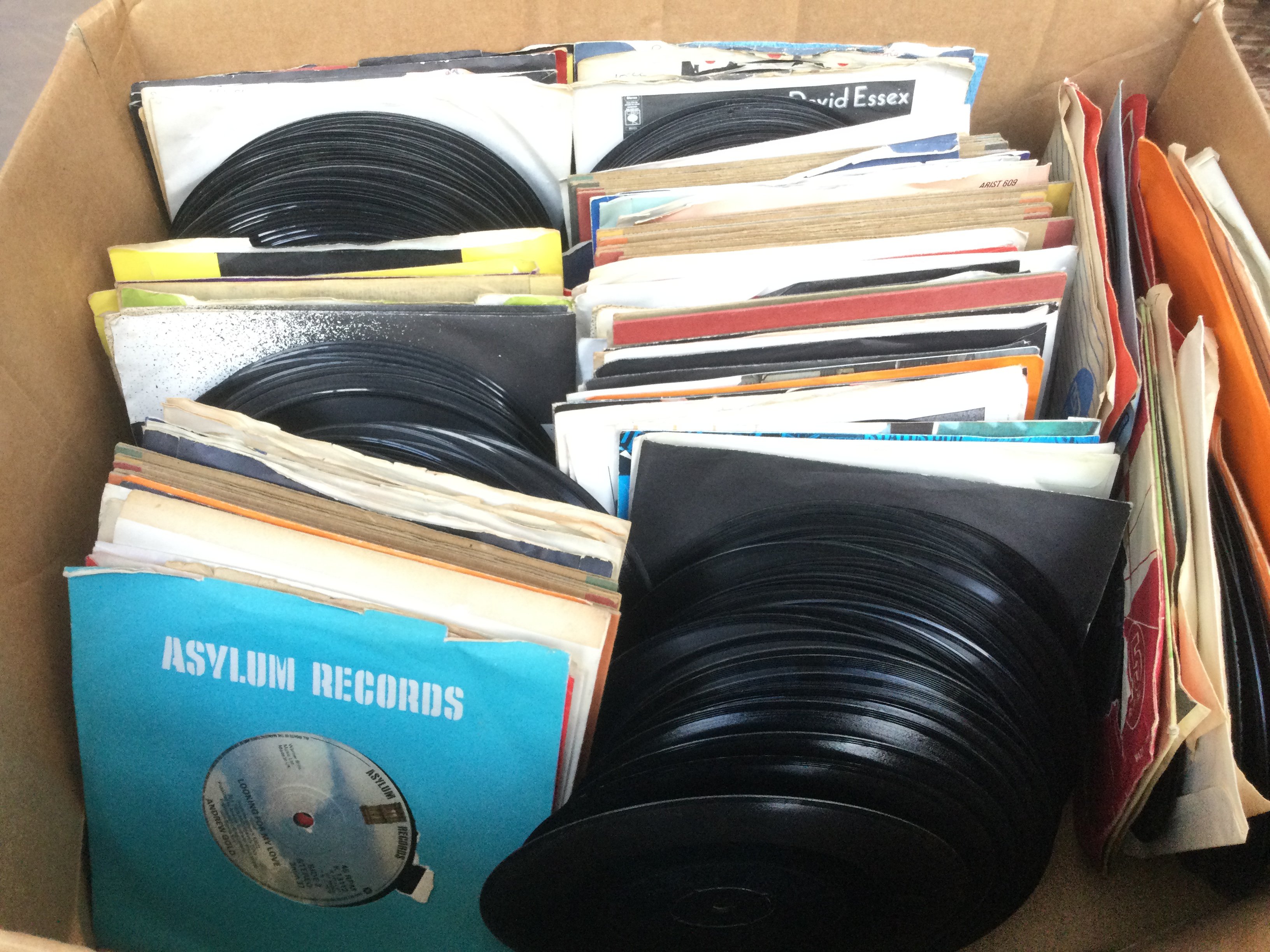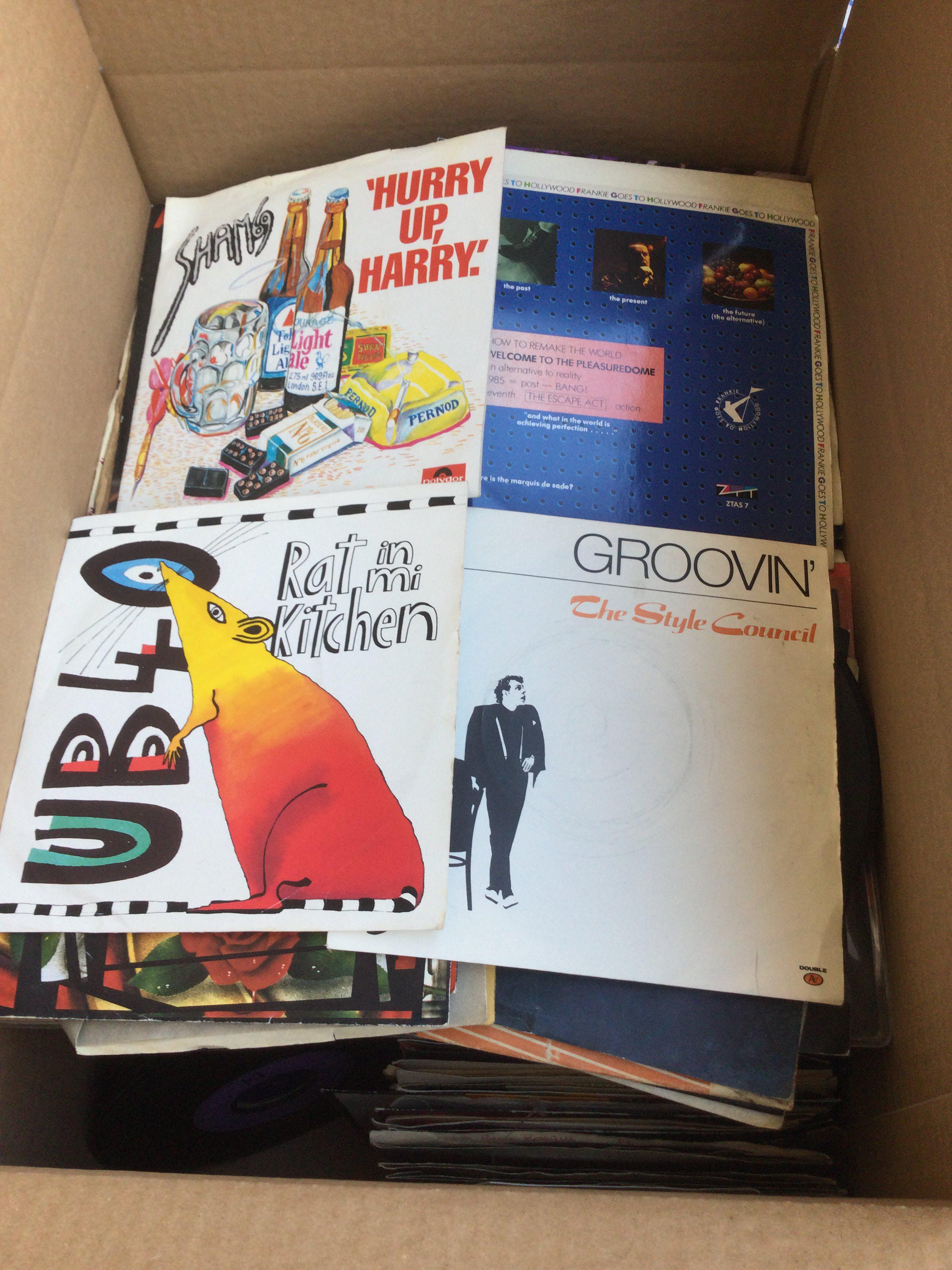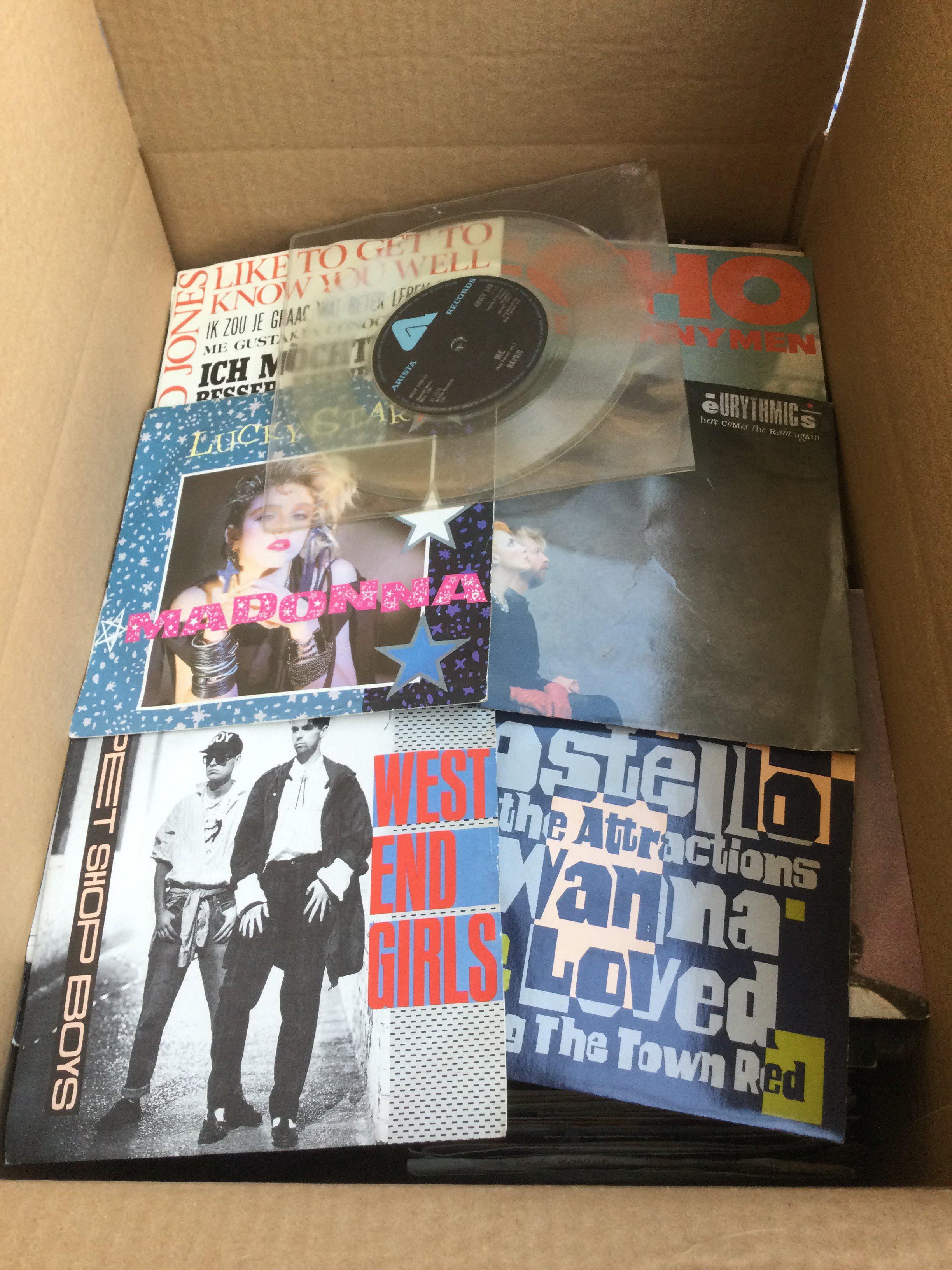 Two boxes of 7" singles by various artists from the 1960s onwards including Prince, Guns n Roses, Echo & The Bunnymen and many more.