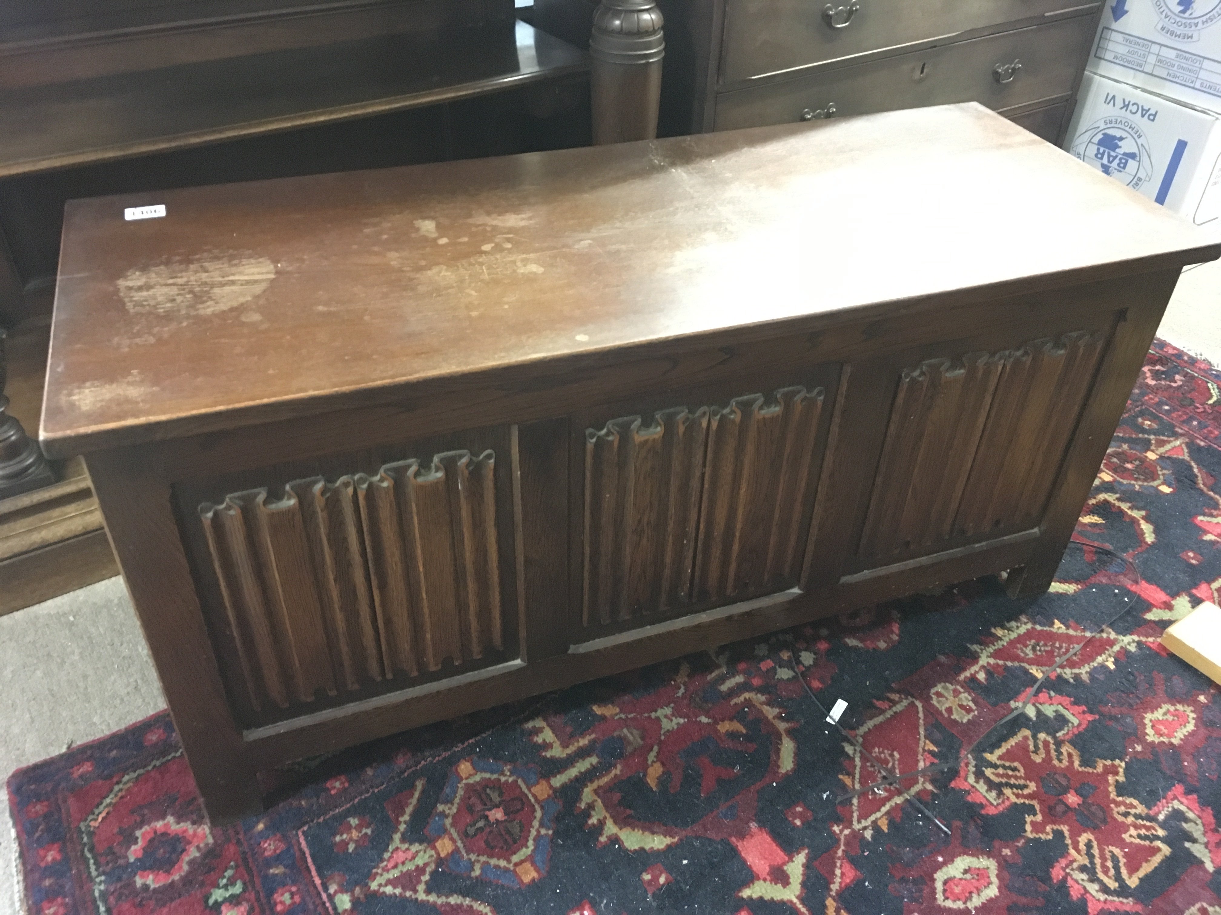 An oak lined trunk with hinged top. Approx 114cmx44cm.