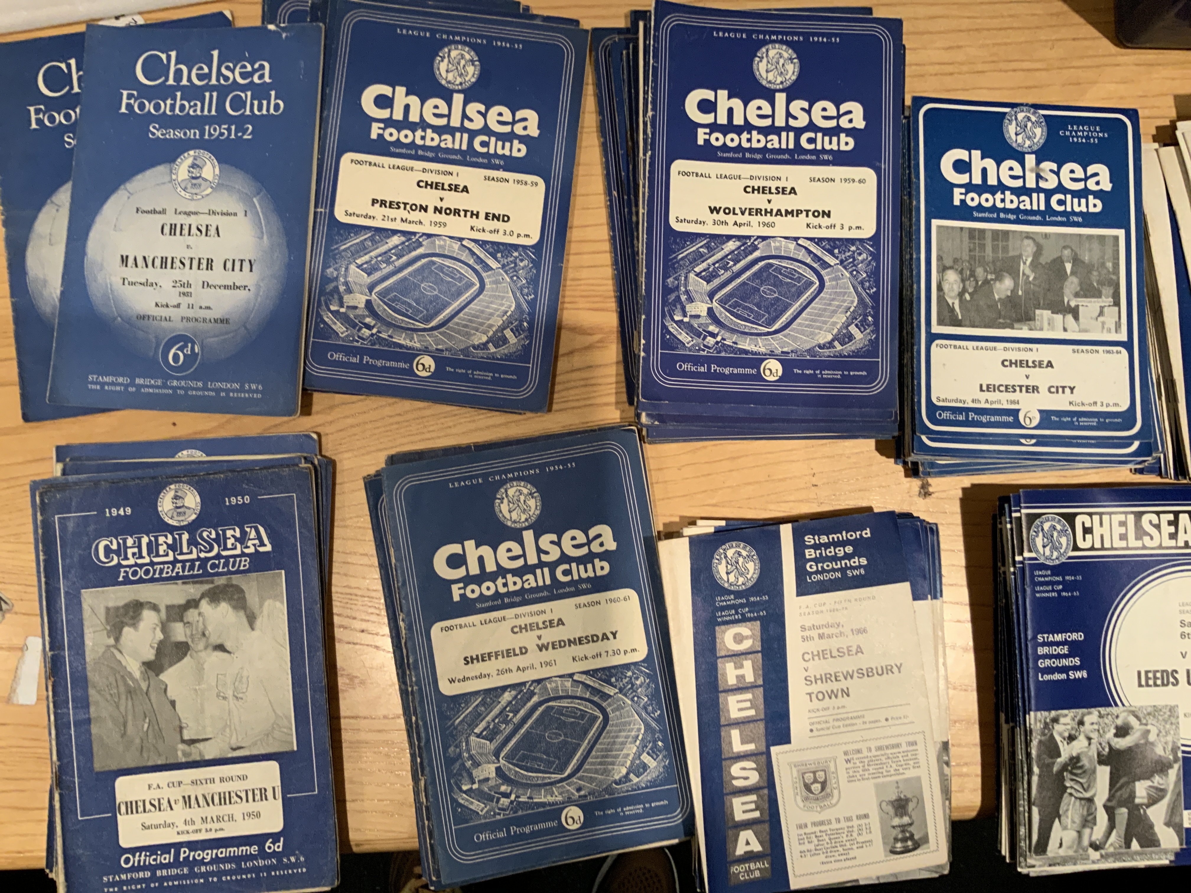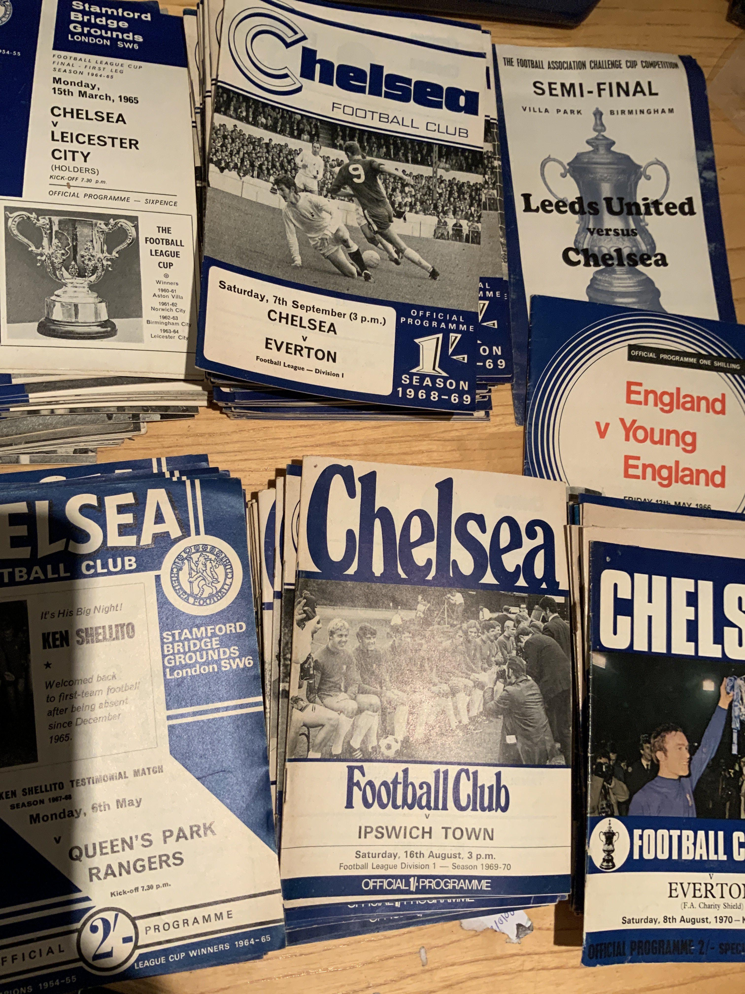 Chelsea Home Football Programmes: 45/46 Bournemouth v Walsall South Cup finals, Aston Villa, 46/47 x 11 including Manchester United, 47/48 x 23 including Hearts, Manchester United, 48/49 x 2, 49/50 x 15. From 58/59 to 70/71 there is a large quantity that must be nearly complete. Good condition.