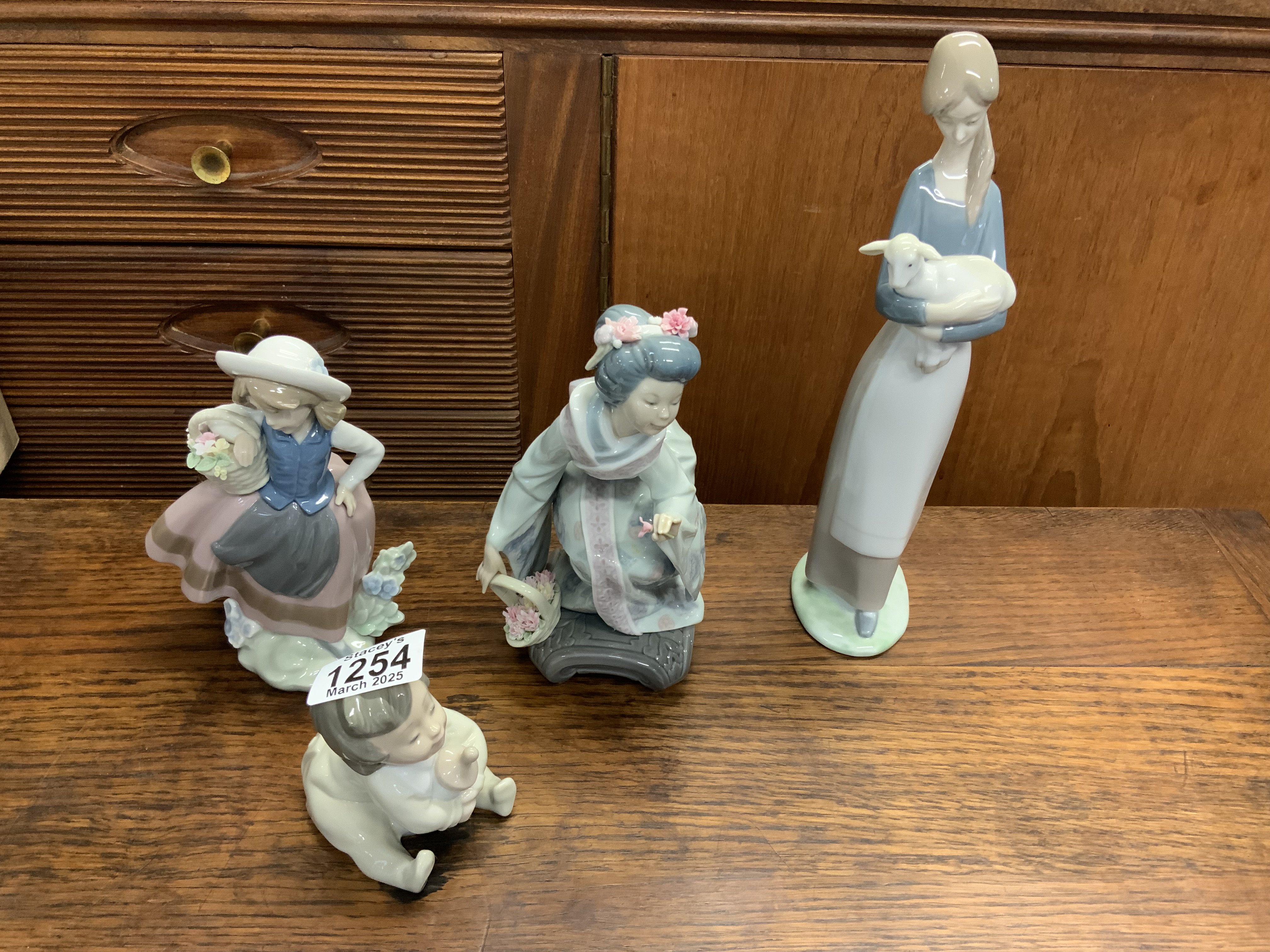 3 Lladro porcelain figures together with a small NAO baby figurine. (D)