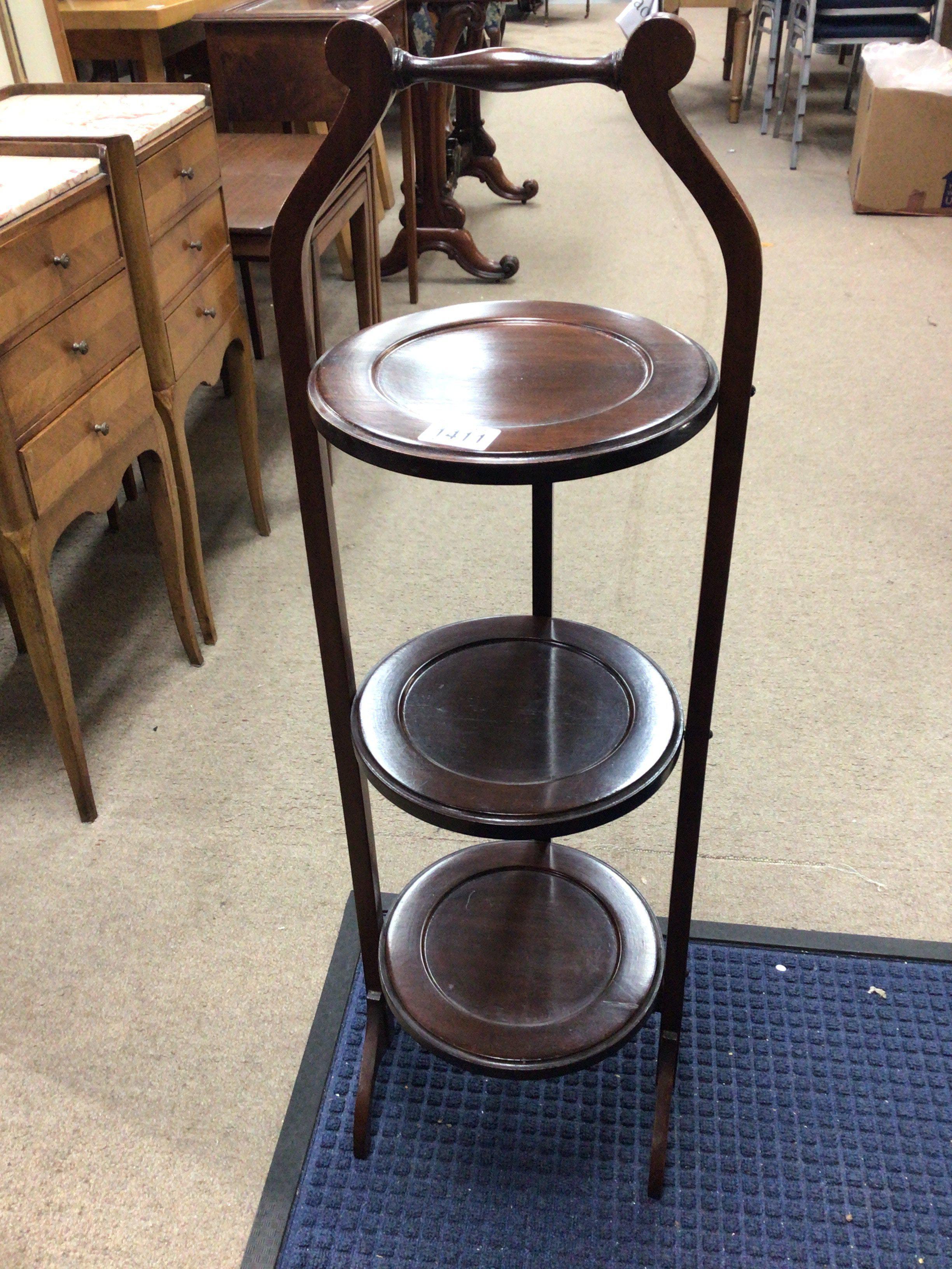 An Edwardian mahogany three tier cake stand shaped handle and folding round tiers.