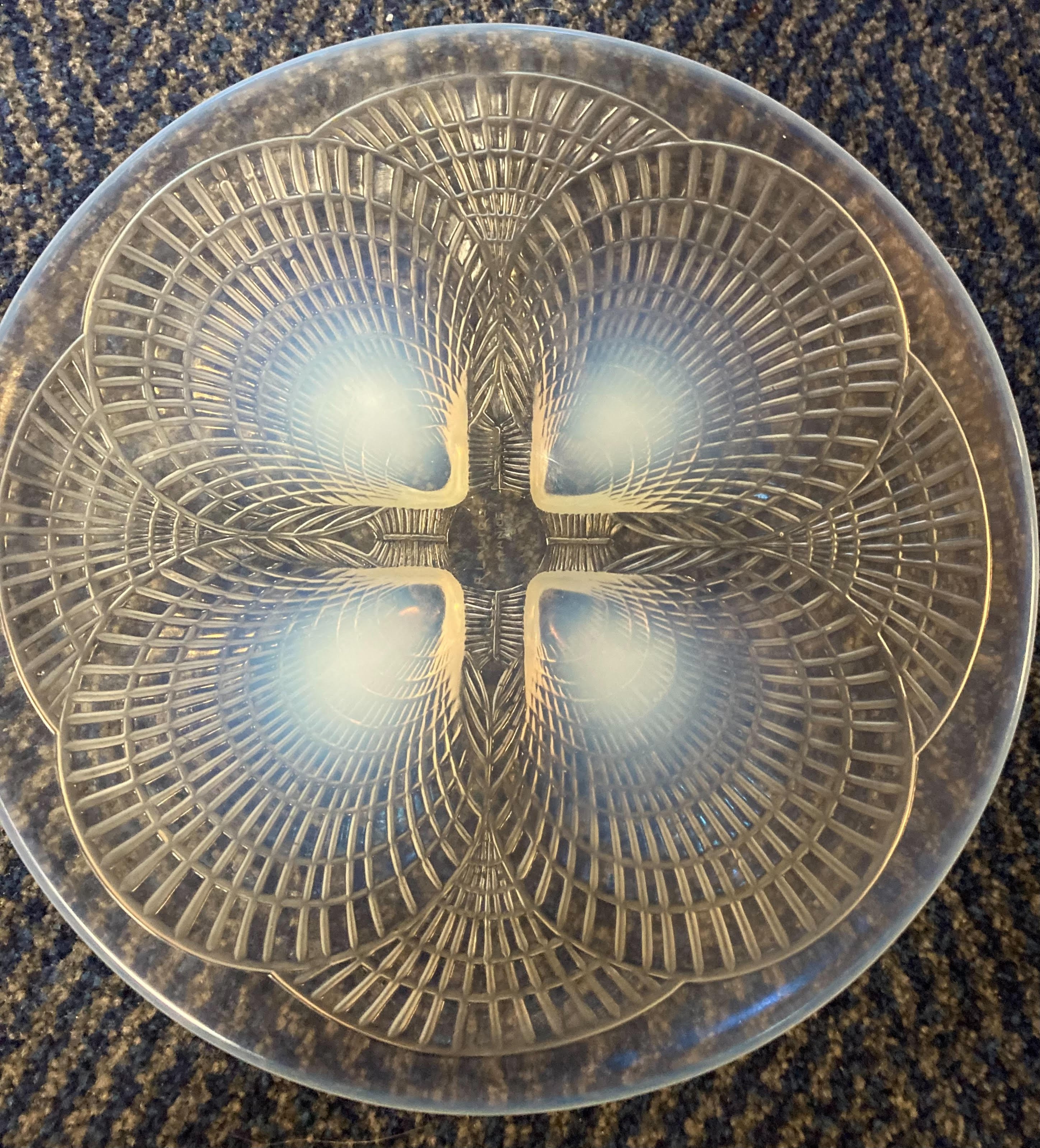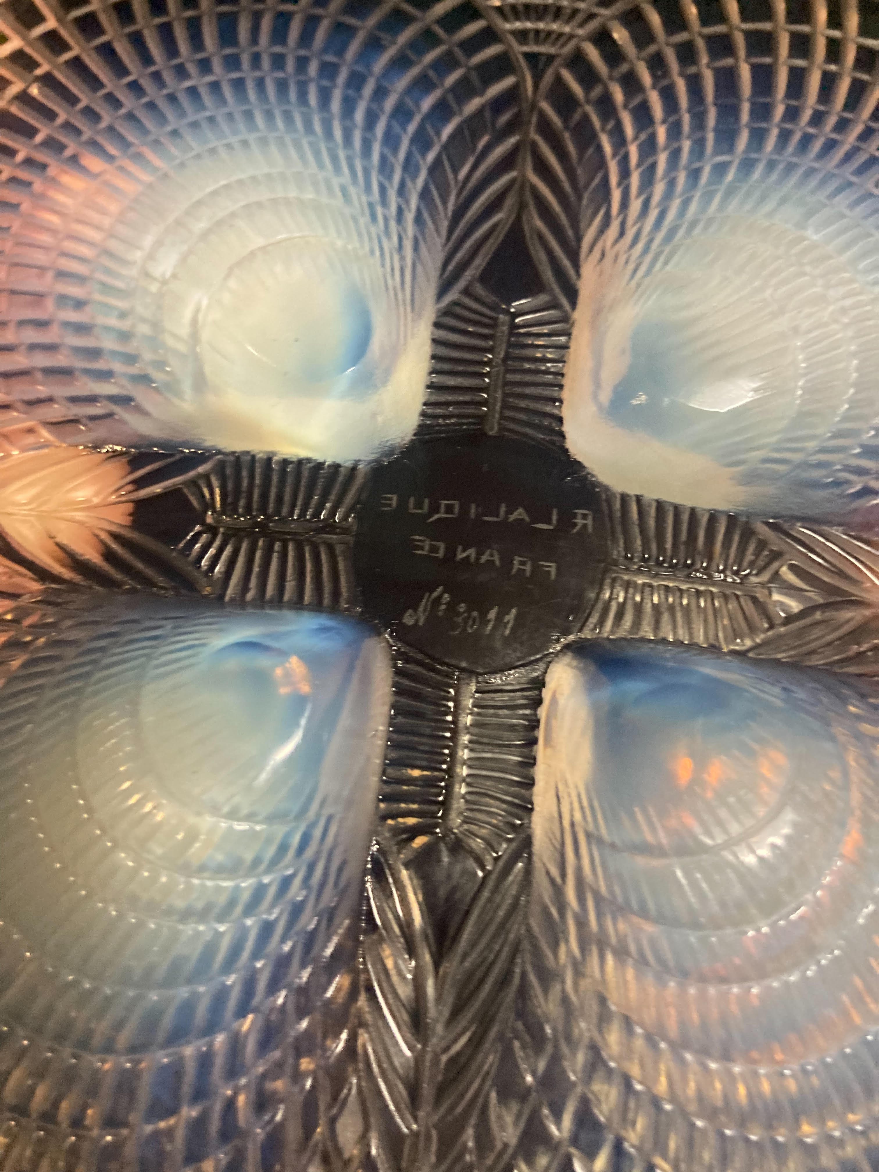 An R Lalique opalescent Coquilles pattern glass dish .
