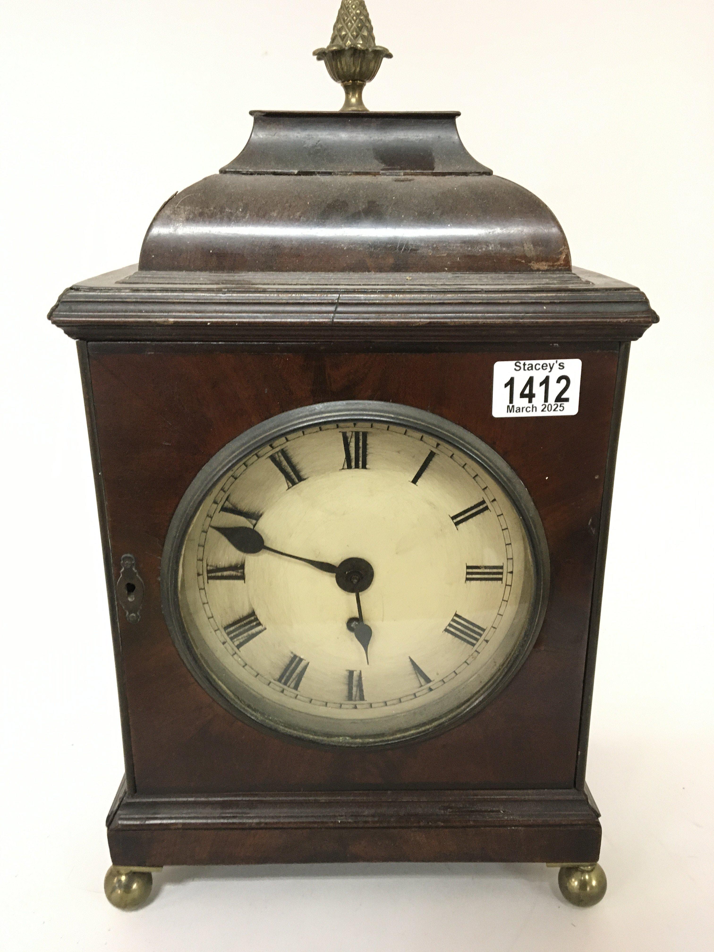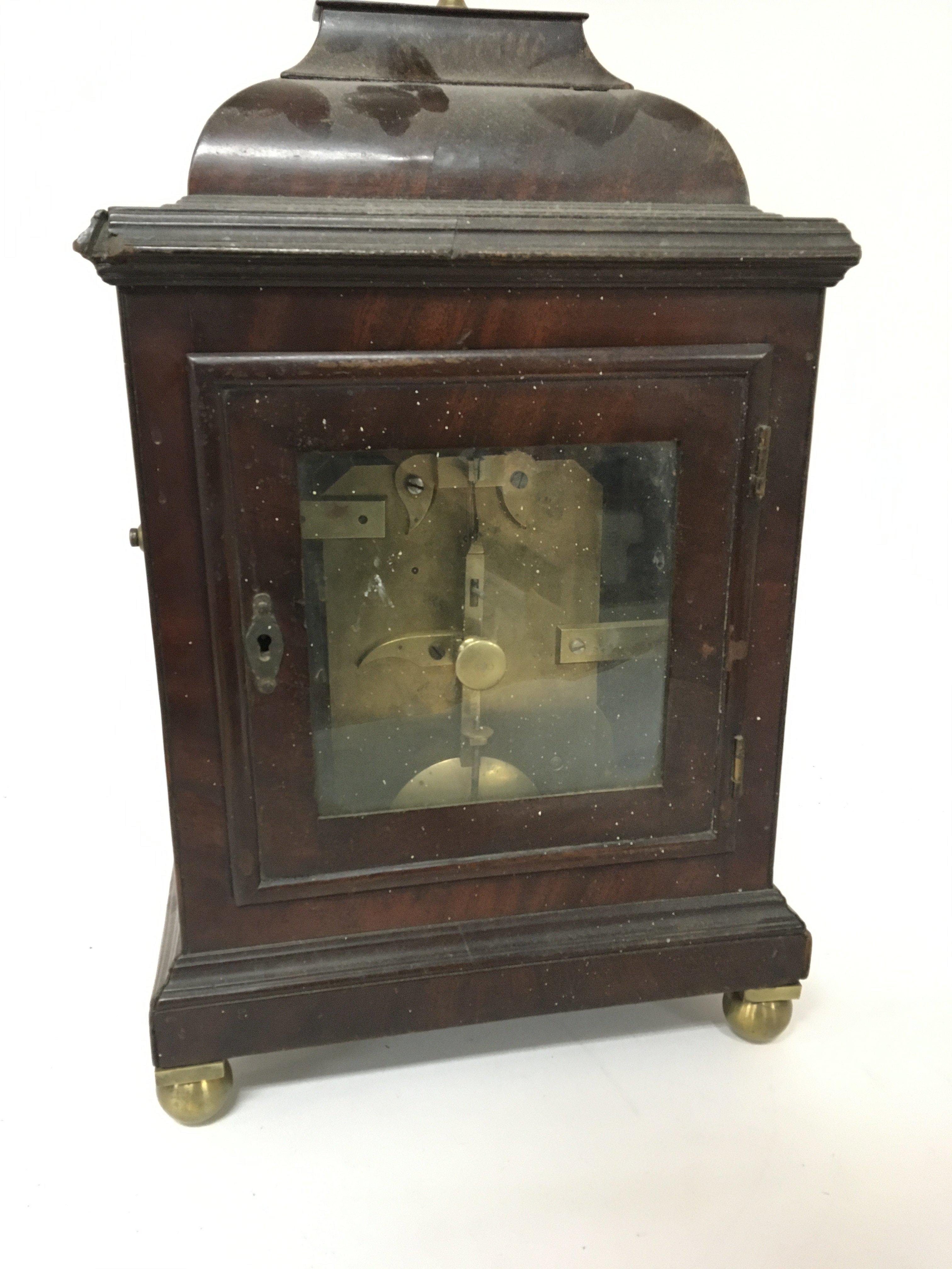 A George III mahogany bracket clock the case with a gilded metal stylised finial fitted with a single brass fusee movement. Hight 48cm Sold without reserve.