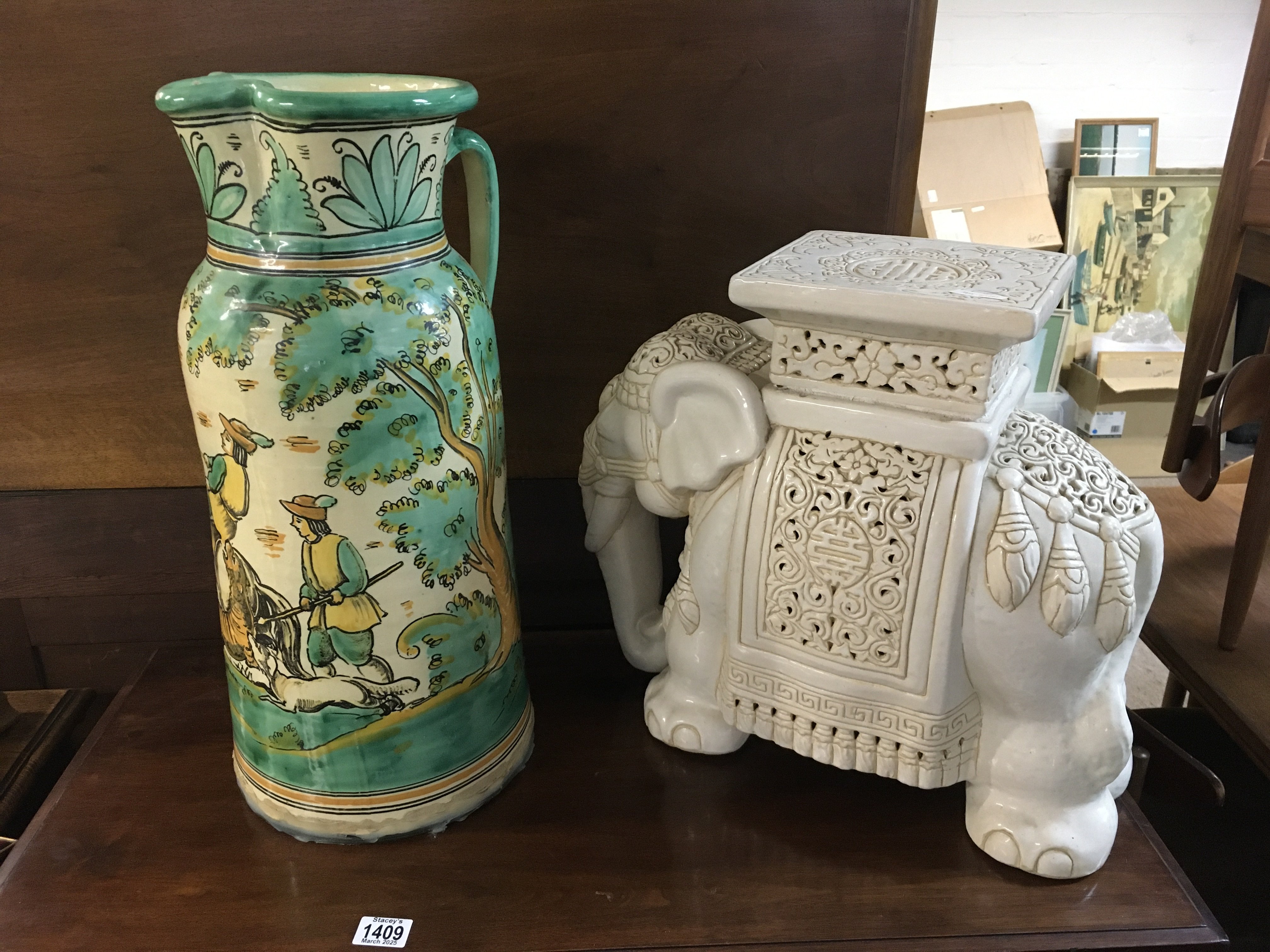 A ceramic elephant seat, a large continental ceramic jug and a wall plaque decorated with sailing ships.