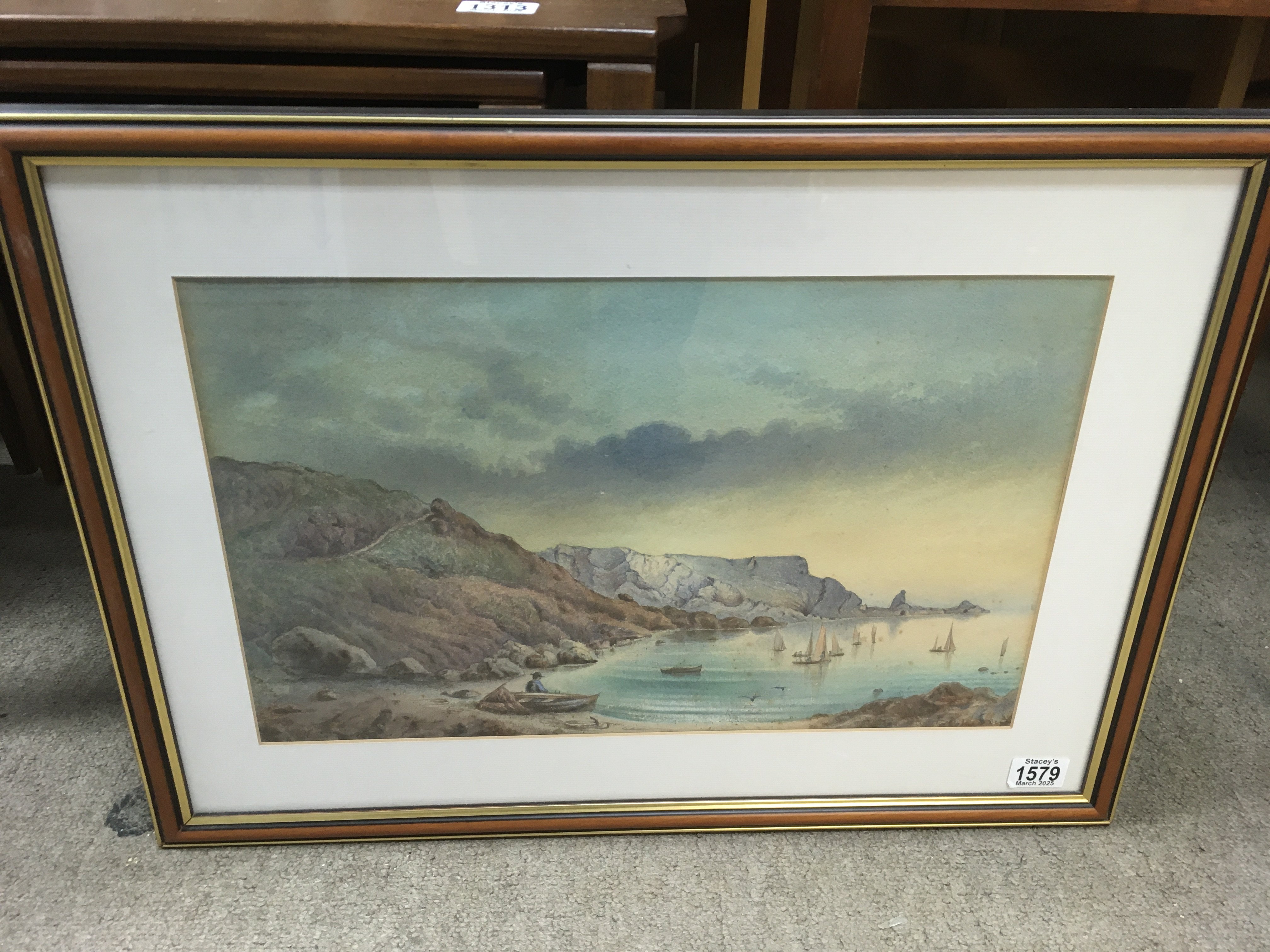 A framed gouache and watercolour study of a tug boat sun II and two coastal view paintings.