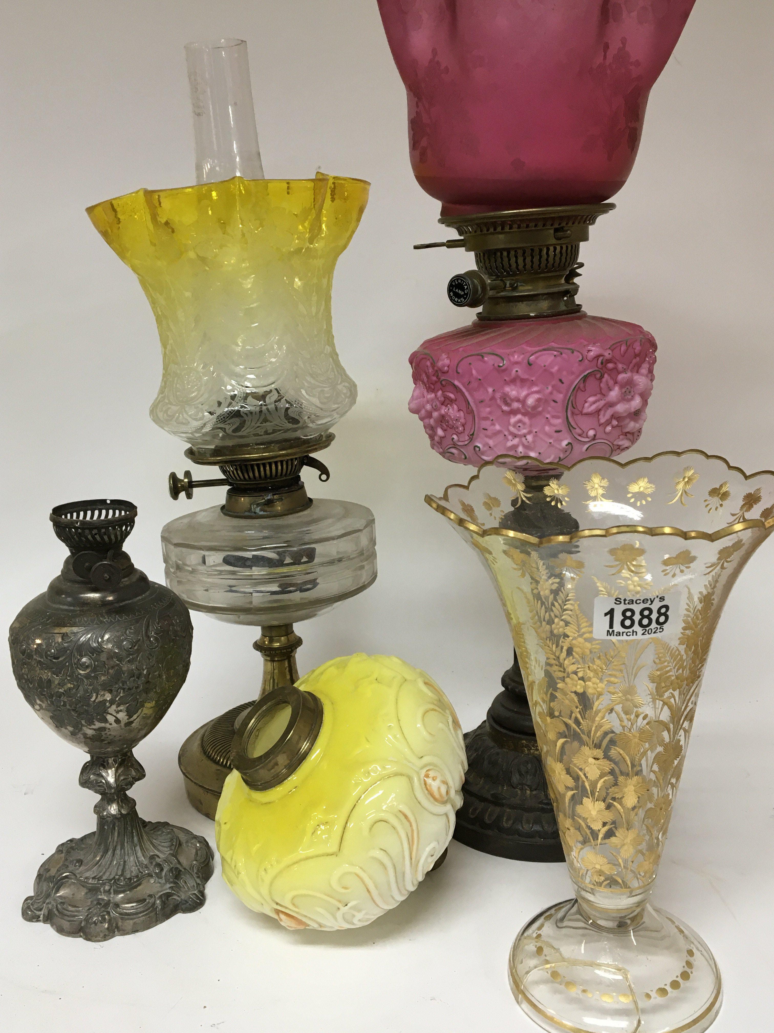 Victorian oil lamps and reservoirs including a nice fading yellow acid etched shade an acid etched cranberry shade and a vase decorated with applied gilt (damaged) and other associated oddments.